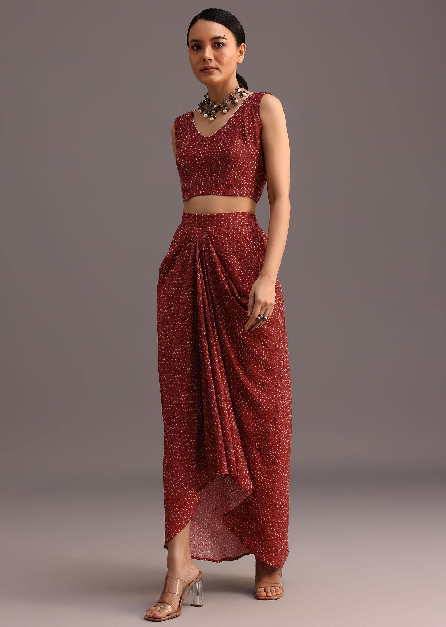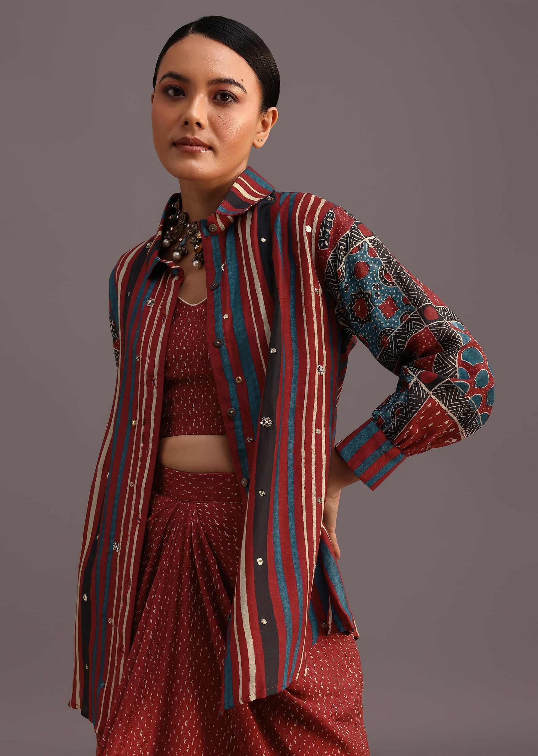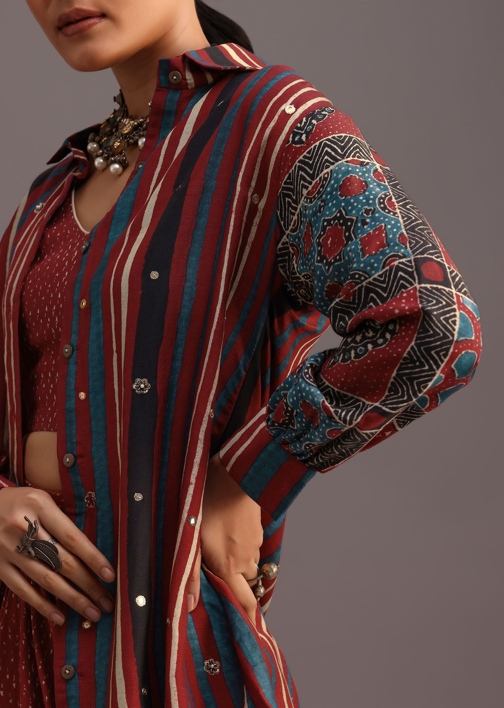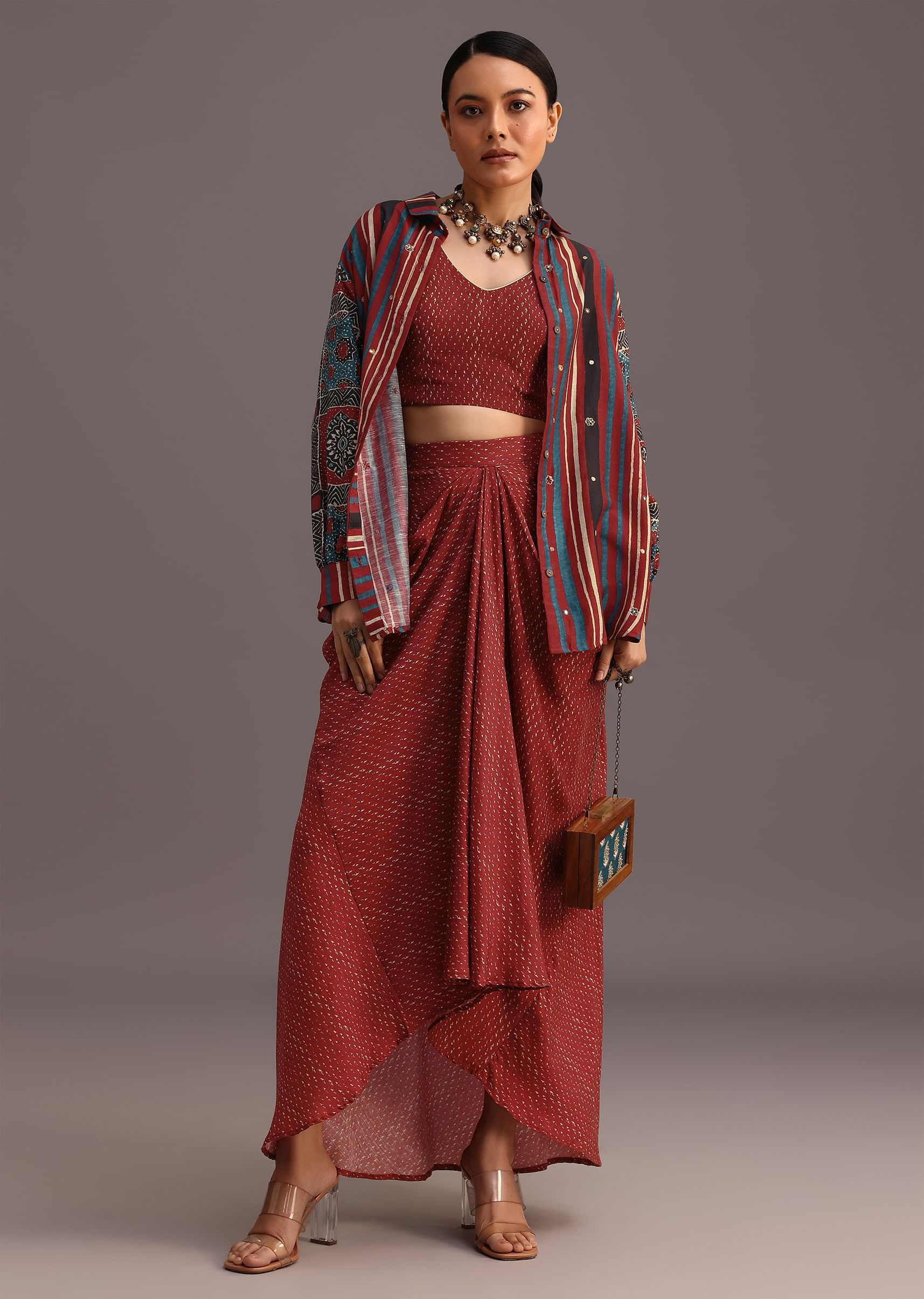 Red Ajrakh Printed Shirt And Croptop With Draped Skirt