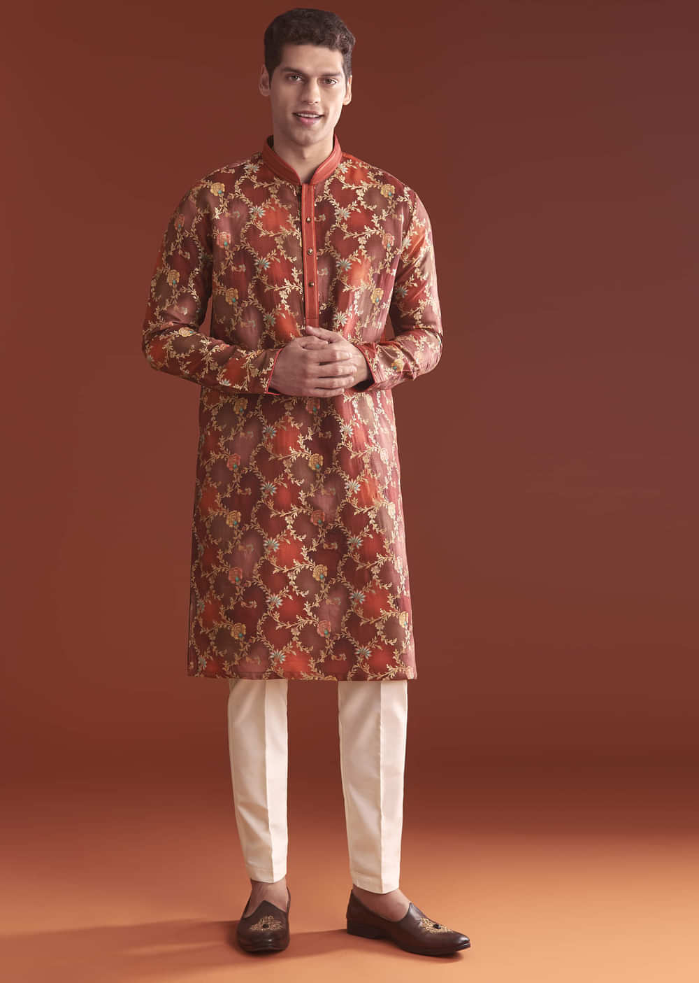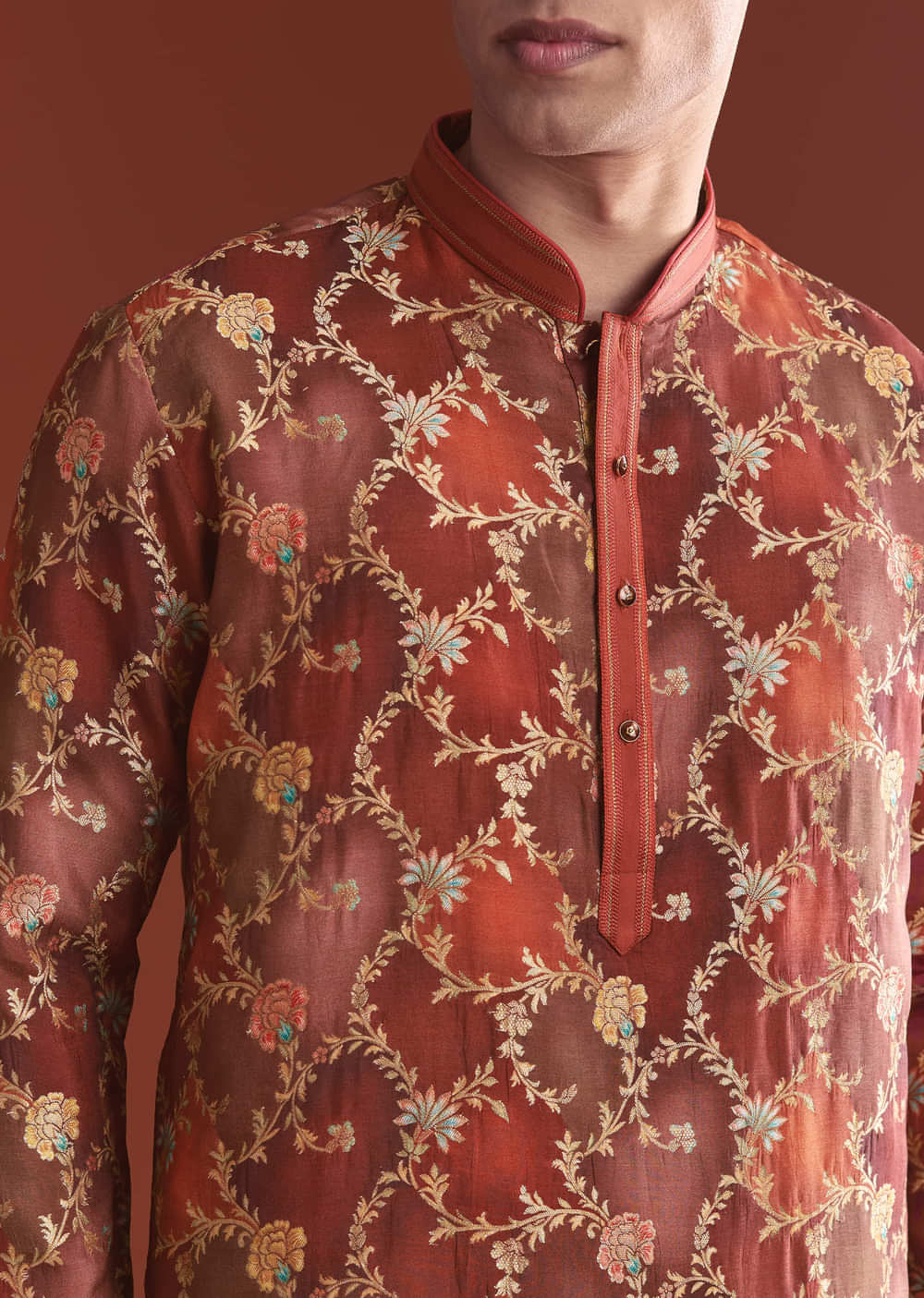 Red Banarasi Kurta Set For Men With Floral Pattern