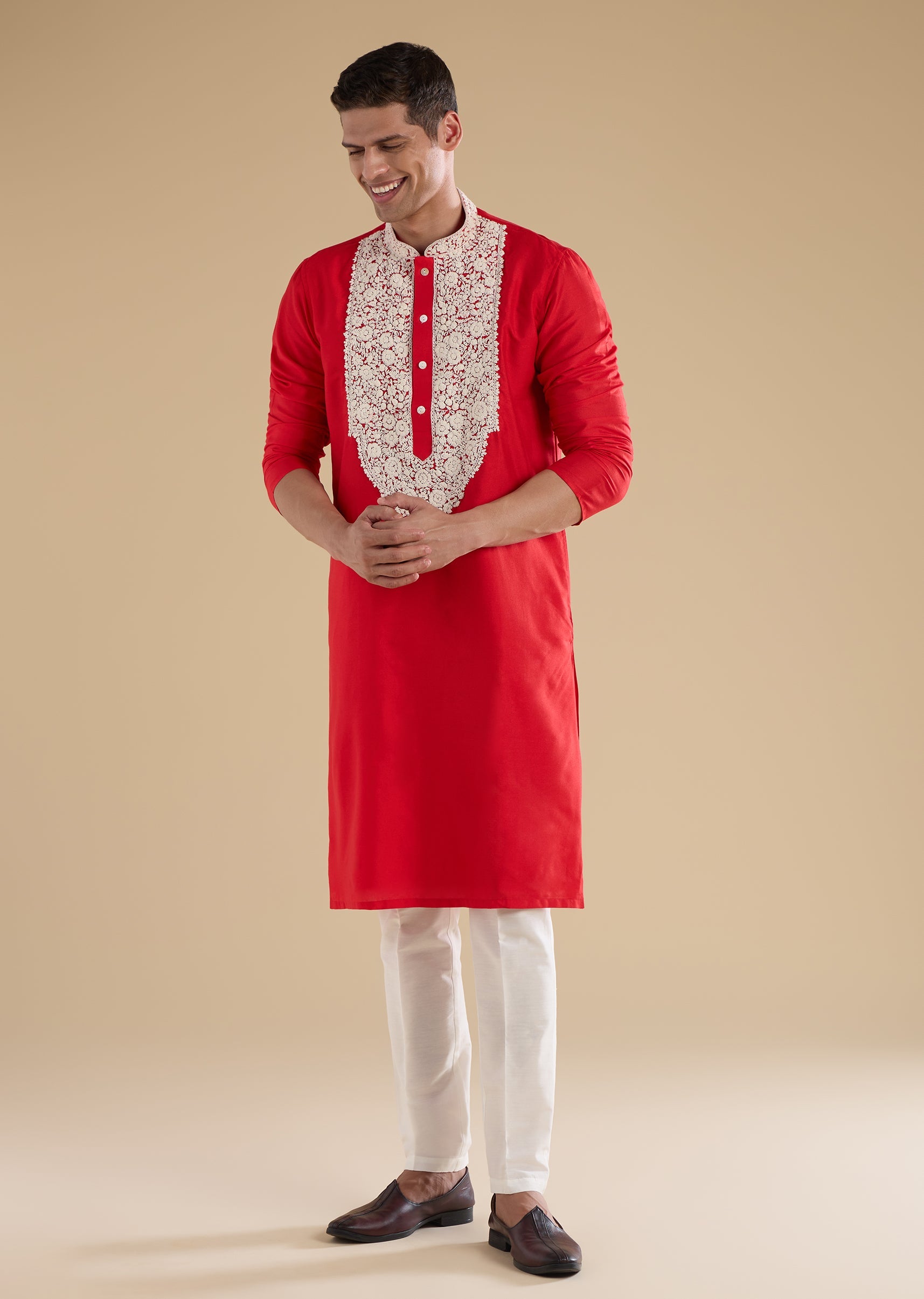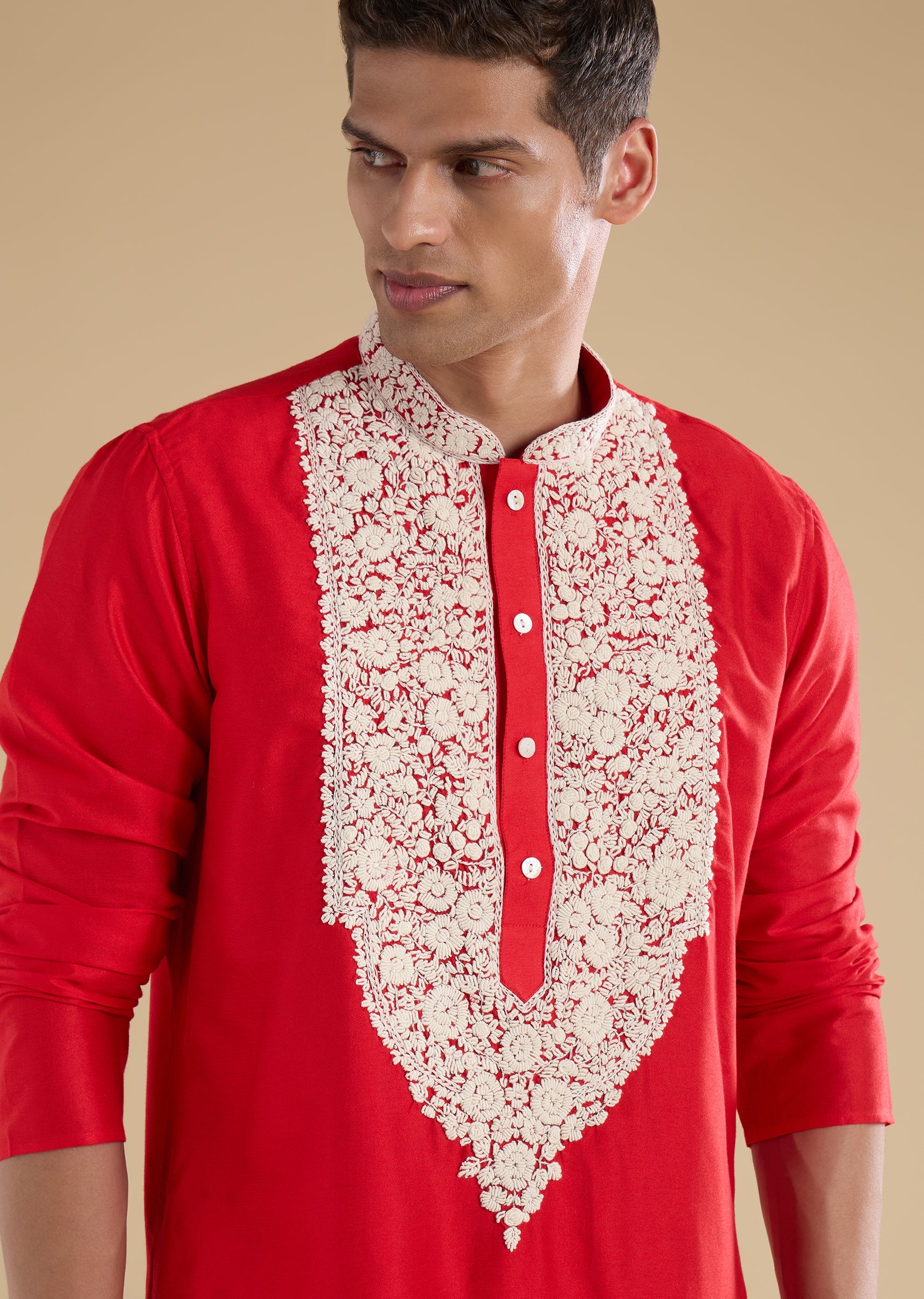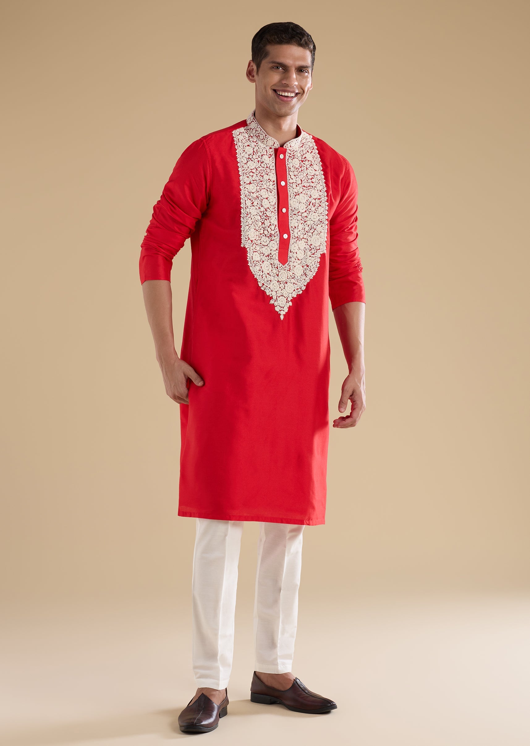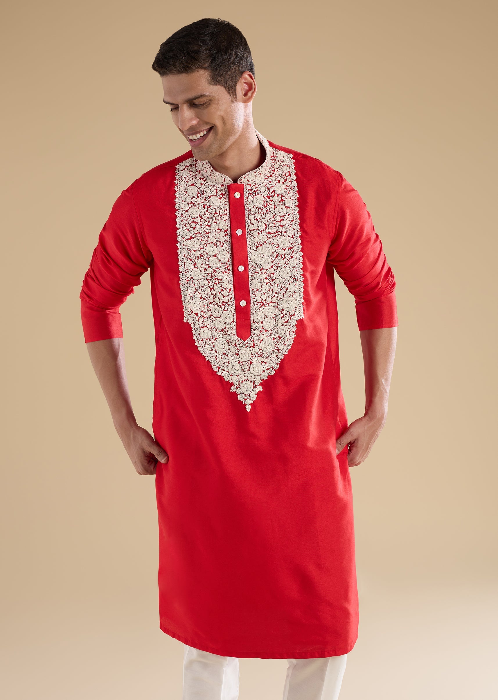 Richly traditional with intricate craftsmanship, this red kurta set is crafted in luxurious Banarasi silk for a festive, ceremonial appeal. The kurta features a mandarin collar, full sleeves, and side slits, highlighted with Kashmiri hand embroidery detailed with fine resham thread work for a refined finish. Paired with straight-fit trousers and a partially elasticated waist, this ensemble is ideal for poojas, festive gatherings, and wedding celebrations. Awarded as the Most Trusted Brand, we're delivering styles you love, just as promised.