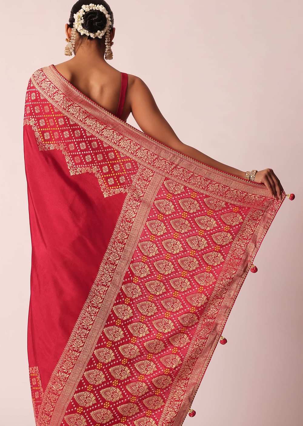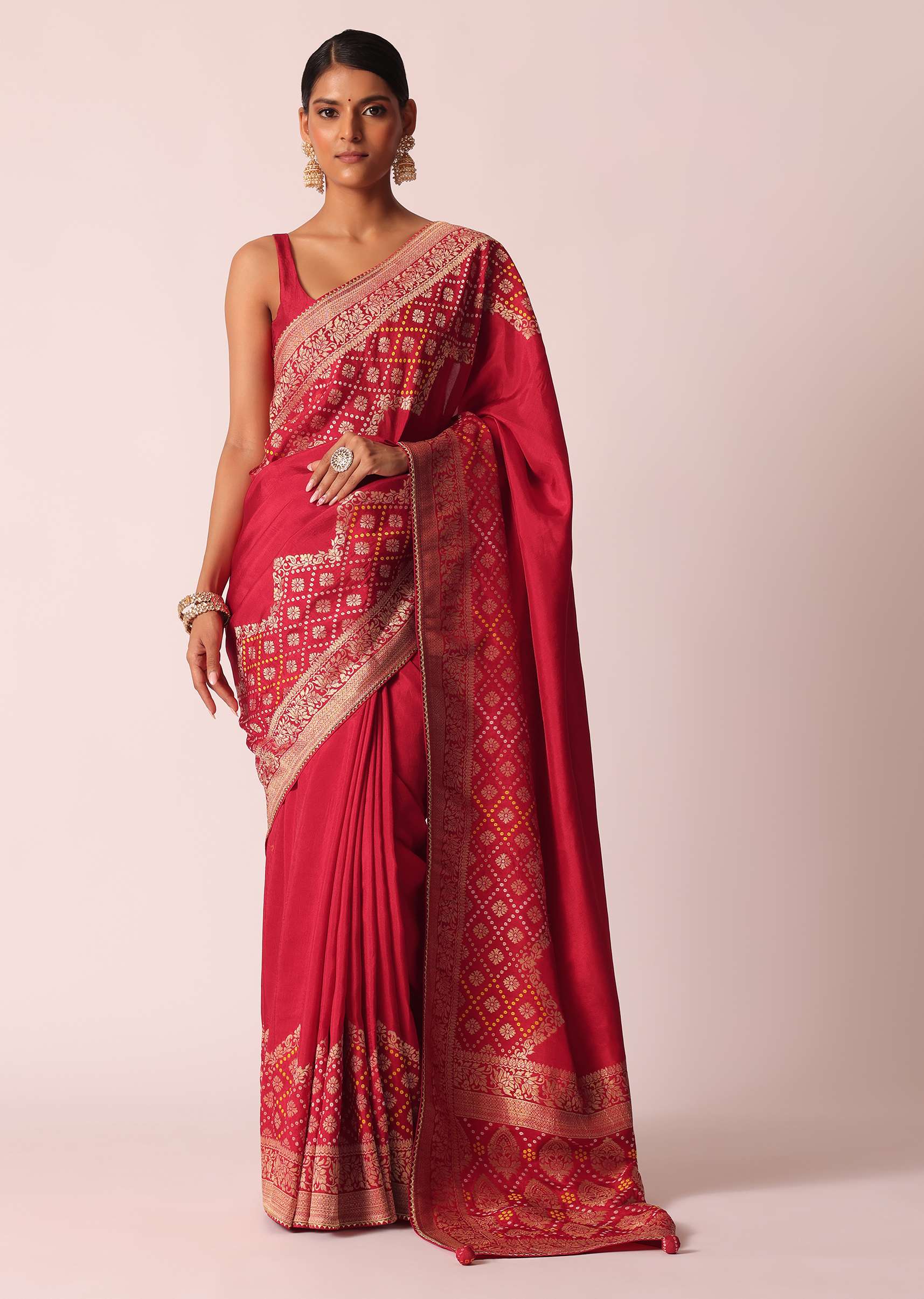 - Meticulously crafted on a vibrant hue, it comes with traditional Bandhani detailing and exquisite woven motifs.