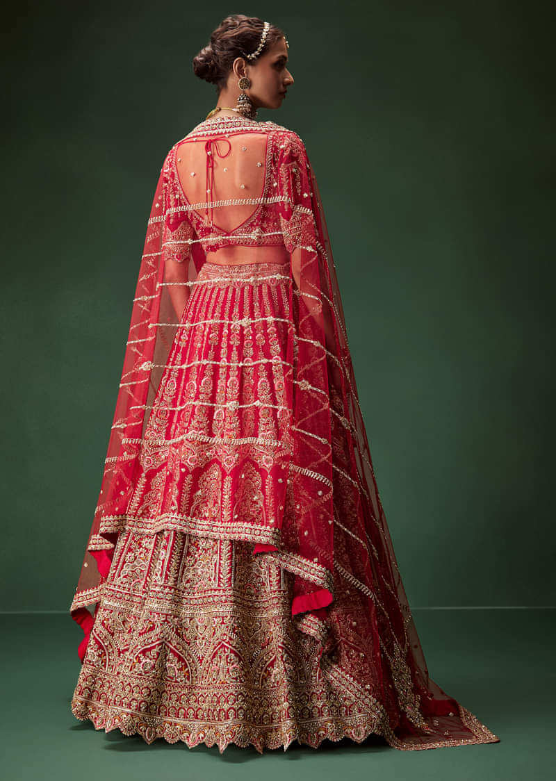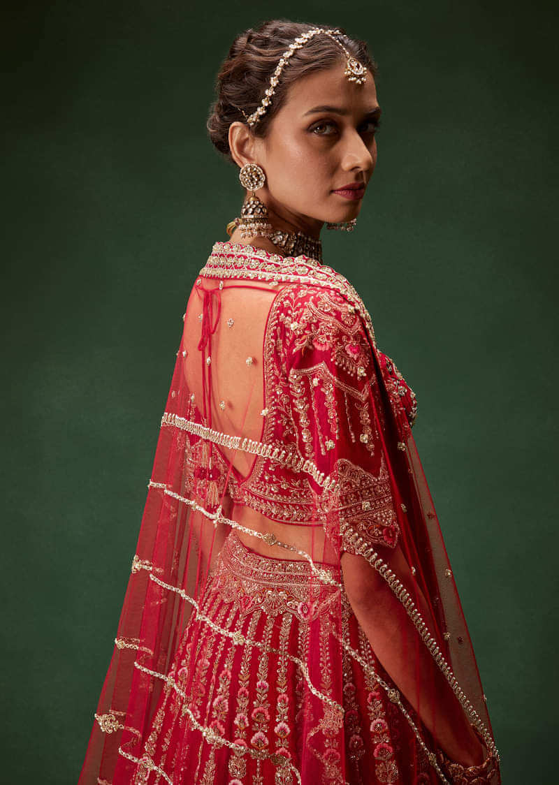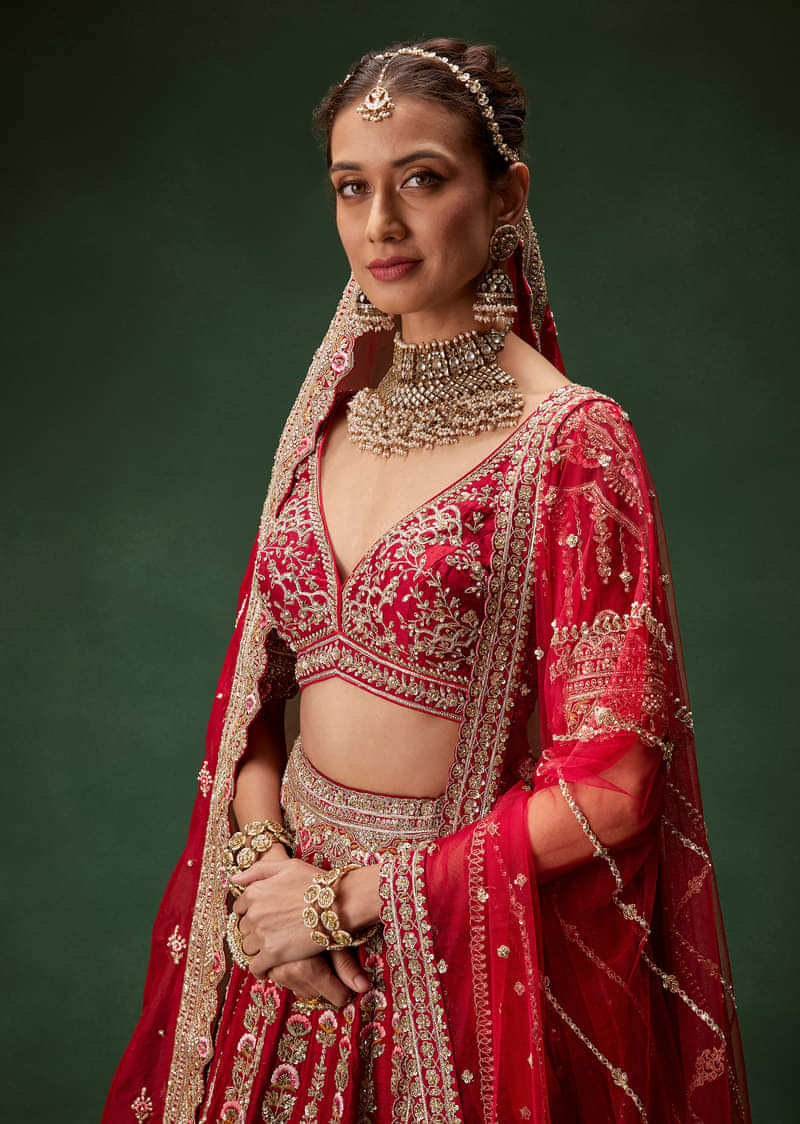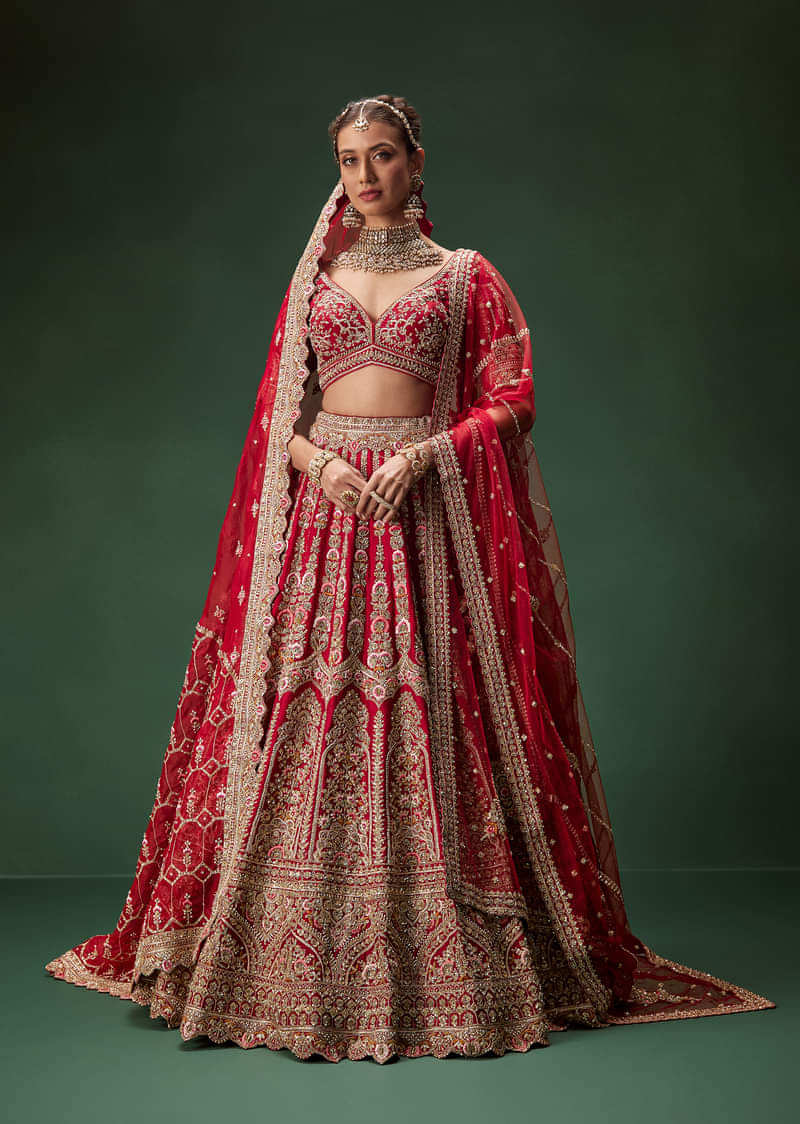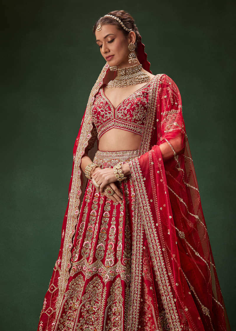 Red Bridal Lehenga With Intricate Hand Embroidery And Double Dupatta Drape