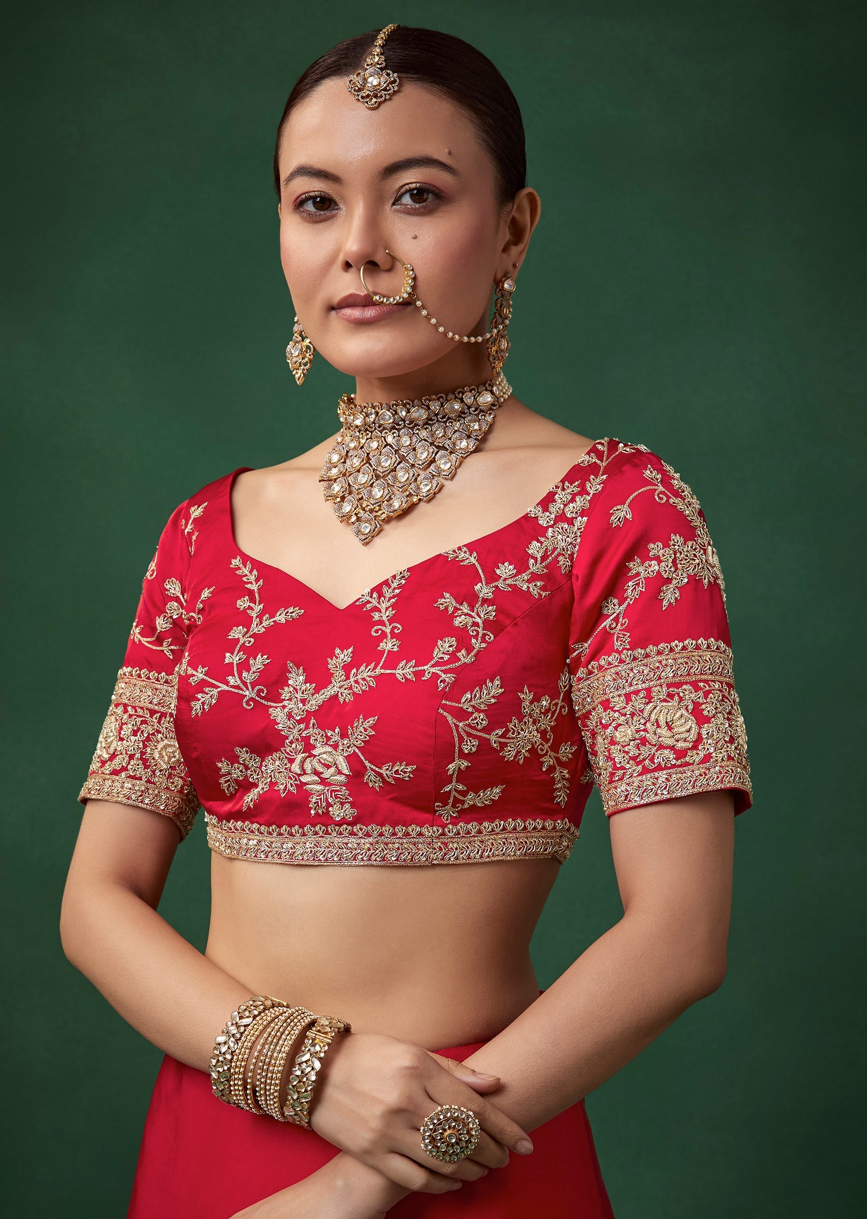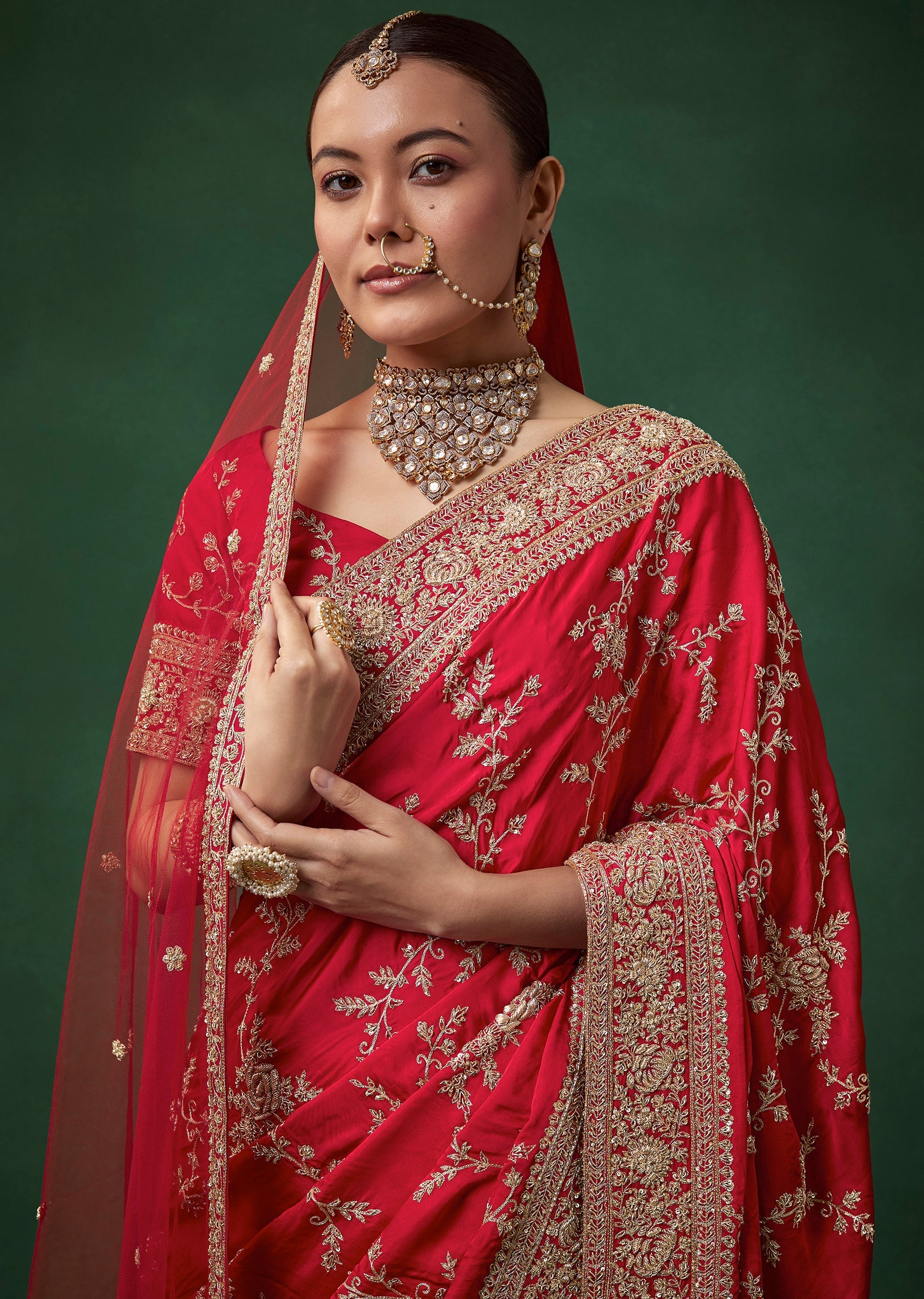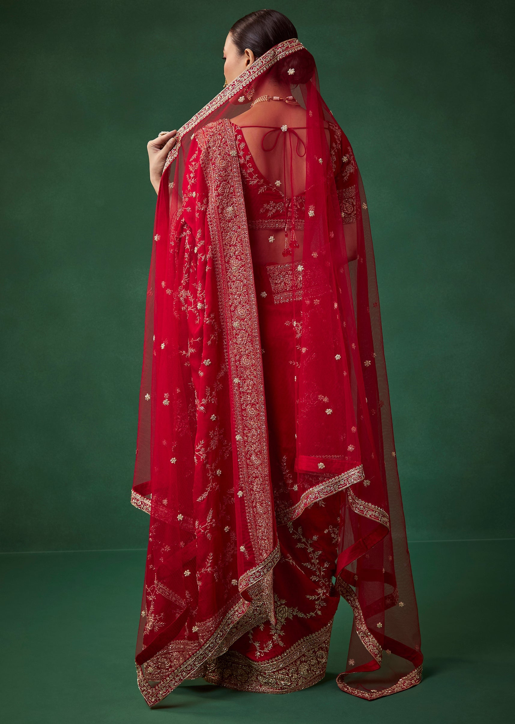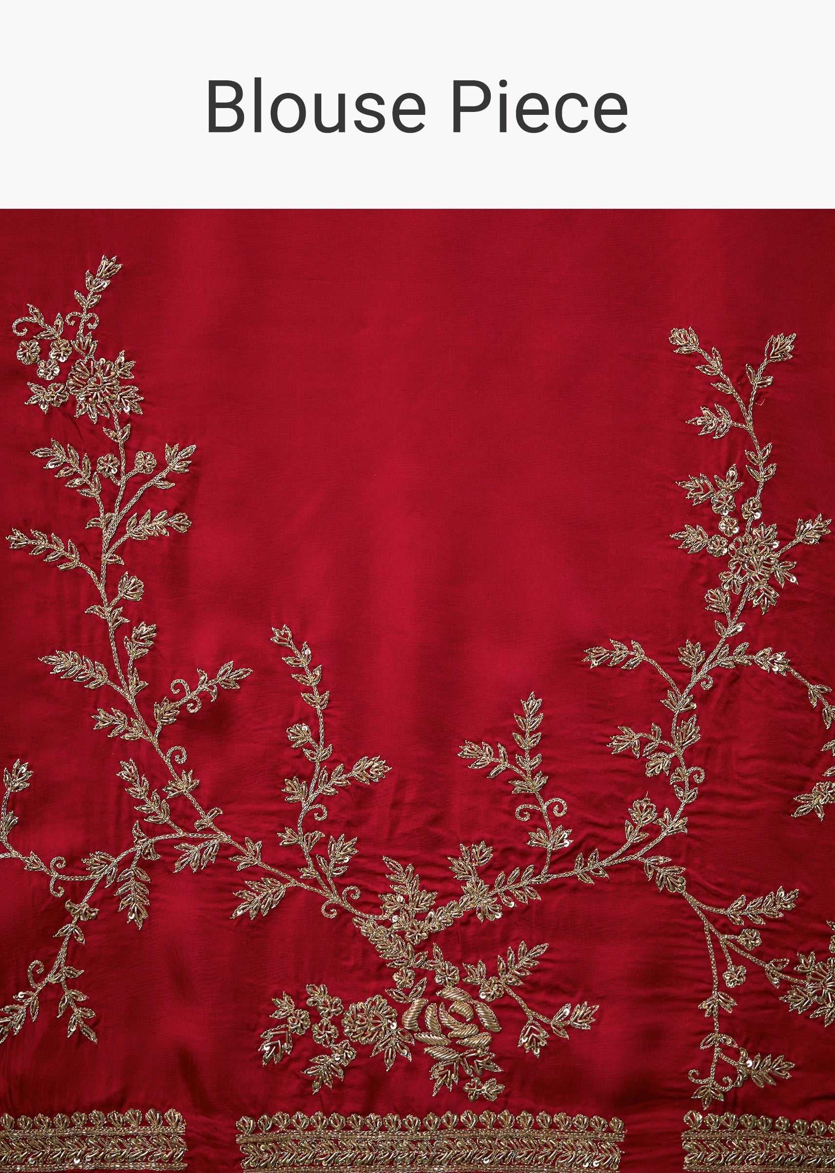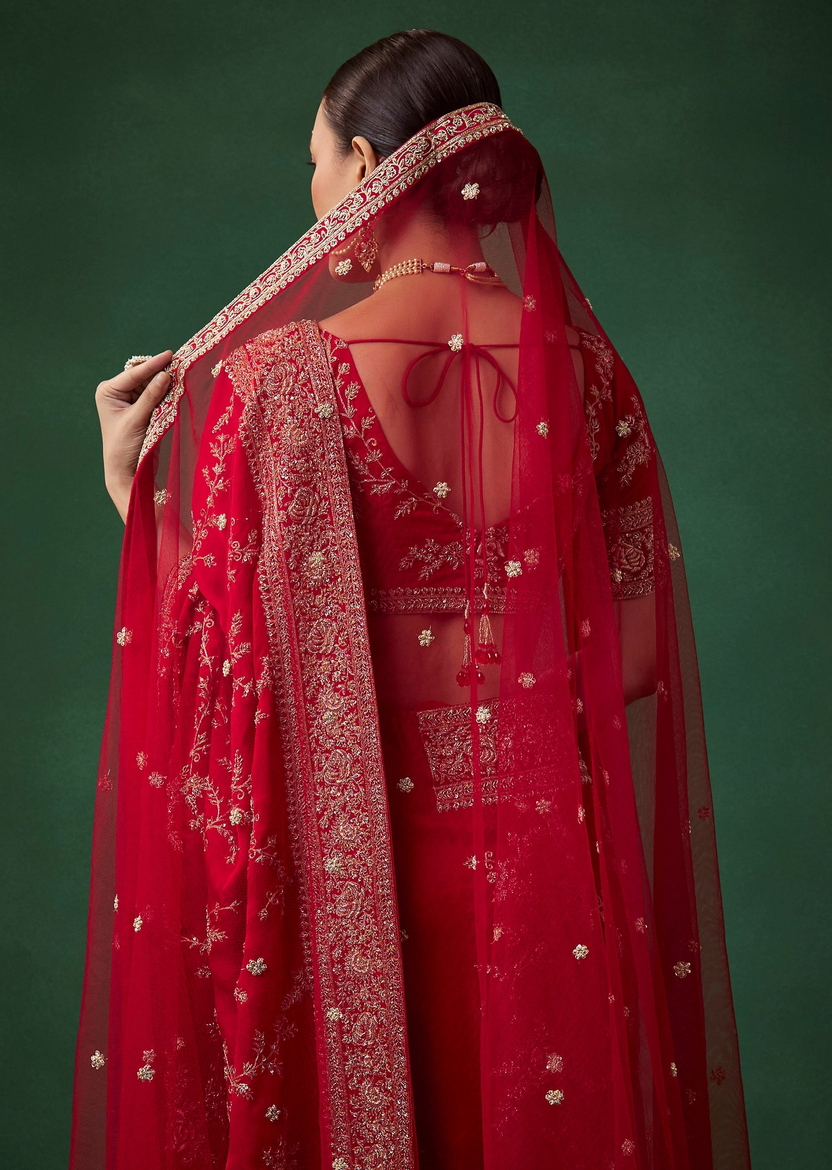 Make a regal bridal statement with this heavily embroidered soft silk saree, designed in a striking red and embellished with rich floral jaal work crafted using zardosi, cut dana, sequins,... More Product Details