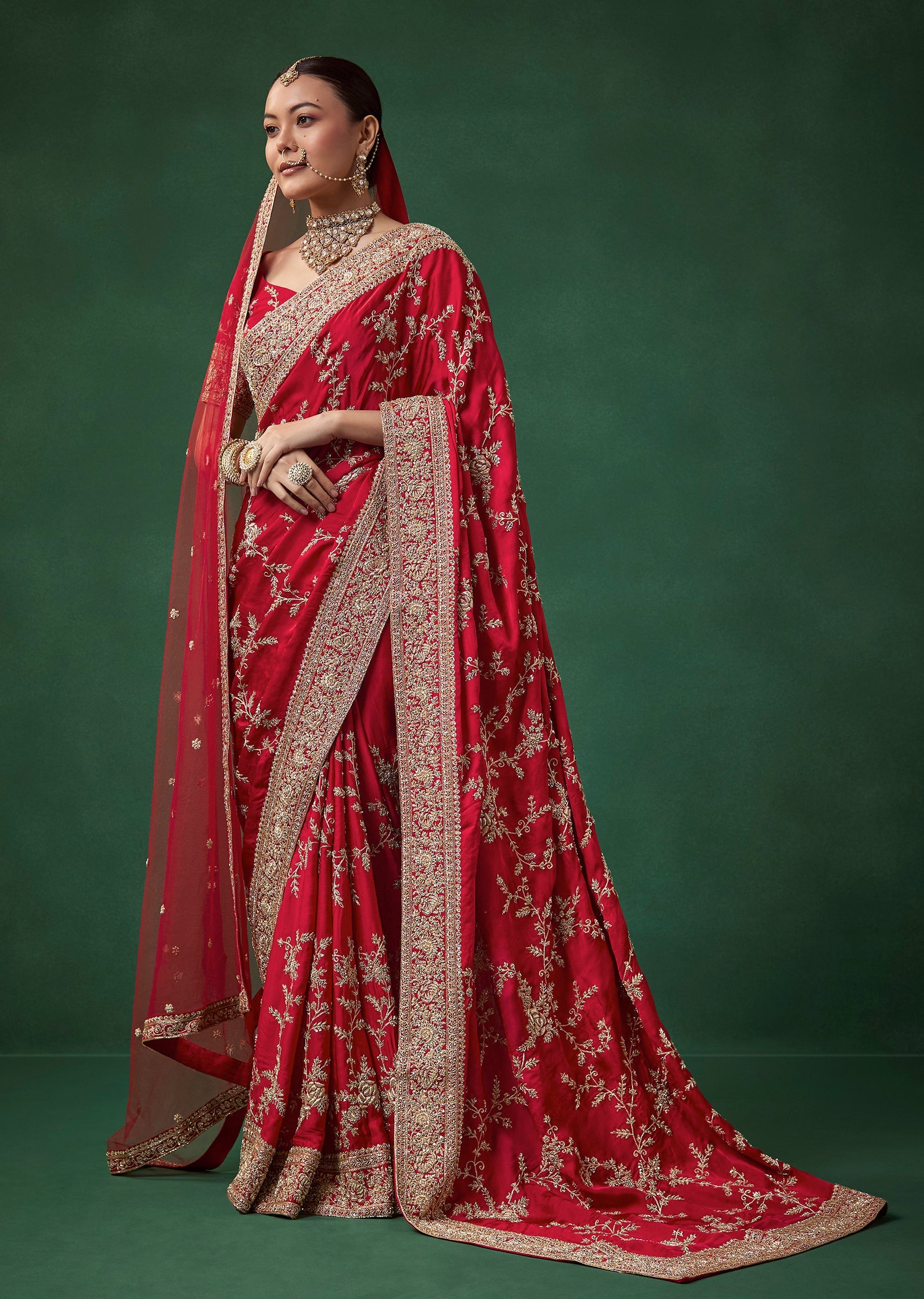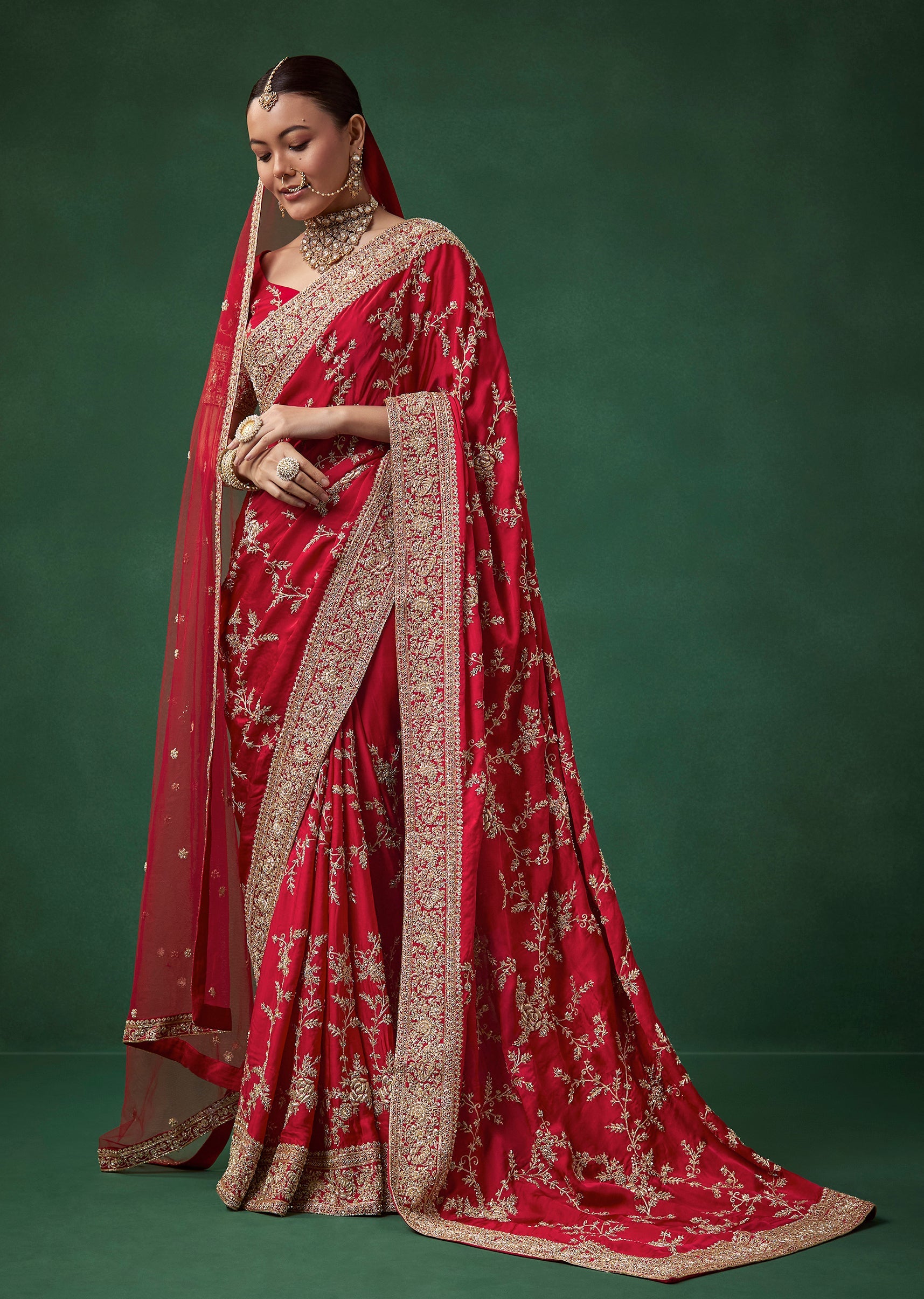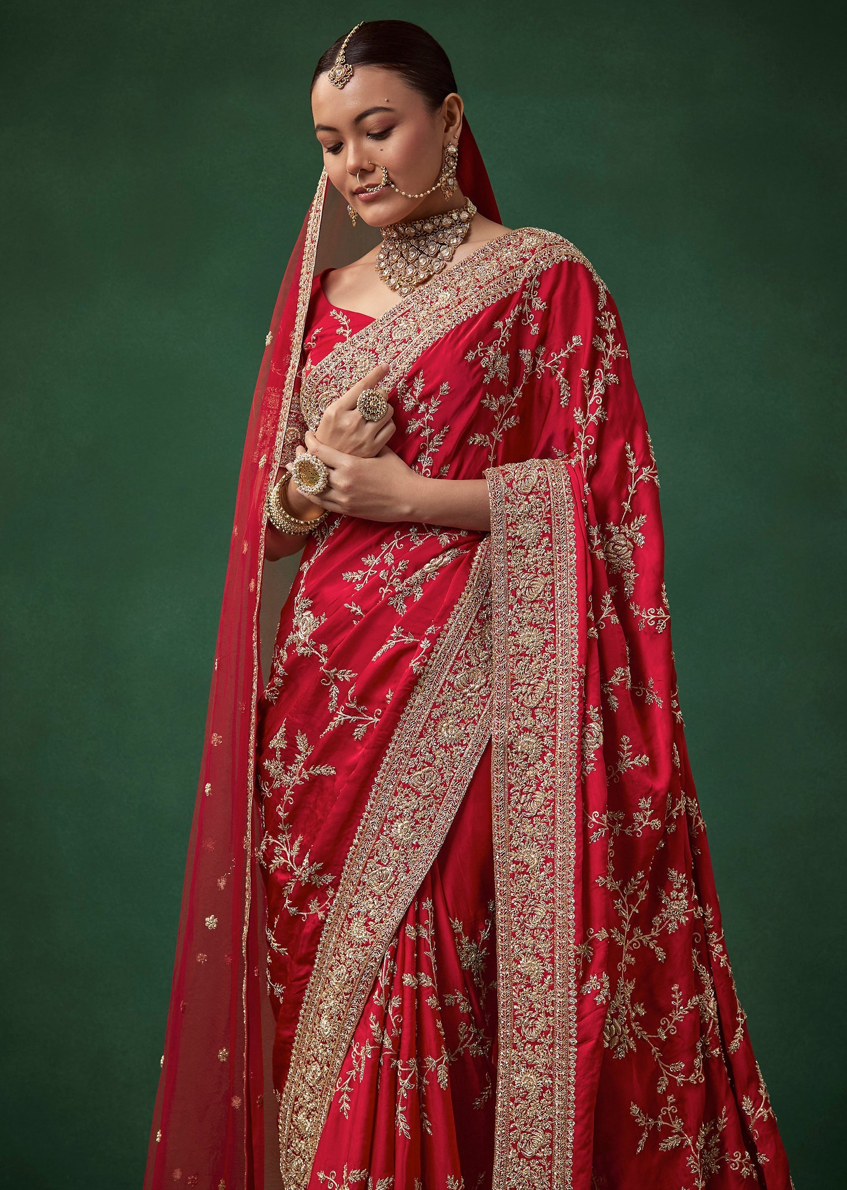 Make a regal bridal statement with this heavily embroidered soft silk saree, designed in a striking red and embellished with rich floral jaal work crafted using zardosi, cut dana, sequins, and zari for a breathtaking finish. The ornate border enhances its opulent appeal, while the accompanying heavily embroidered blouse fabric and matching dupatta complete the ensemble with traditional grandeur. The set includes one saree, one unstitched blouse fabric, and one dupatta, making it perfect for weddings and ceremonial celebrations. Awarded as the Most Trusted Brand, we're delivering styles you love, just as promised.