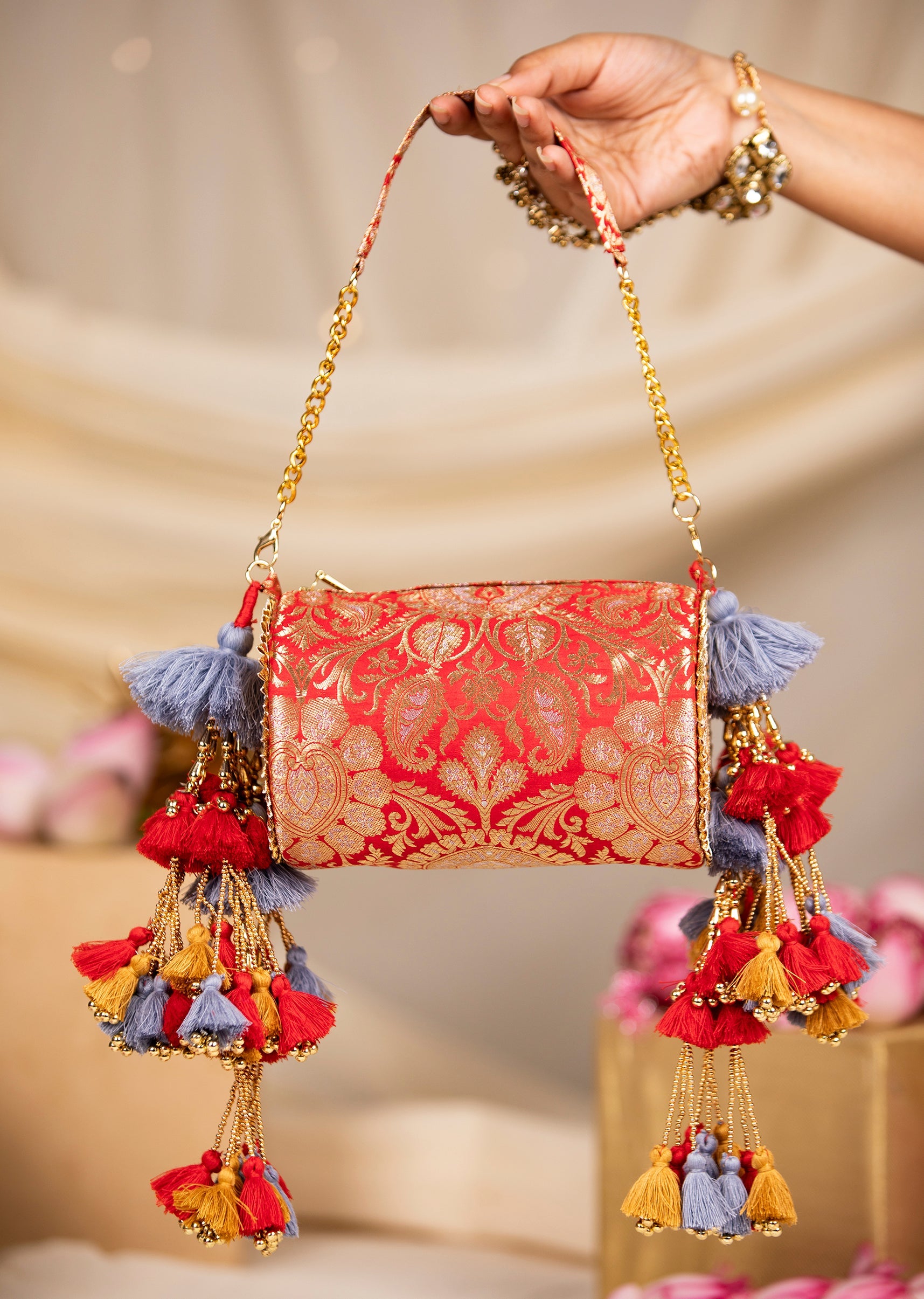 Add a regal touch to your celebration look with this red brocade bag, detailed with intricate golden motifs that exude rich traditional charm. The zari work, embellishments, and playful tassels create a luxurious mix of texture and movement, perfect for weddings and festive occasions. Lightweight and vibrant, it’s the ideal finishing touch for any ethnic ensemble. Awarded as the Most Trusted Brand, we're delivering styles you love, just as promised.