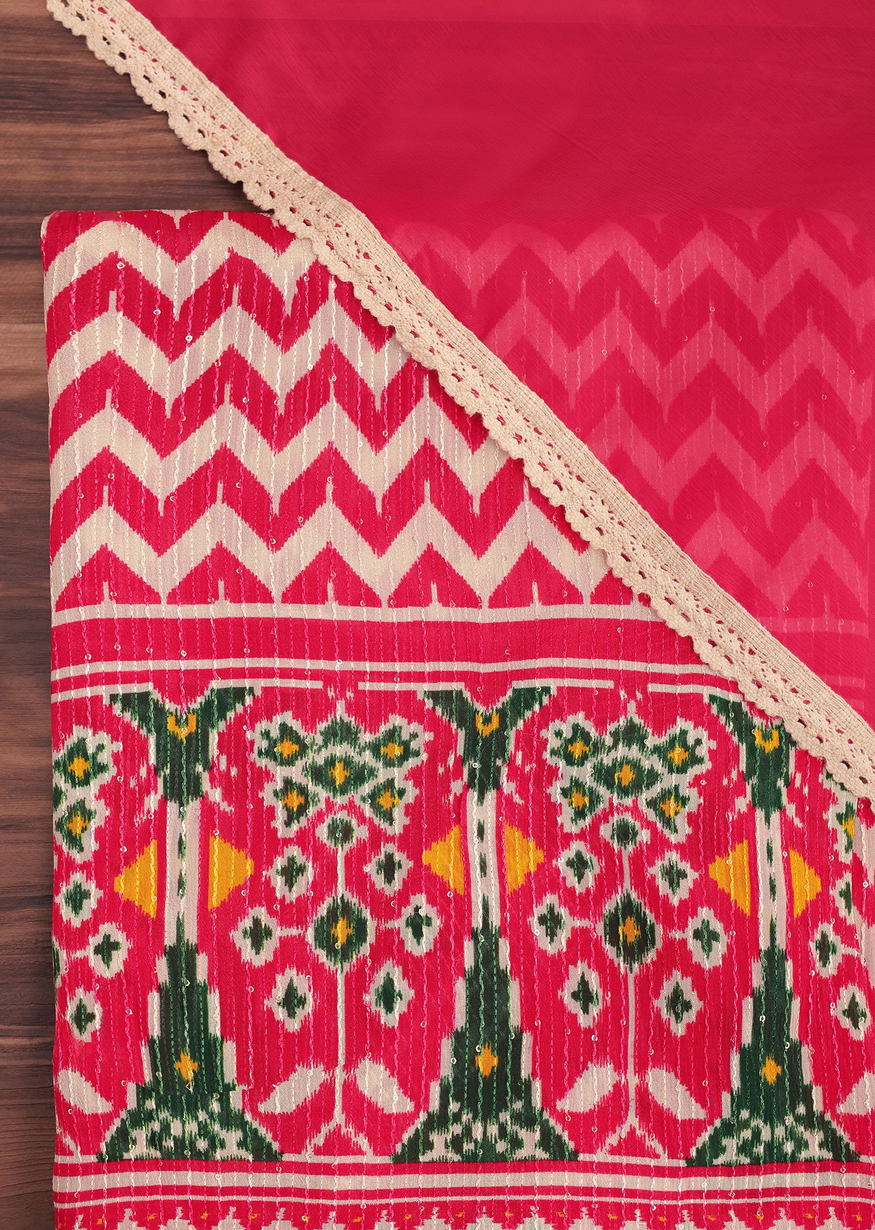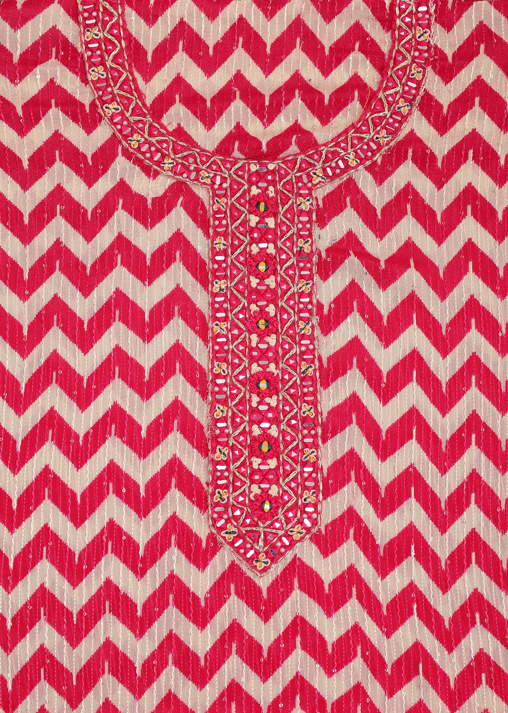 - This stunning set is fashioned from premium georgette fabric and embellished with a captivating chevron print, intricate mirror work, and delicate resham embroidery.