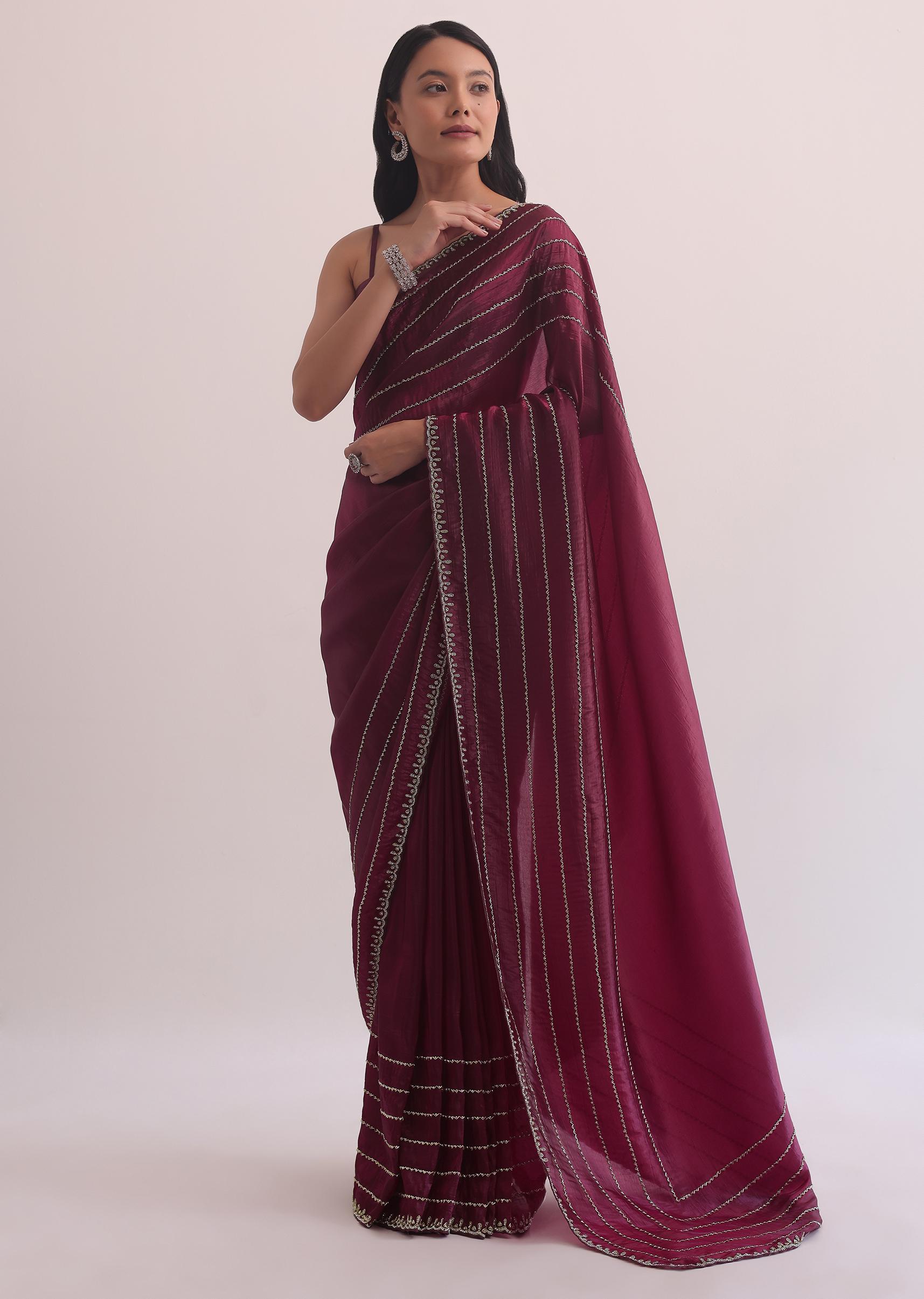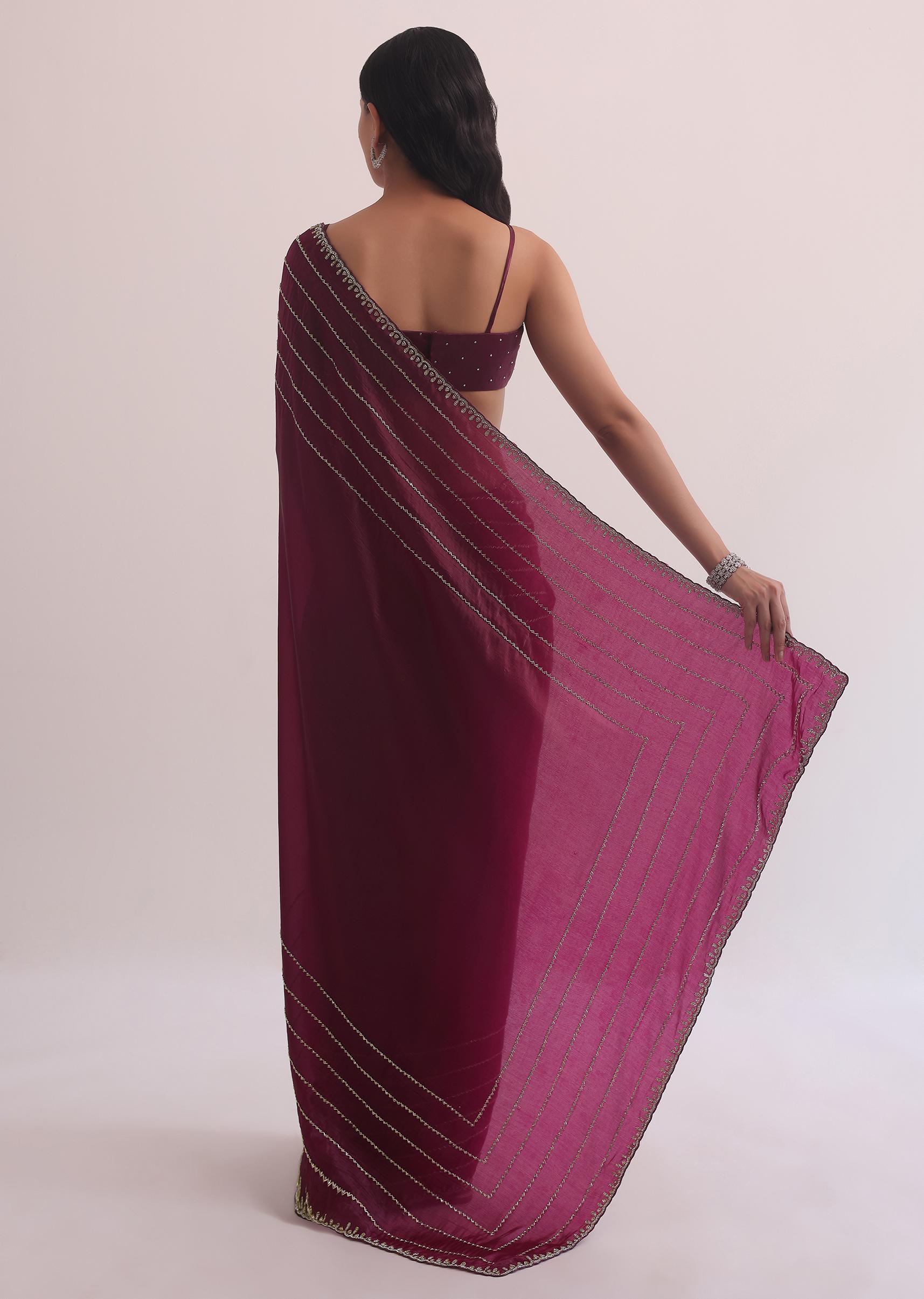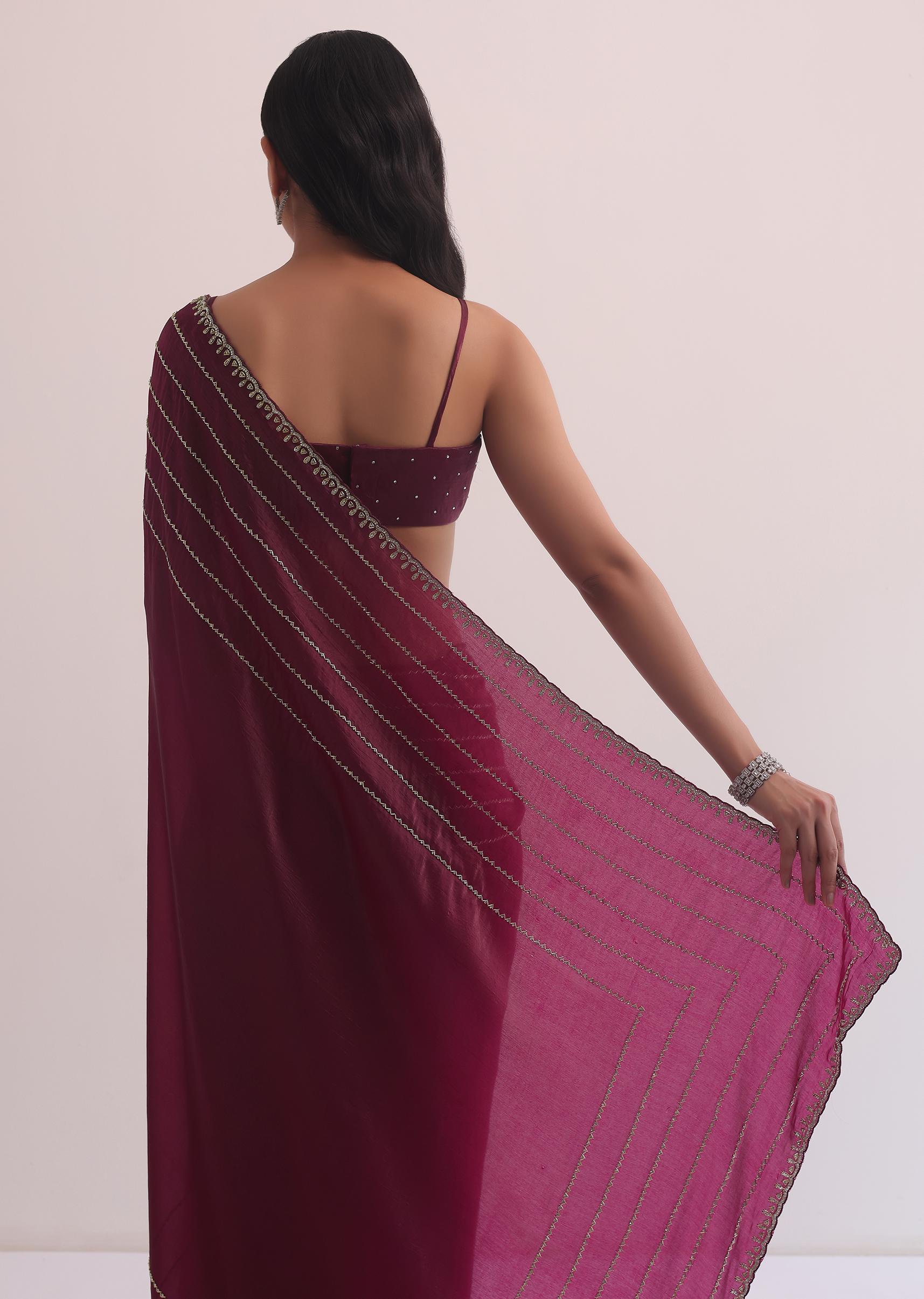 - This saree is crafted from chiffon silk and is accompanied by intricately cut dana embroidery.