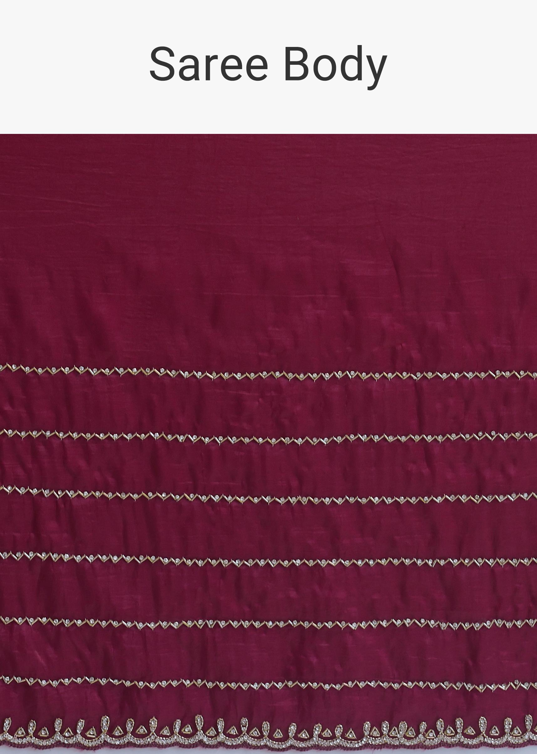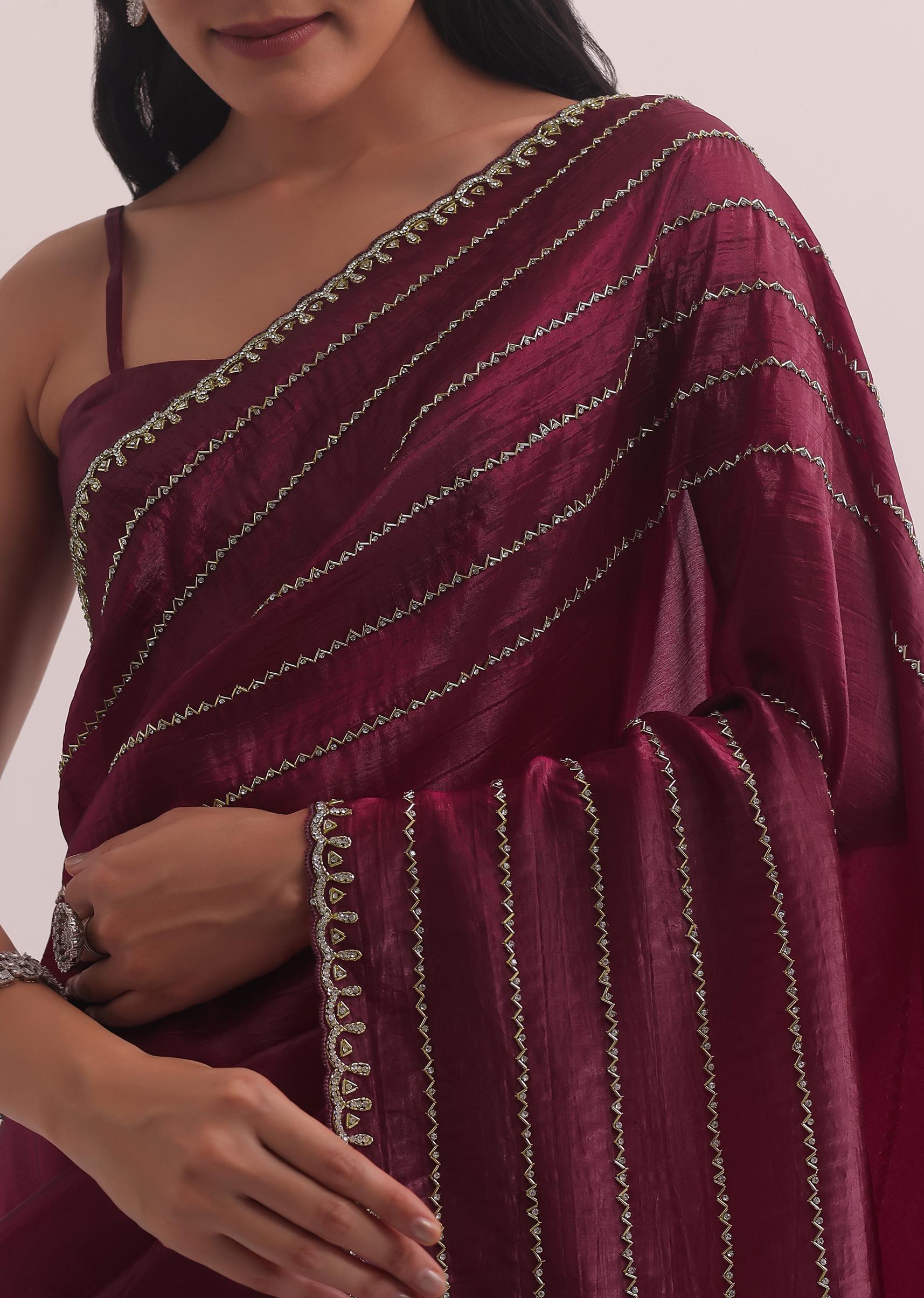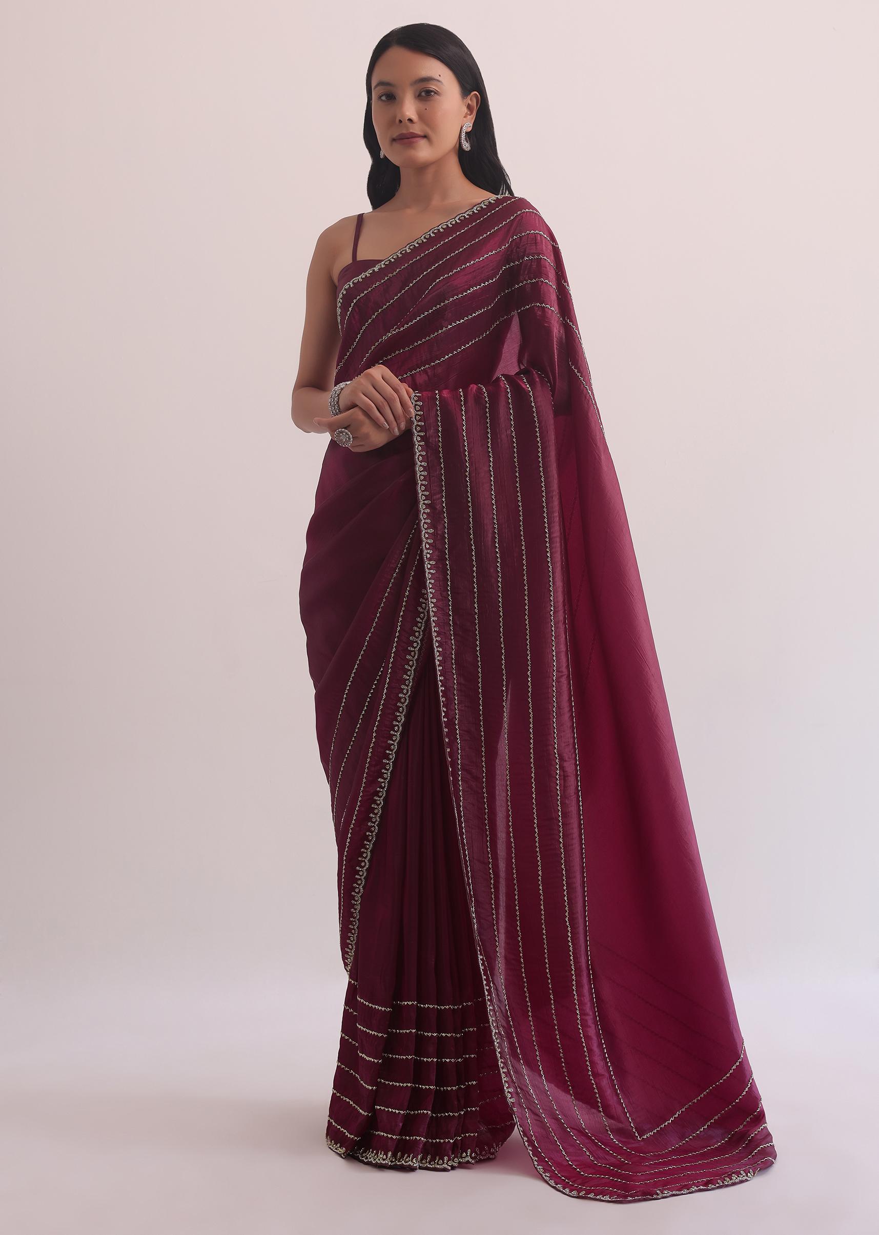 - This saree is crafted from chiffon silk and is accompanied by intricately cut dana embroidery.
