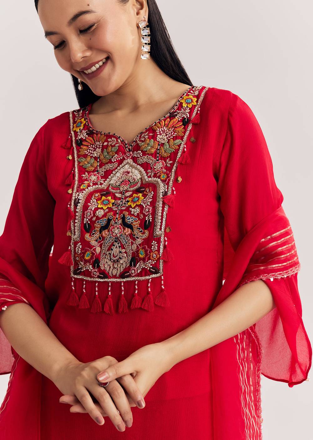 Bold and breezy, this red asymmetrical Palazzo suit in chinon is highlighted with fine embroidery—a perfect blend of tradition and trend. Dupatta may or may not have border. Awarded as... More Product Details