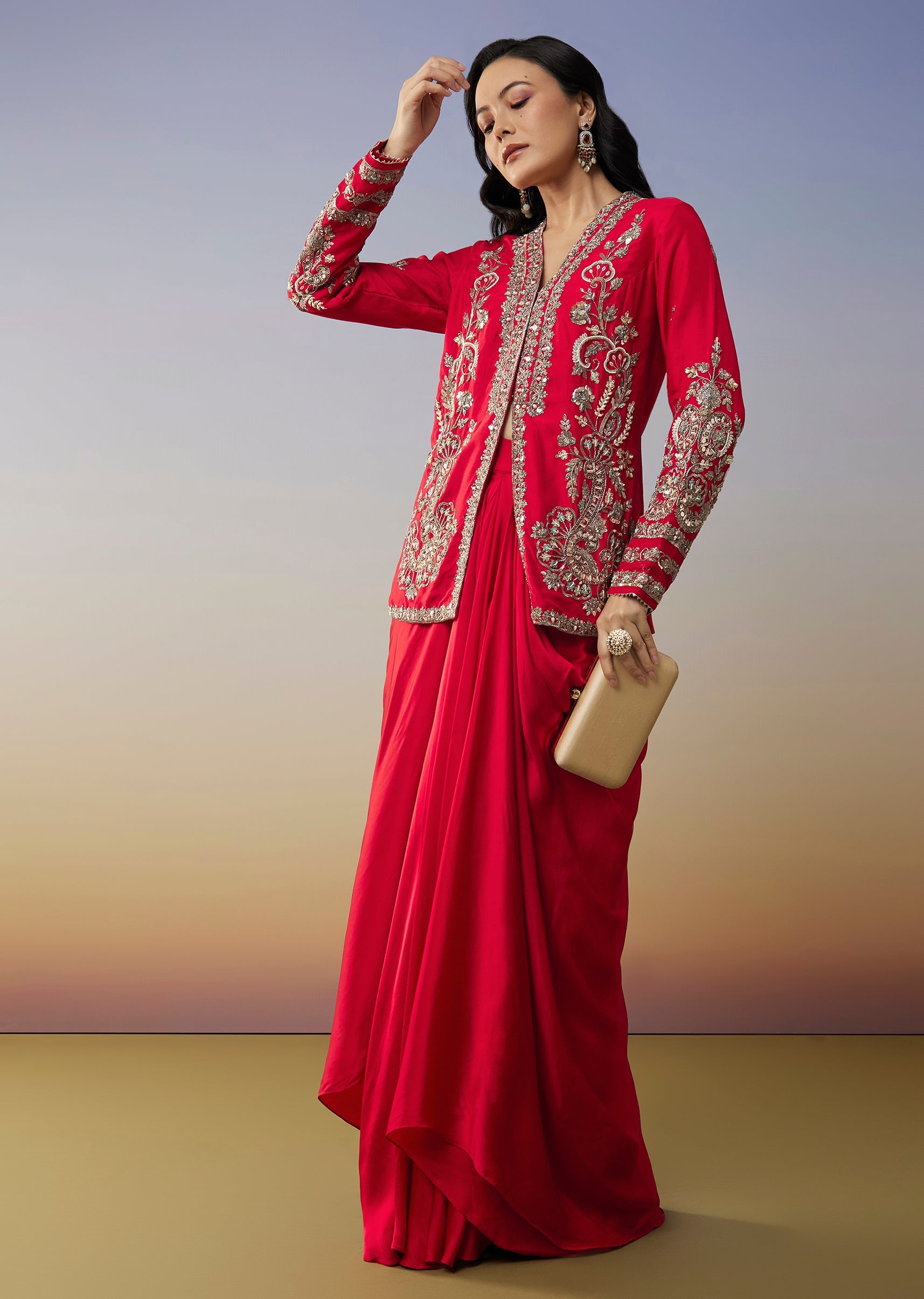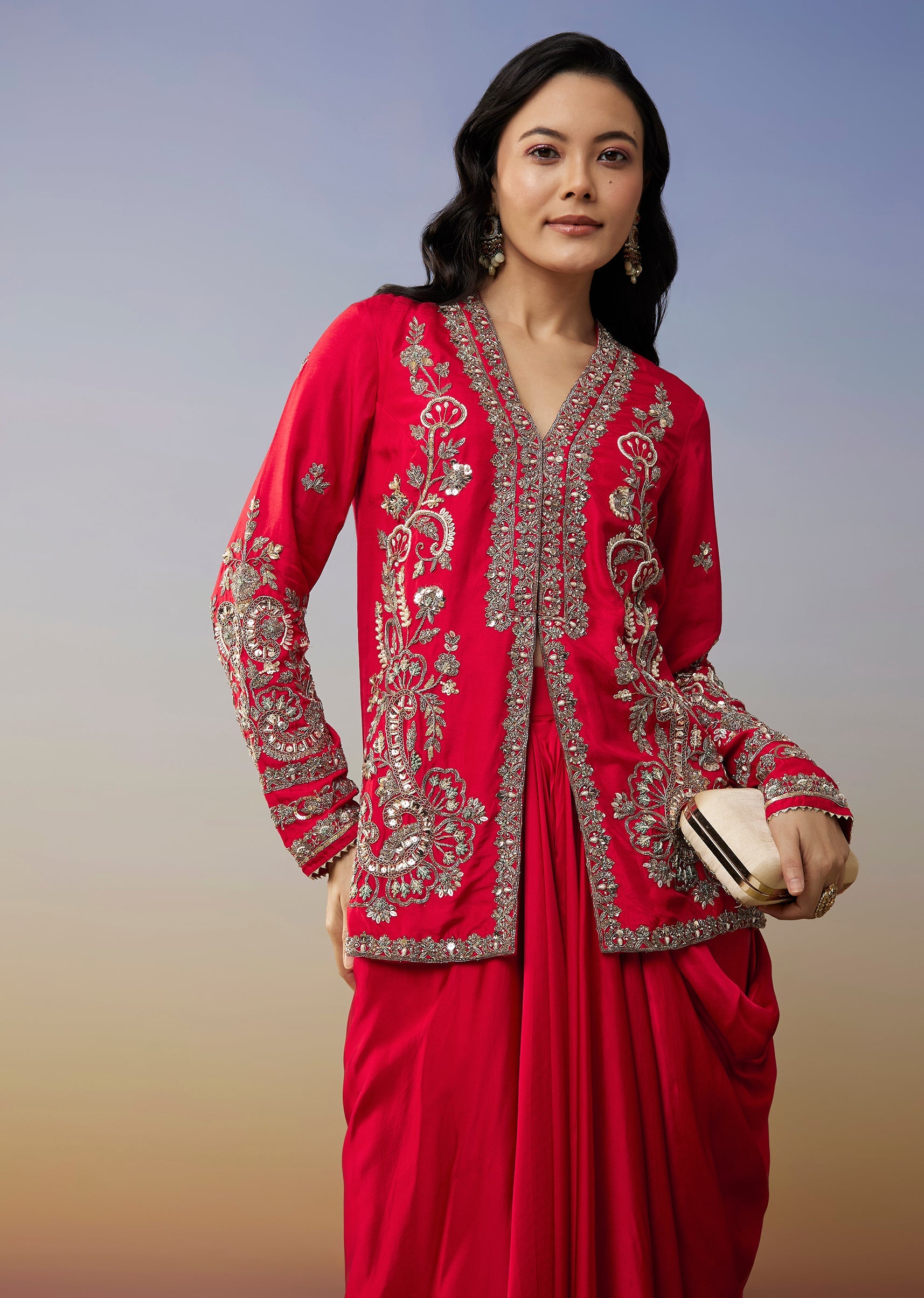 This red jumpsuit brings a bold contemporary charm perfect for sangeet and cocktail celebrations. Crafted in a fluid crepe fabric it features delicate cut dana work that adds a festive... More Product Details
