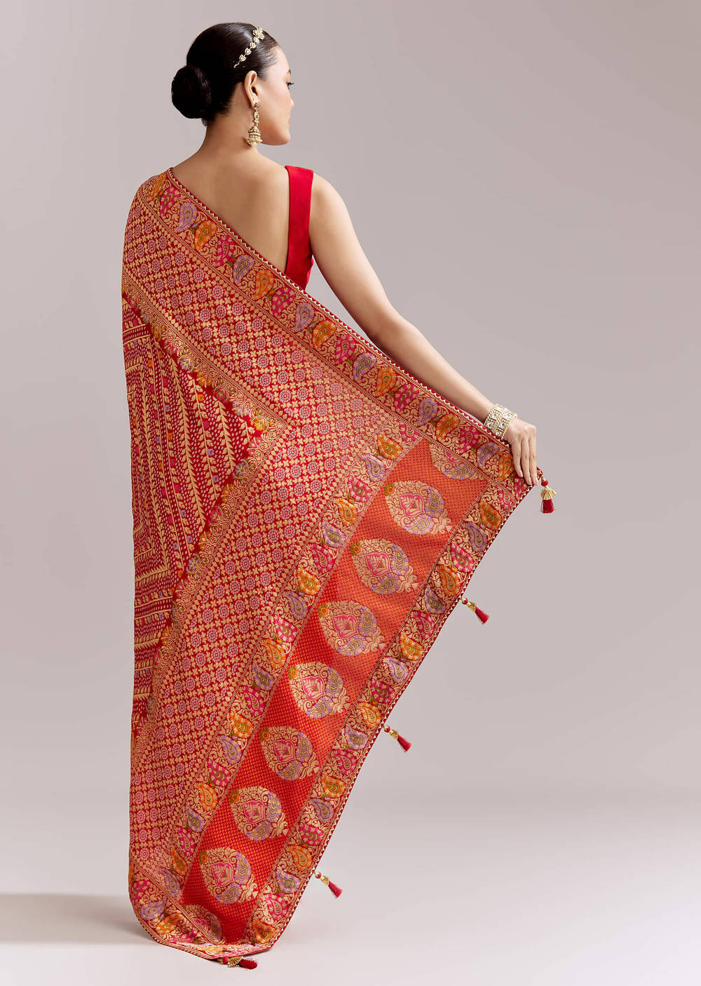 Red Dola Silk Handloom Banarasi Brocade Saree With Floral Jaal
