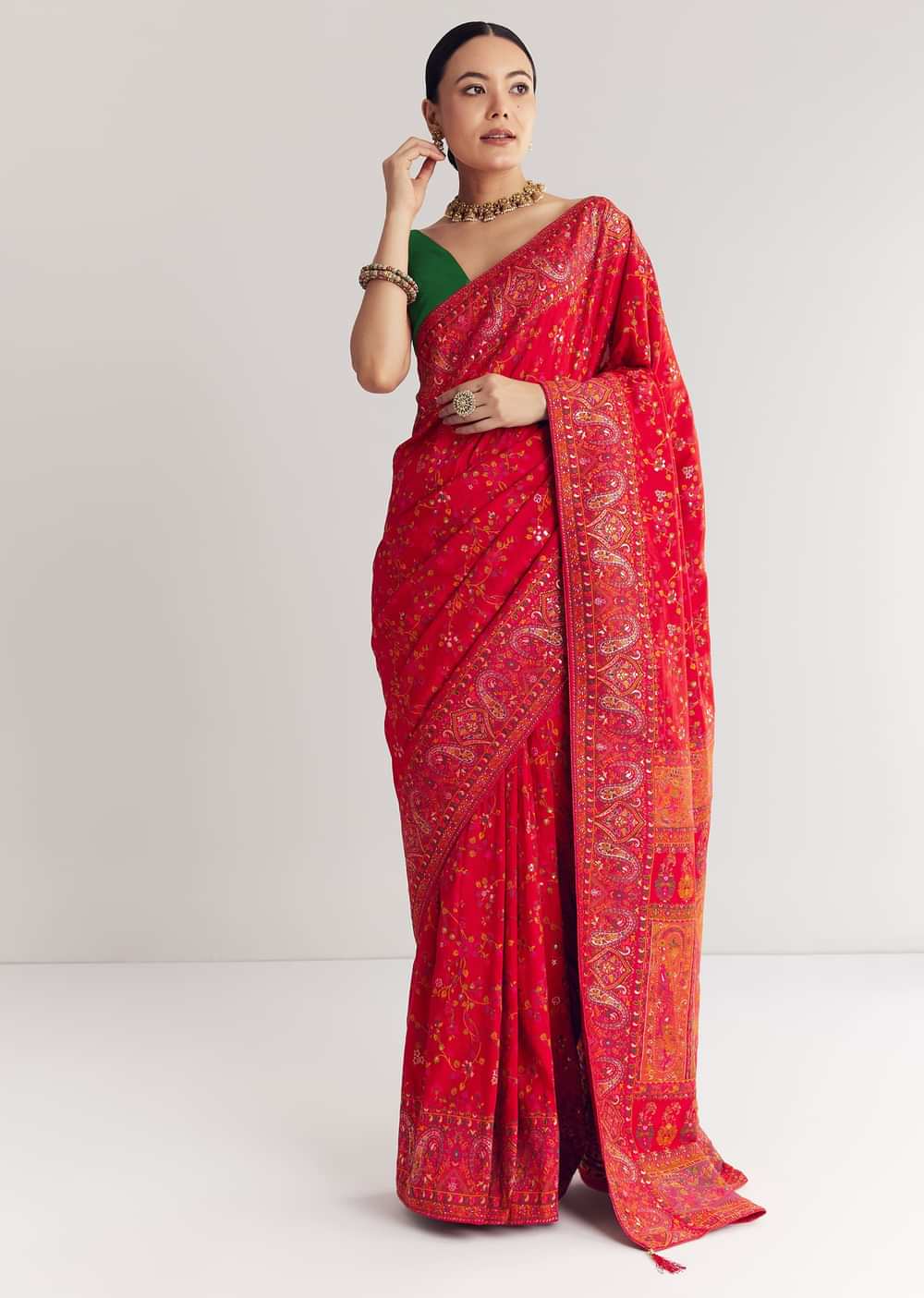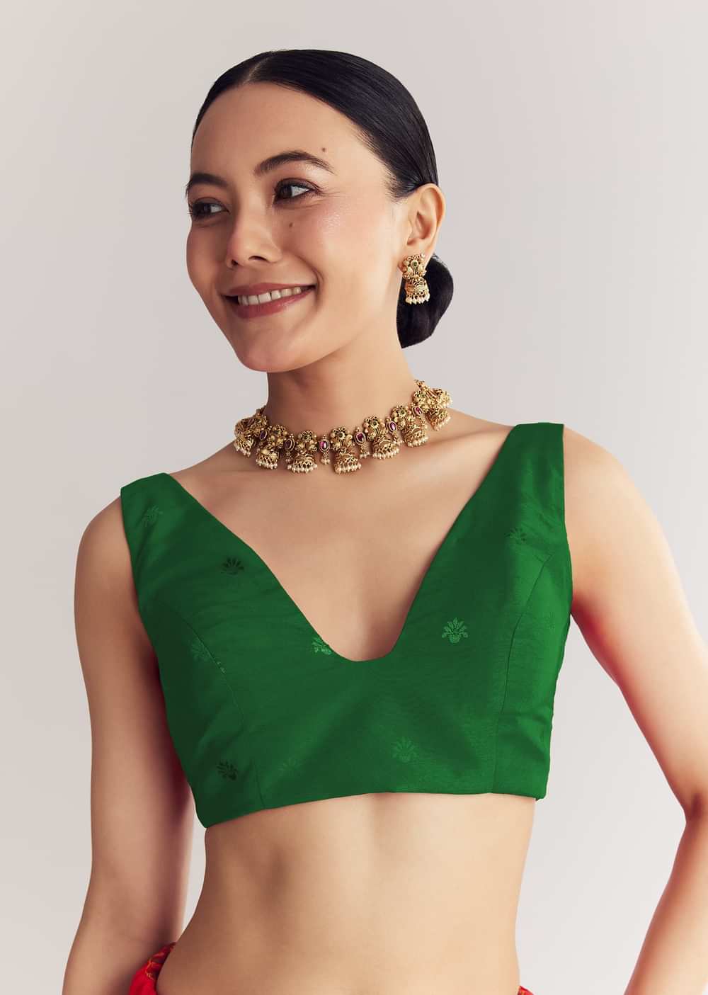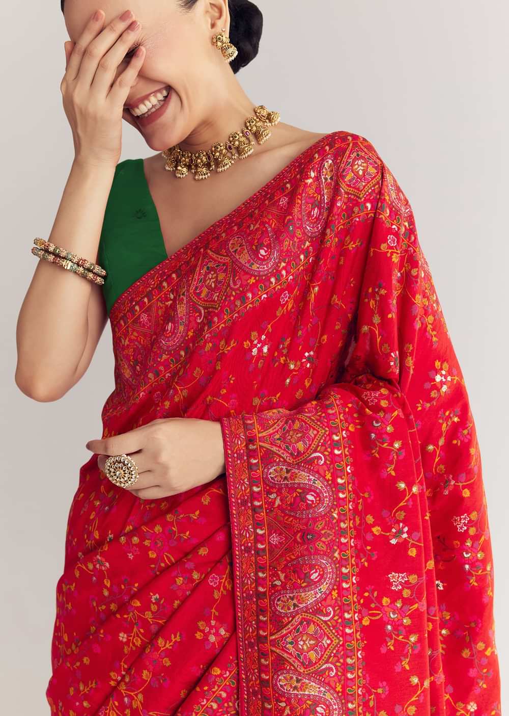 Pair with antique gold jhumkas and a soft bun for a regal festive look.