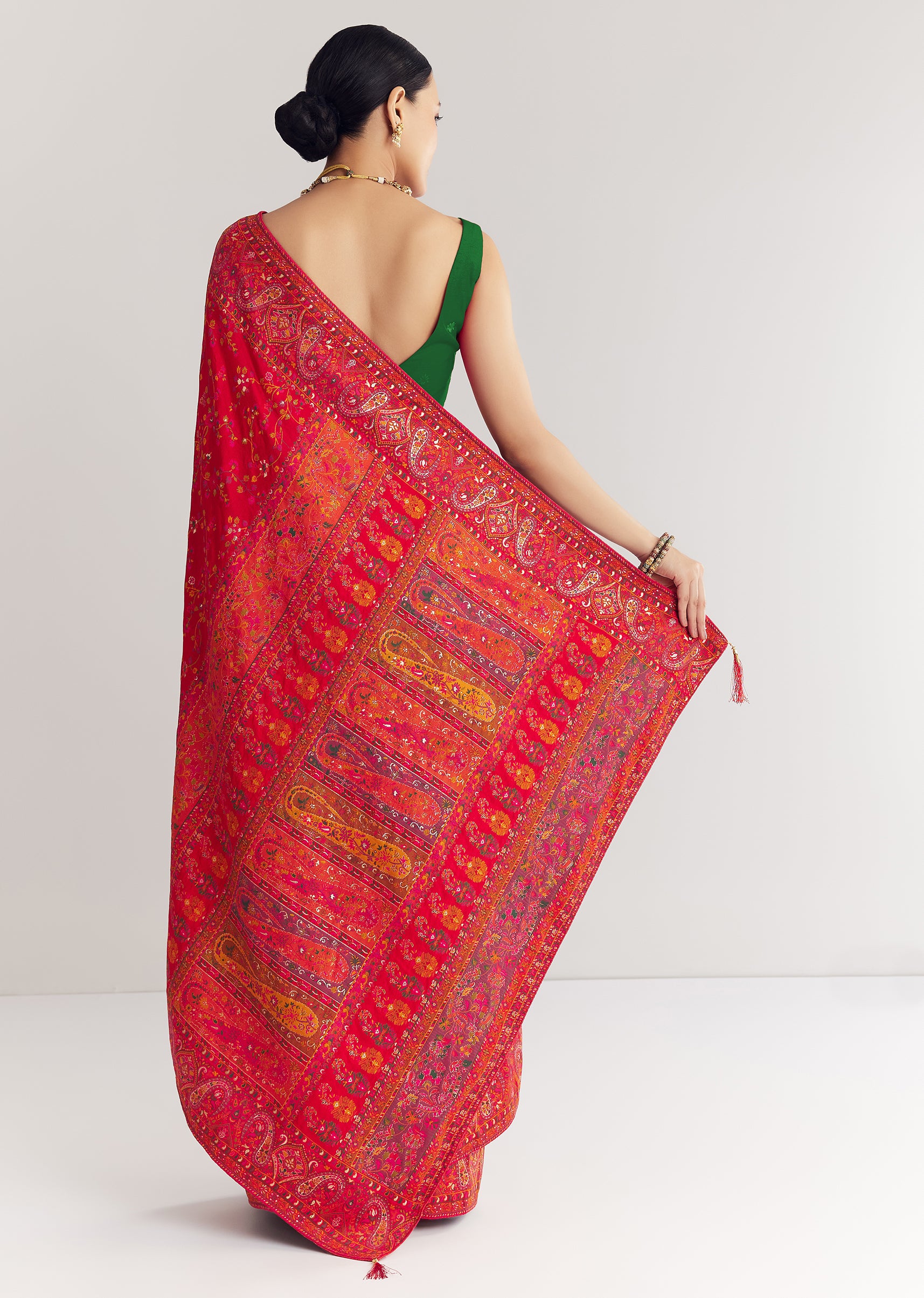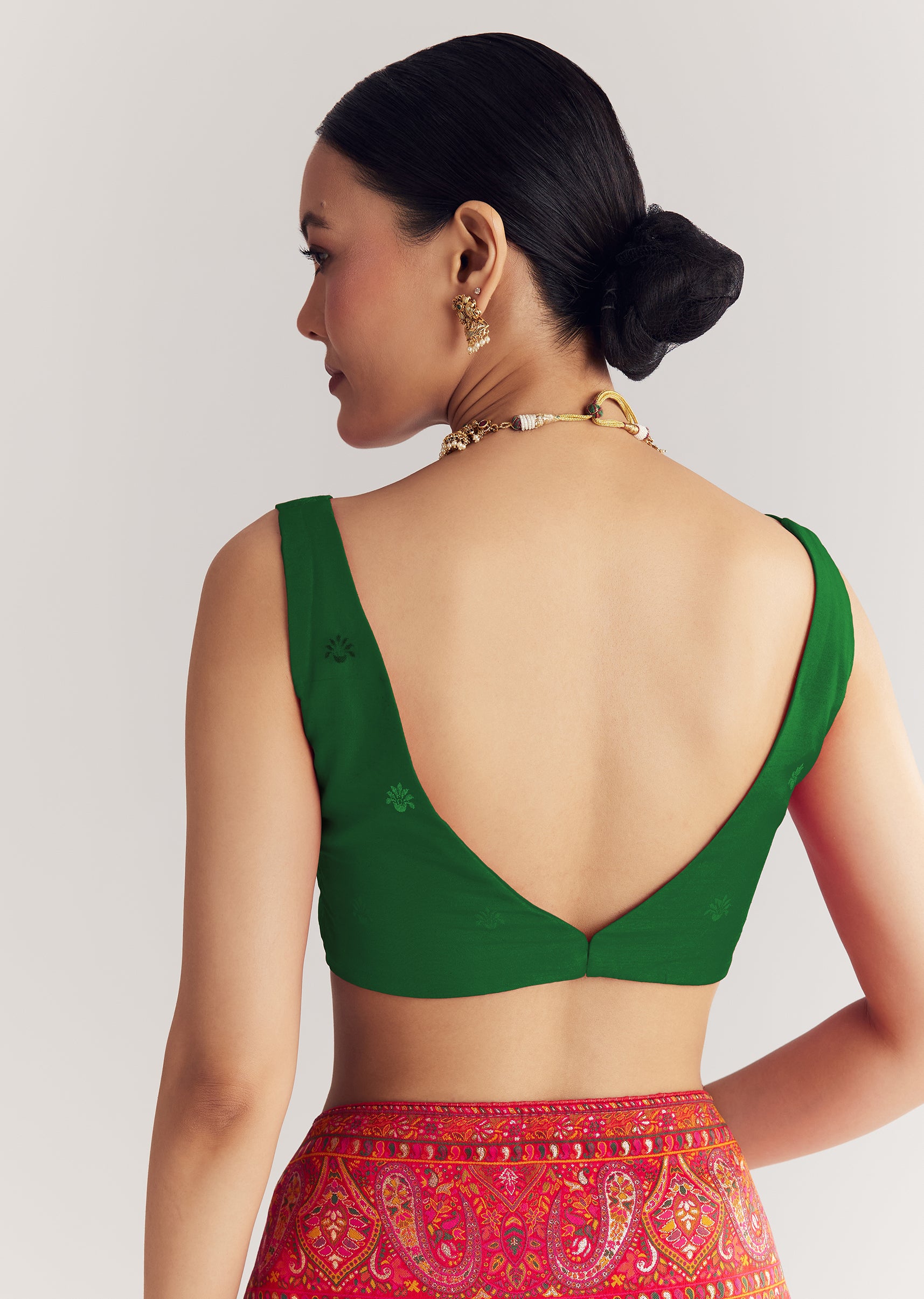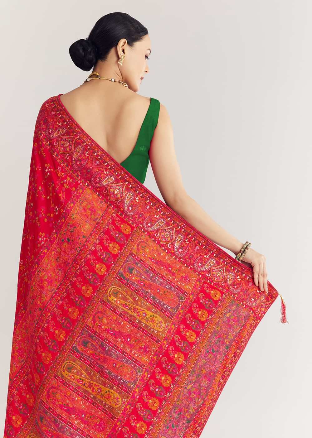 Pair with antique gold jhumkas and a soft bun for a regal festive look.