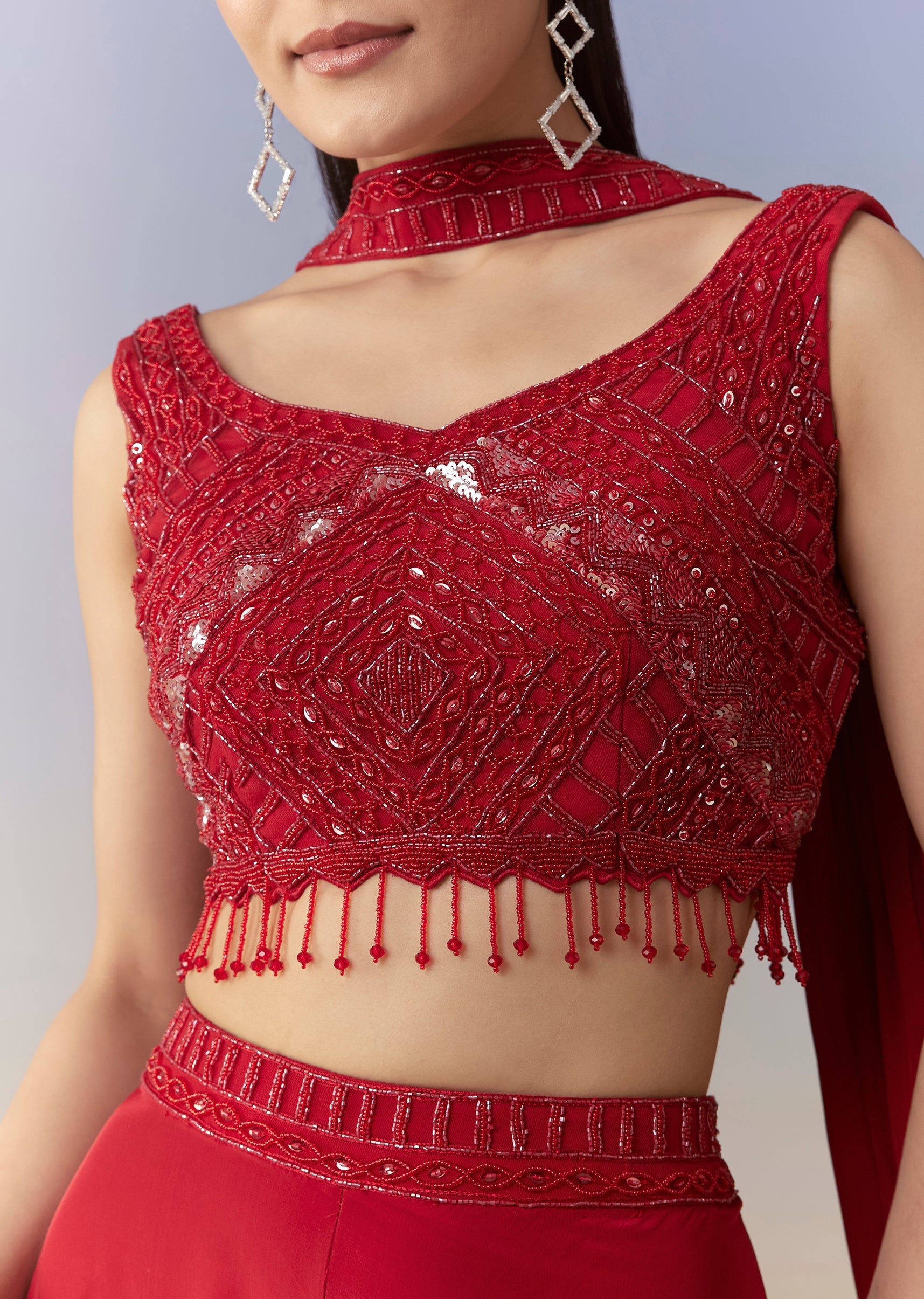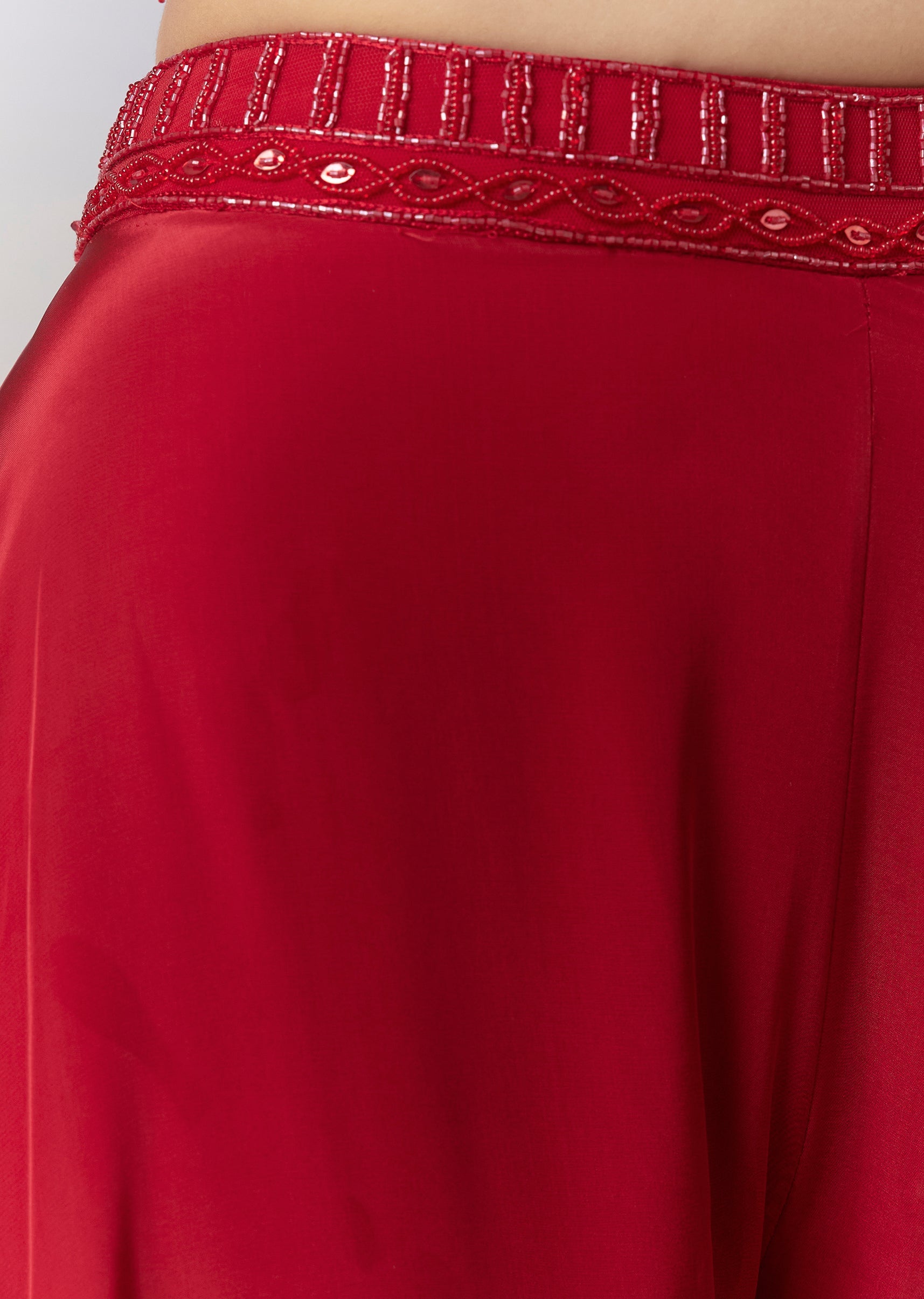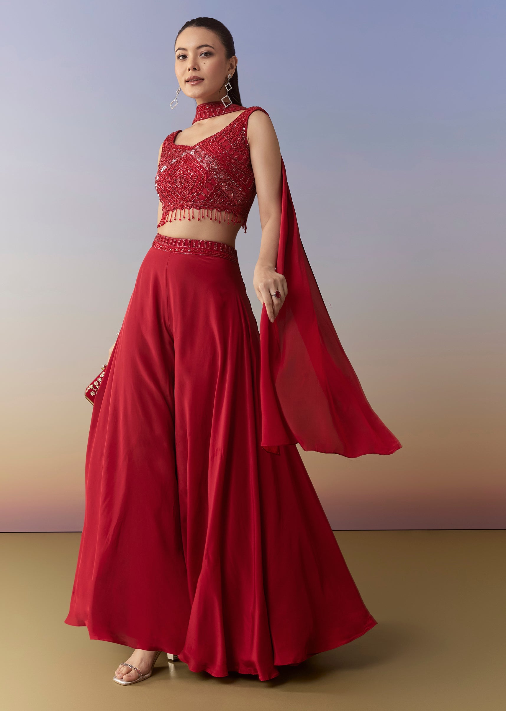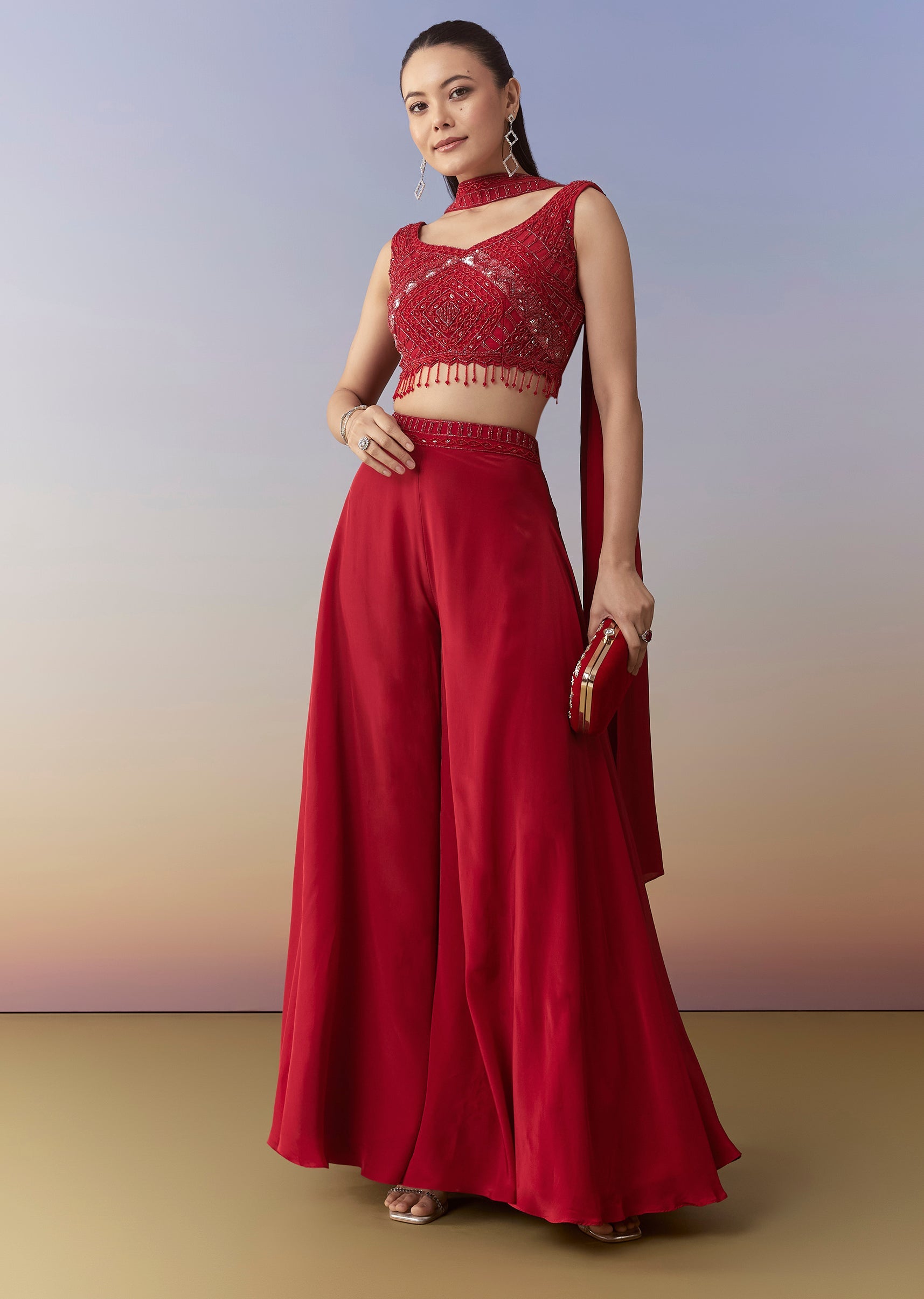 Elevate your festive style with this striking red Indo western palazzo set, showcasing a finely embellished crop top detailed with cutdana and sequins for a shimmering finish. Paired with soft, wide-leg palazzos, the outfit offers effortless movement and a chic contemporary vibe. Perfect for sangeets, cocktail nights, or celebratory events, it delivers a bold yet refined fusion look with standout detailing. Awarded as the Most Trusted Brand, we're delivering styles you love, just as promised.