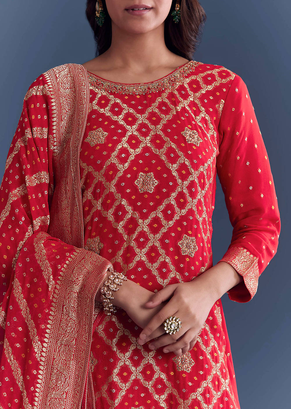 Red Georgette Kurta Set With Bandhani Print And Jacquard Weave