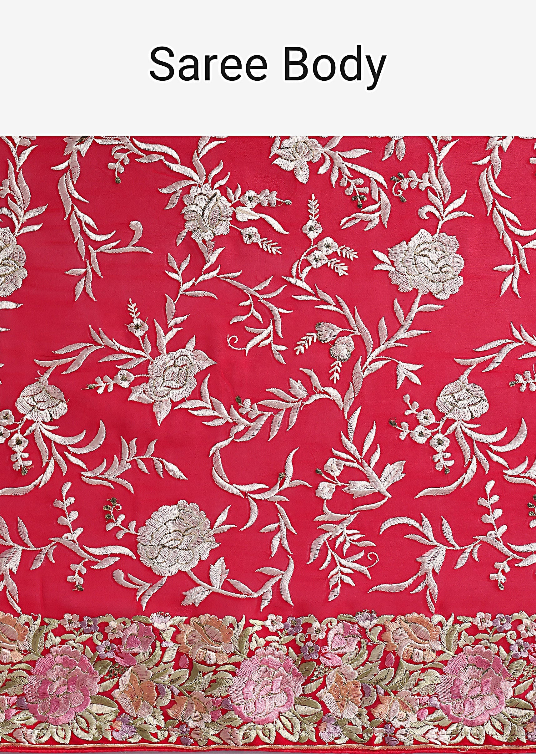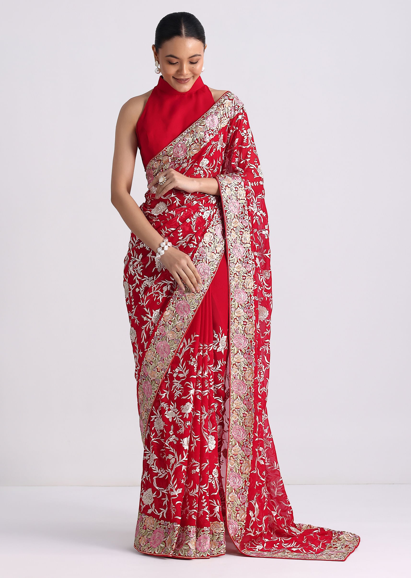 -  Crafted in a vibrant red hue, the detailed multi-colored resham thread embroidery enhance your picture-perfect festive look.