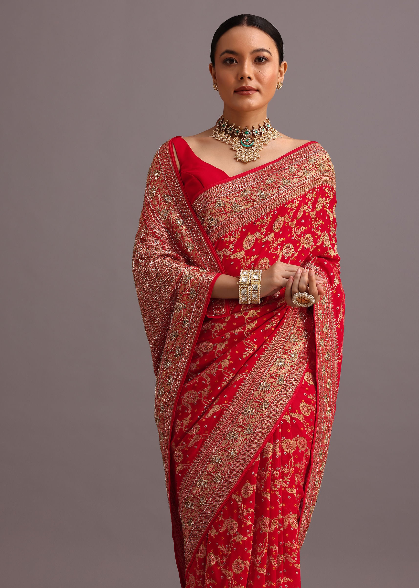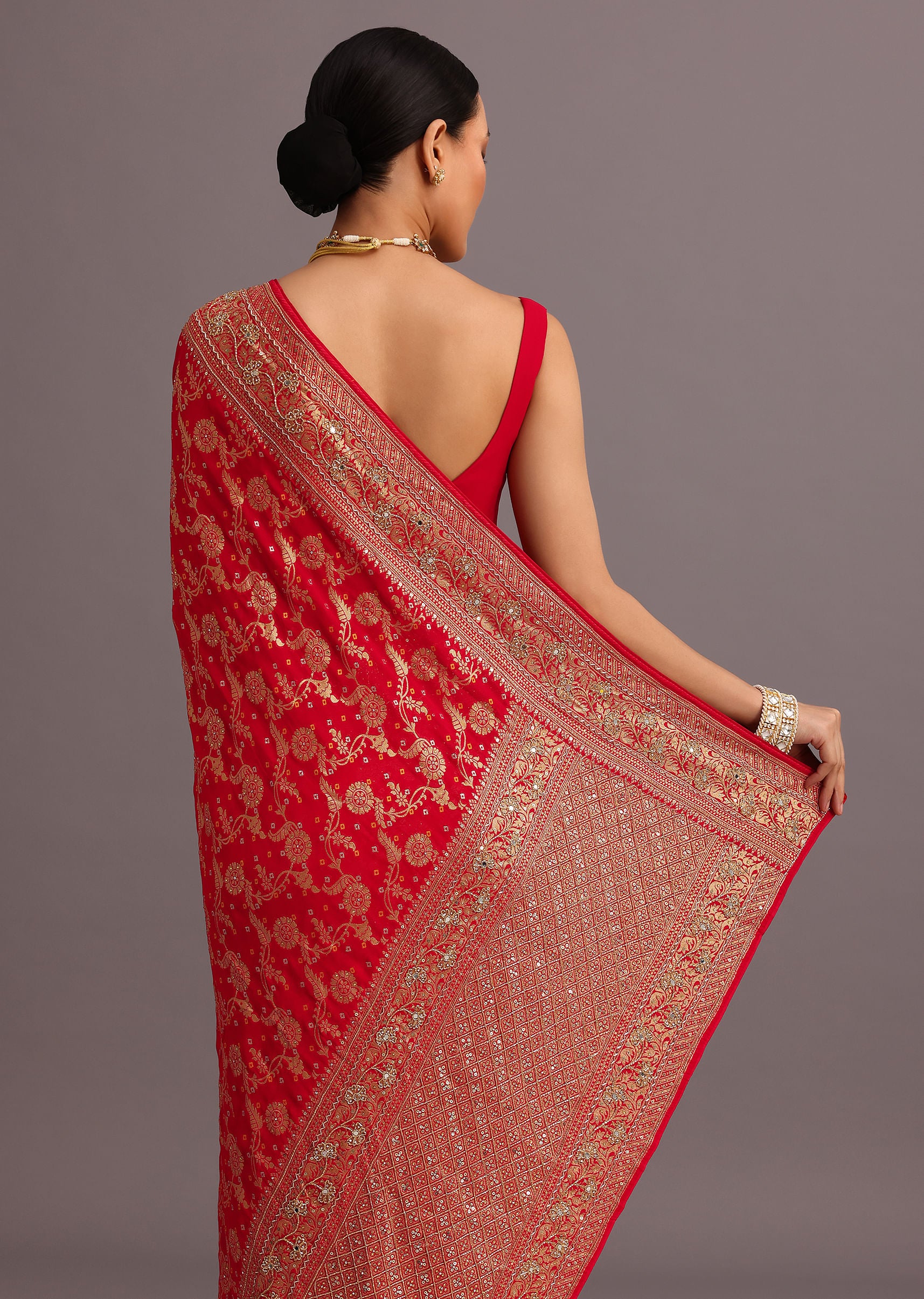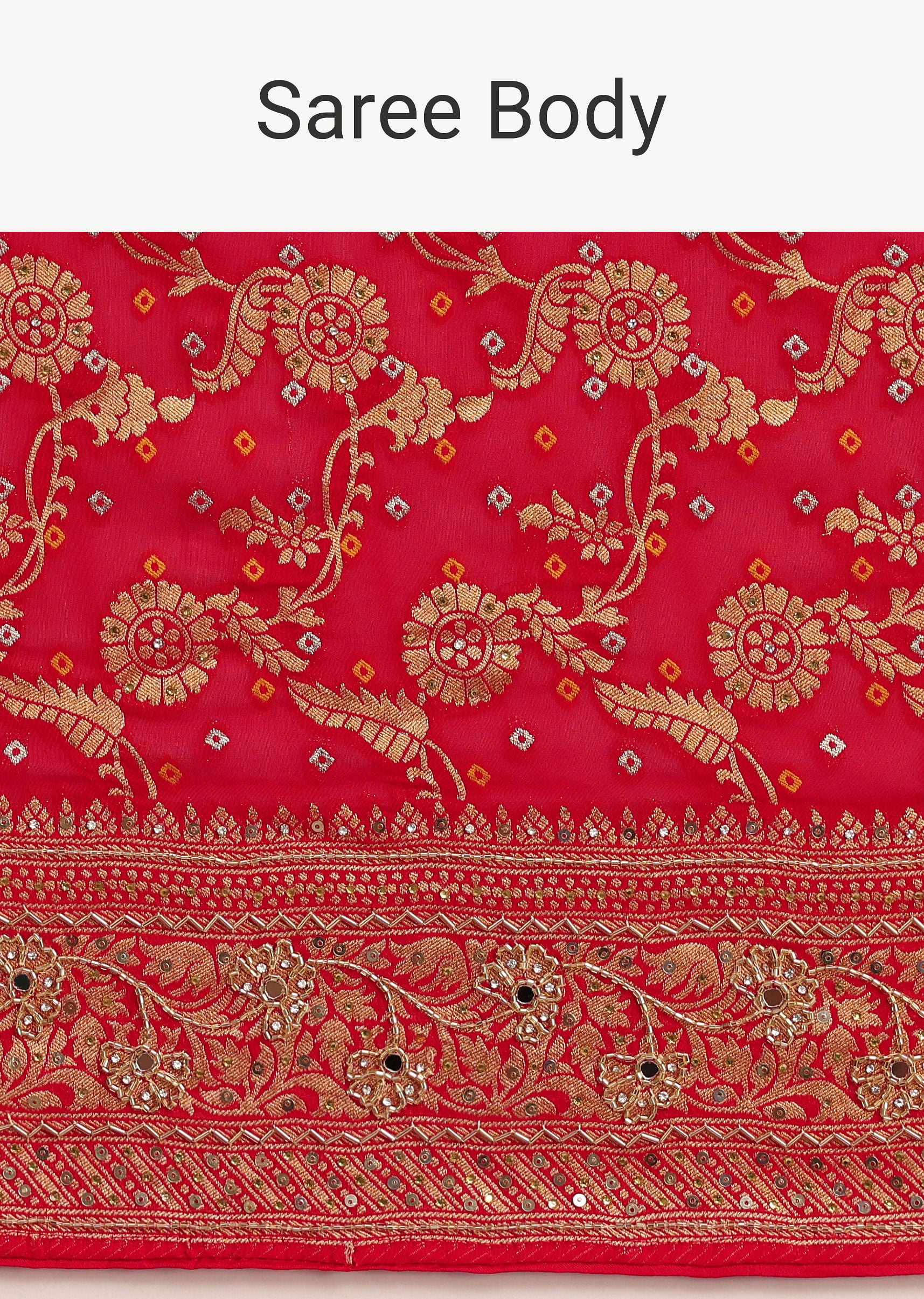 Red Georgette Woven Saree With Bandhani Jaal Work