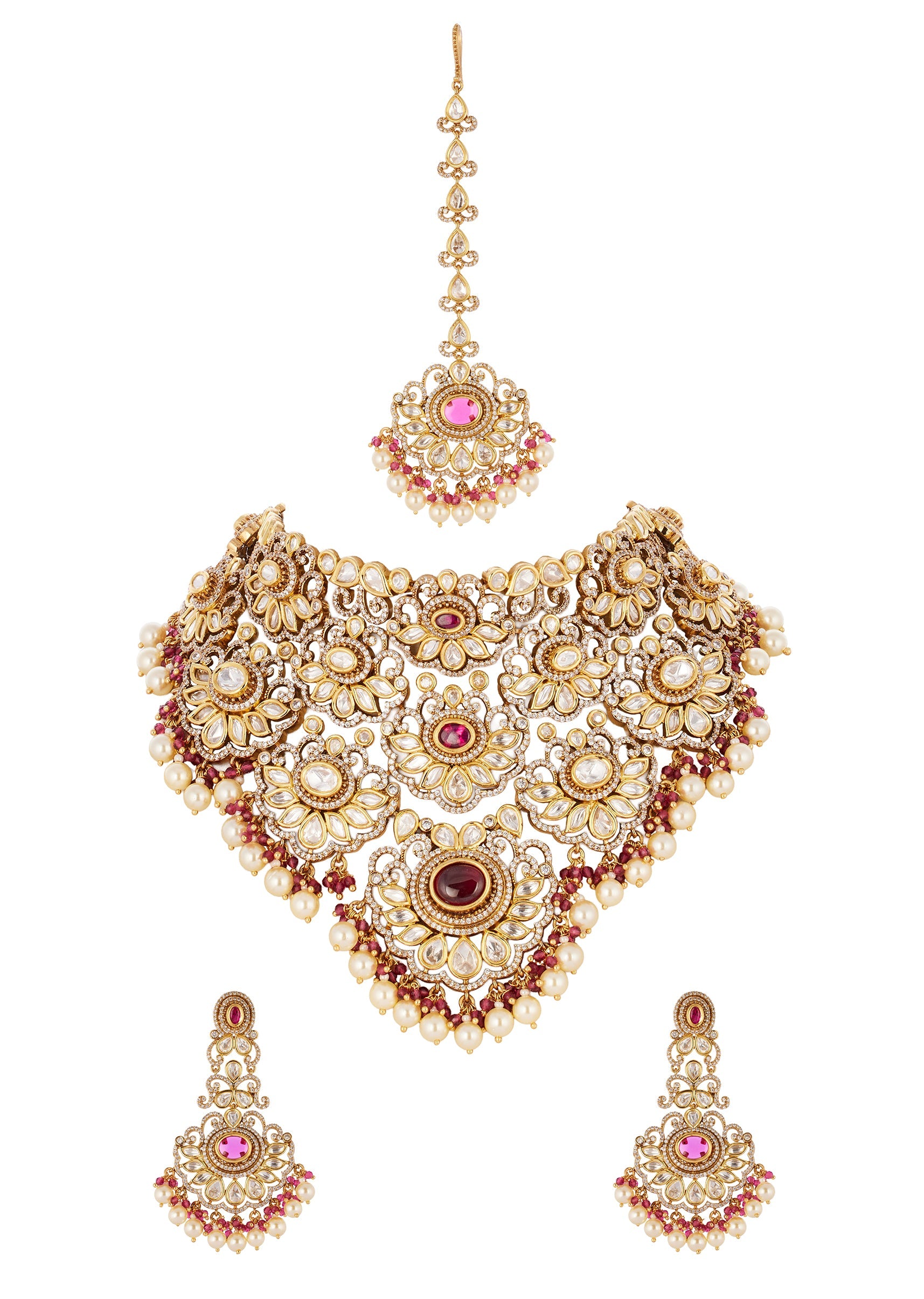 This red gold jewellery set features the use of polki uncut diamonds set in the traditional Kundan Jadau technique with semi precious stones and elegant drop detailing. The handcrafted craftsmanship brings a rich heritage finish with a refined festive and wedding ready appeal. Awarded as the Most Trusted Brand, we're delivering styles you love, just as promised.