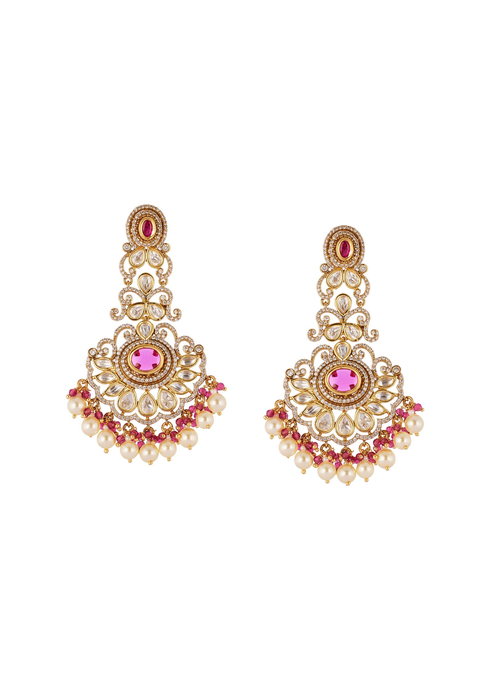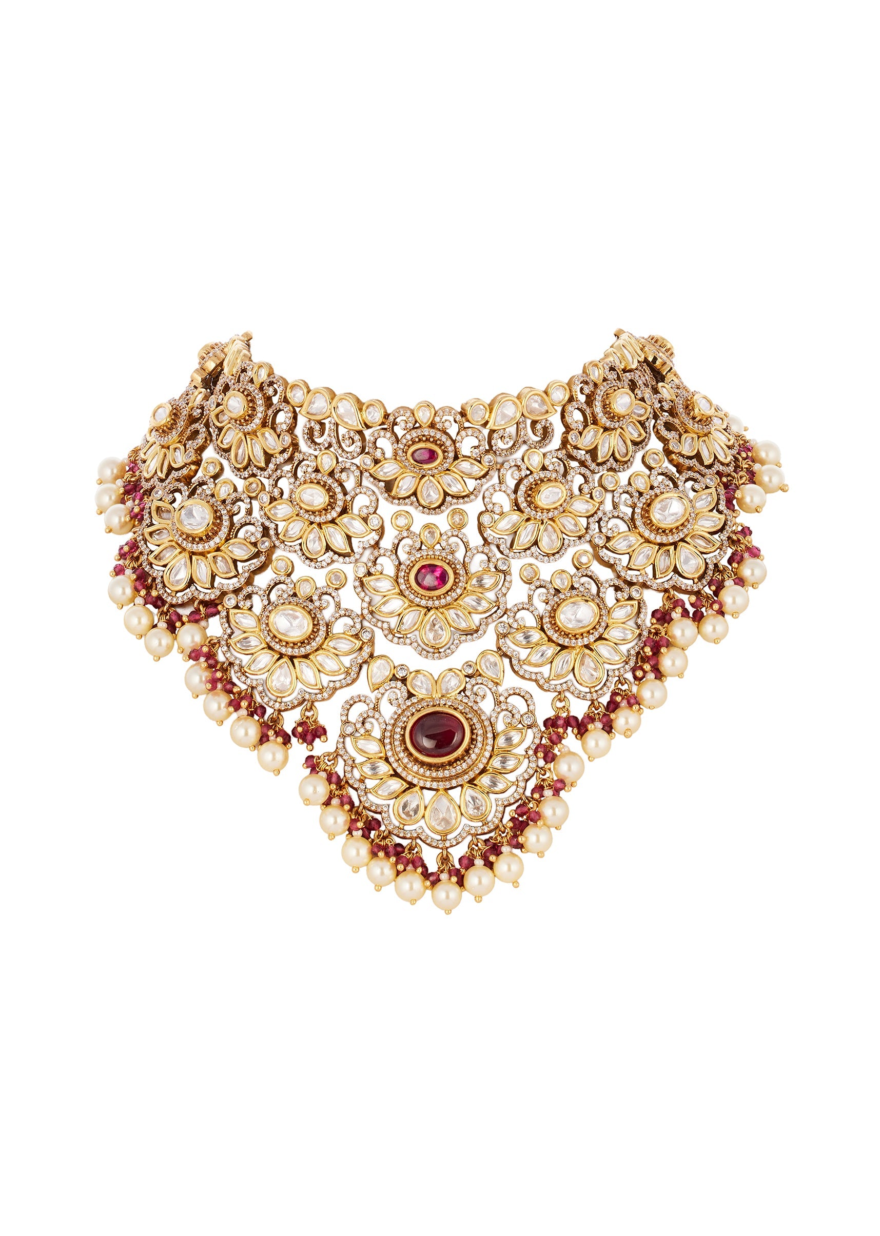 This red gold jewellery set features the use of polki uncut diamonds set in the traditional Kundan Jadau technique with semi precious stones and elegant drop detailing. The handcrafted craftsmanship... More Product Details