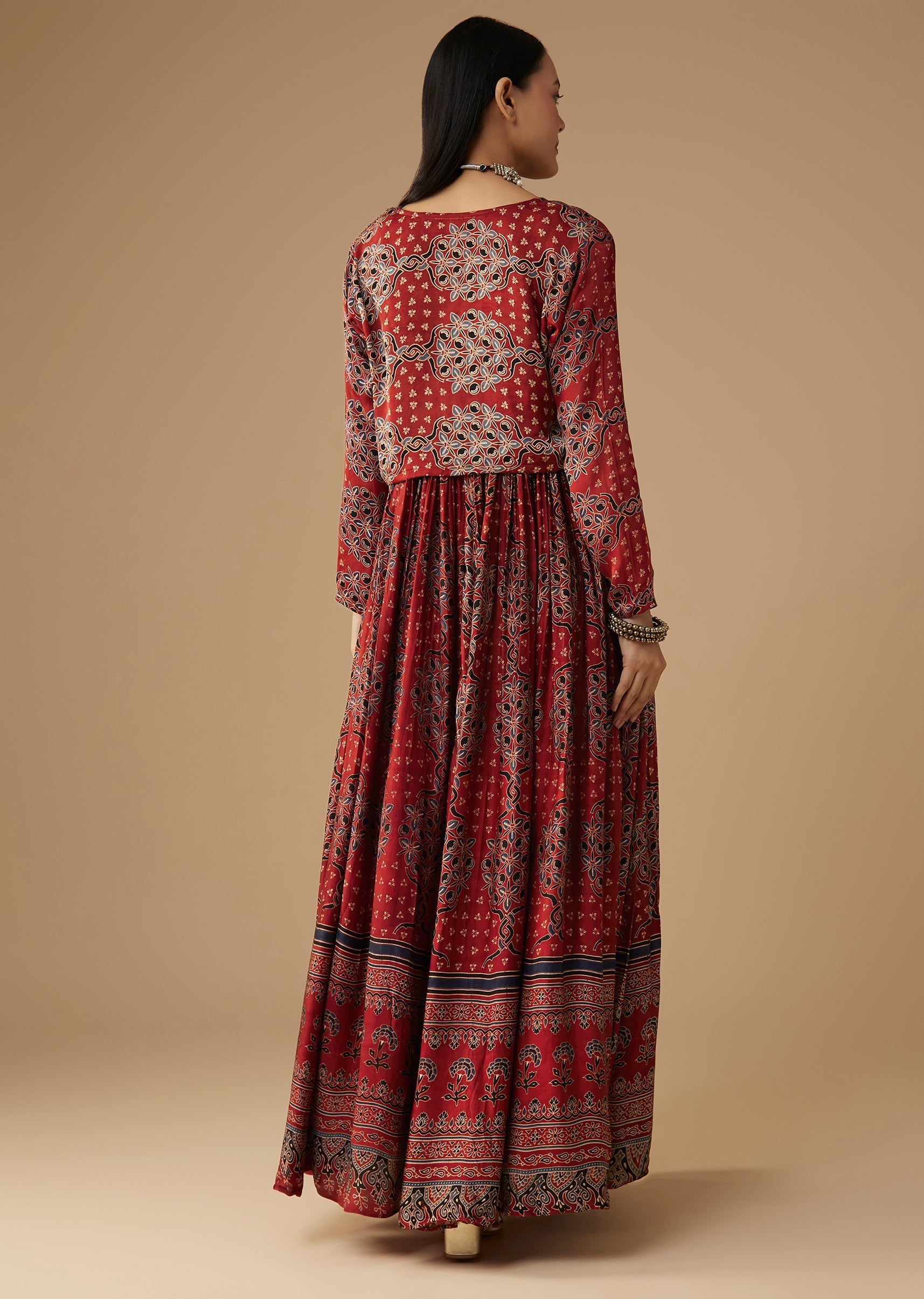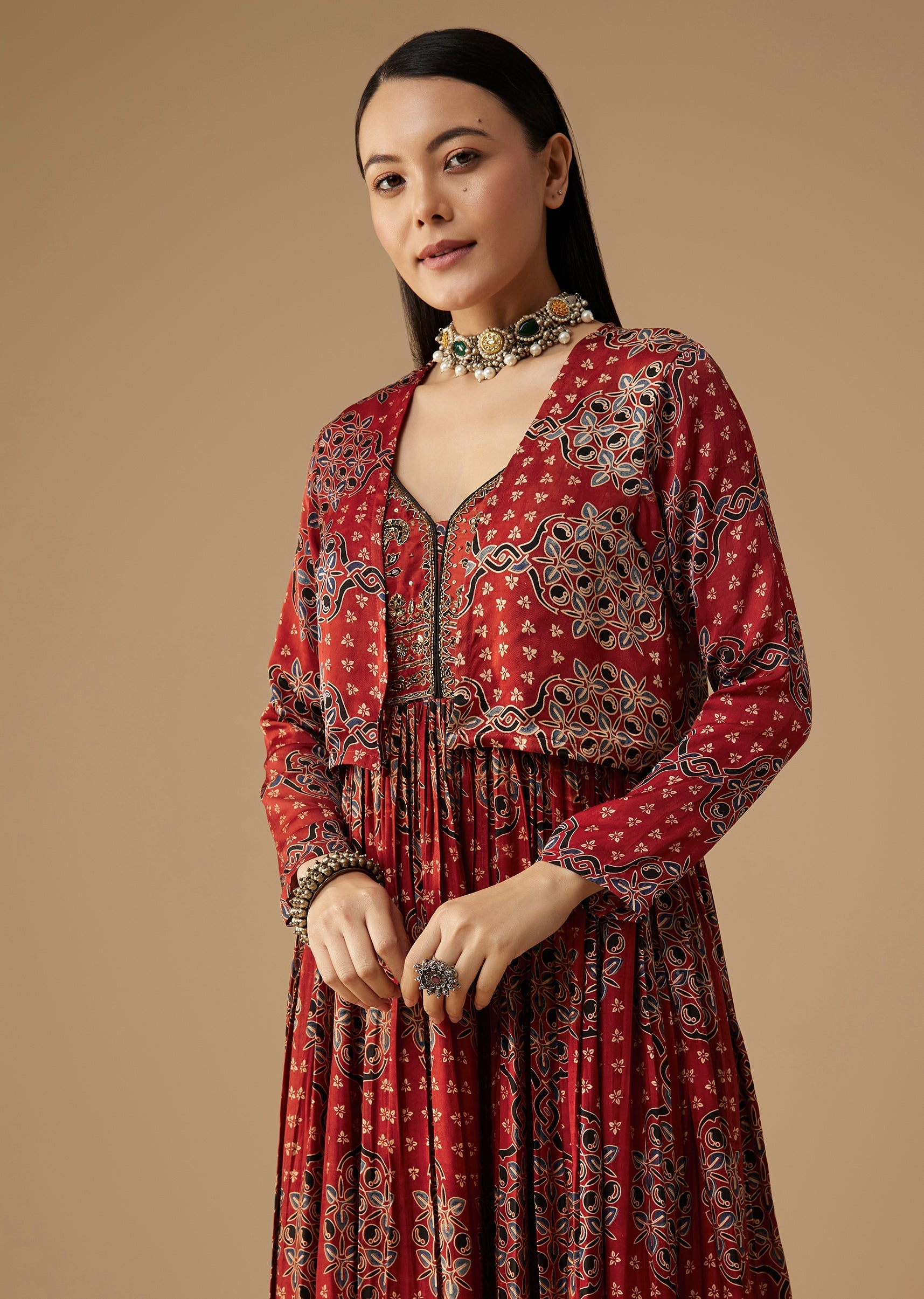Red Hand Dyed Ajrakh Gown with Jacket and Scarf