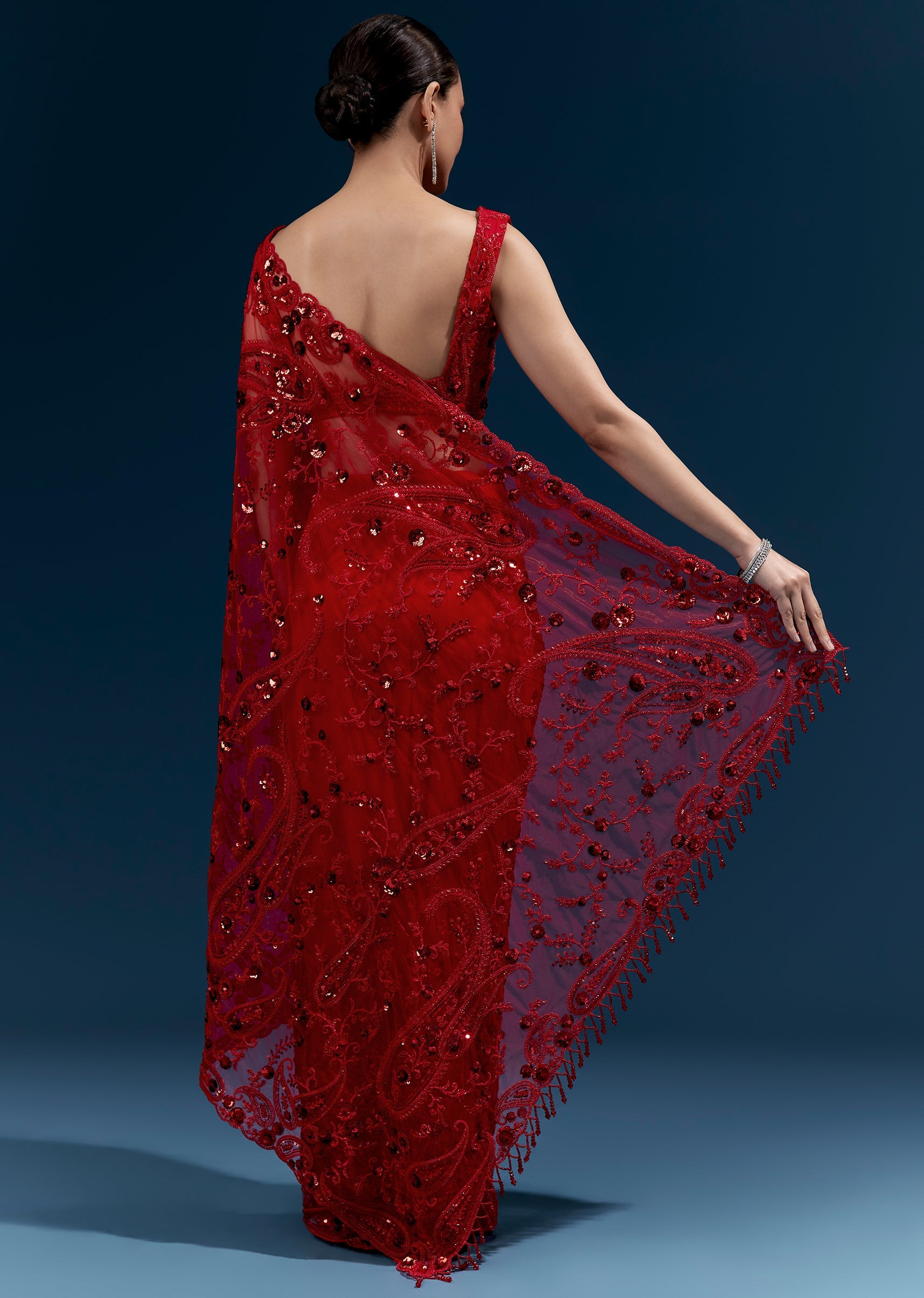 This red net saree features heavy floral embroidery with cutdana, sequins and beads all over for a statement finish. Tassels at the pallu end add a festive touch, making it perfect for cocktail parties, receptions and wedding celebrations. Awarded as the Most Trusted Brand, we're delivering styles you love, just as promised.