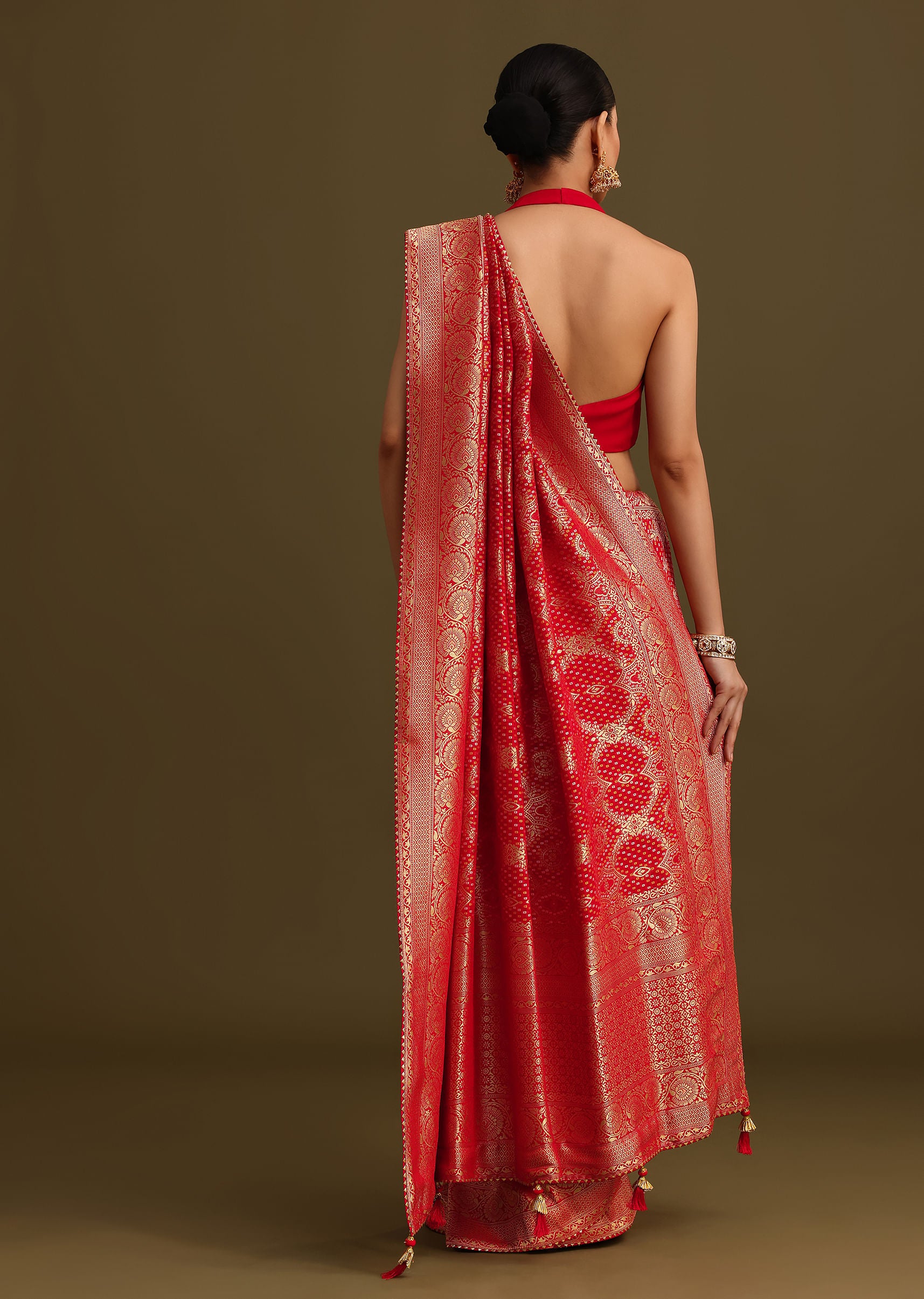 Drape yourself in a fiery red zari weave saree, the intricate patterns shimmering like embers in the moonlight. The unstitched blouse offers endless possibilities for customization, allowing you to create a look that's uniquely yours. This khaddi georgette saree is perfect for festive occasions, exuding elegance and sophistication. Awarded as the Most Trusted Brand, we're delivering styles you love, just as promised.