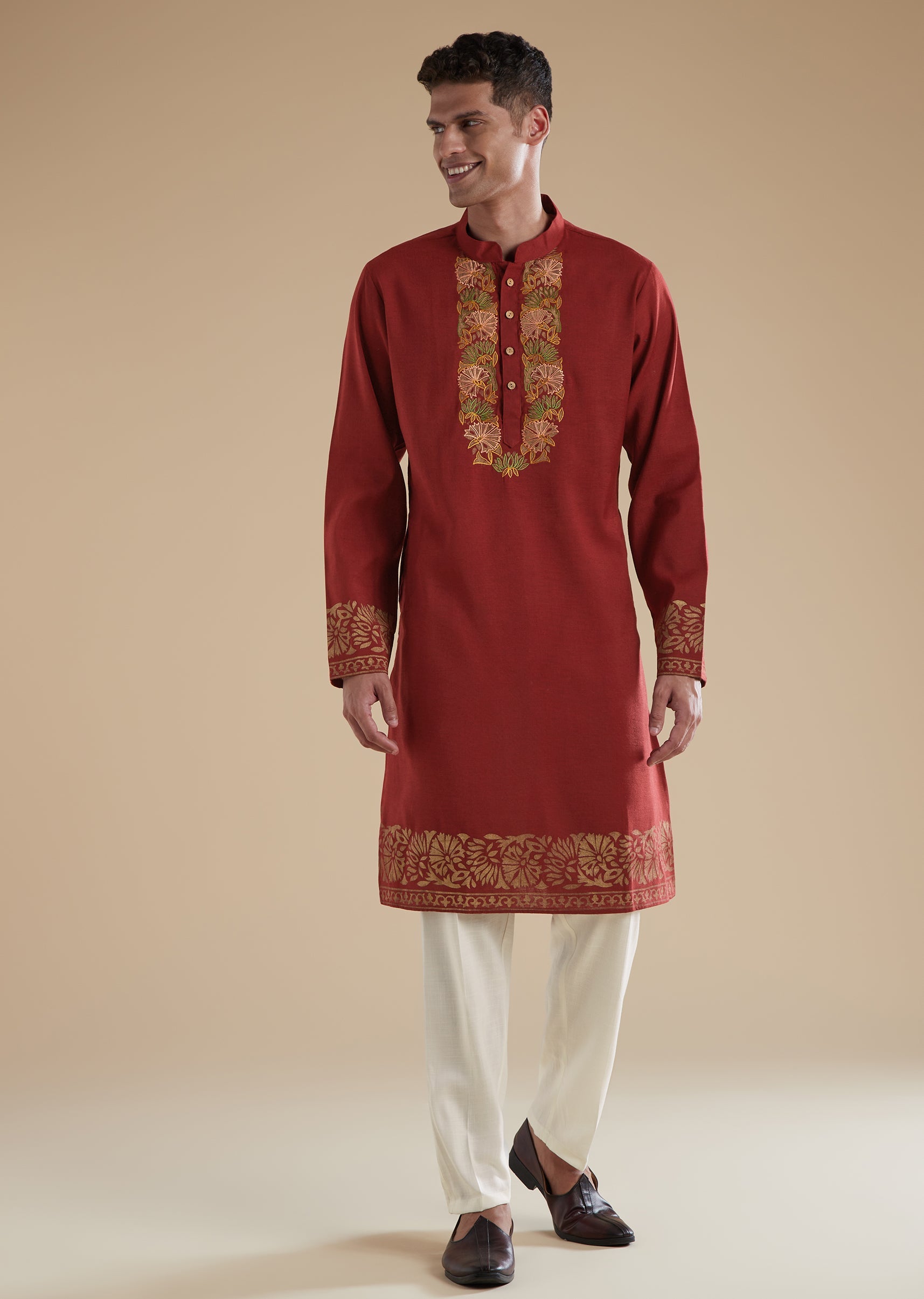 This red mens kurta set is crafted in smooth viscose with cotton as the secondary fabric, offering a comfortable yet refined drape. The kurta is detailed with intricate resham thread... More Product Details