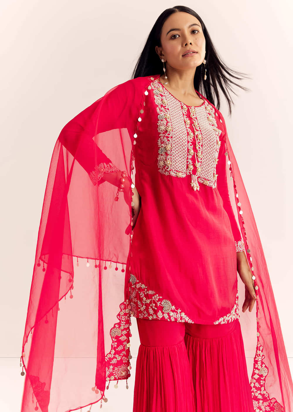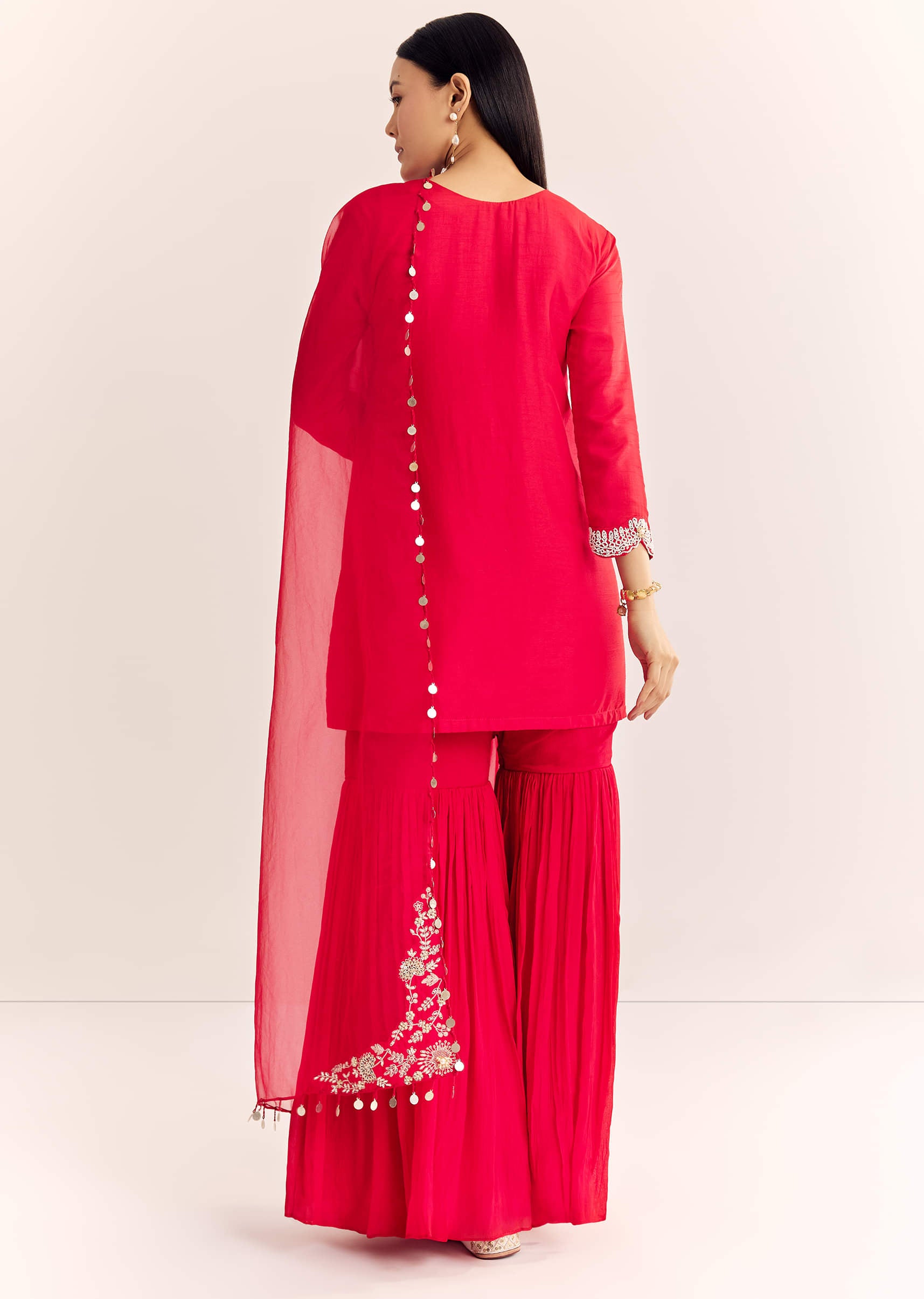 Red Moti Threadwork Dola Silk Sharara Suit With Organza Dupatta