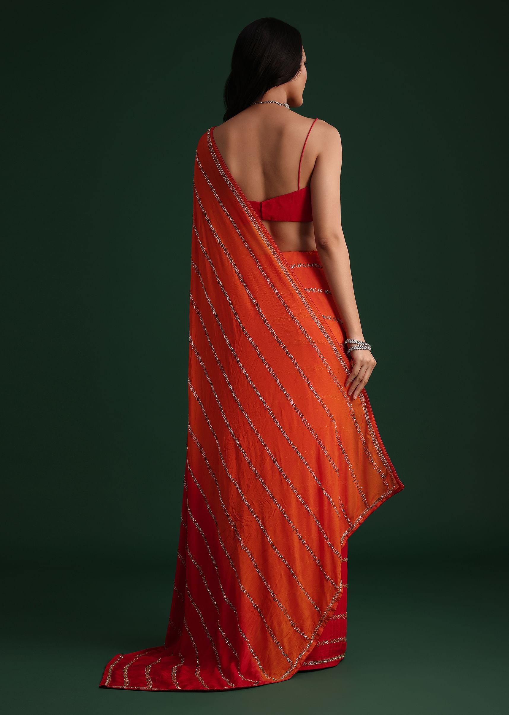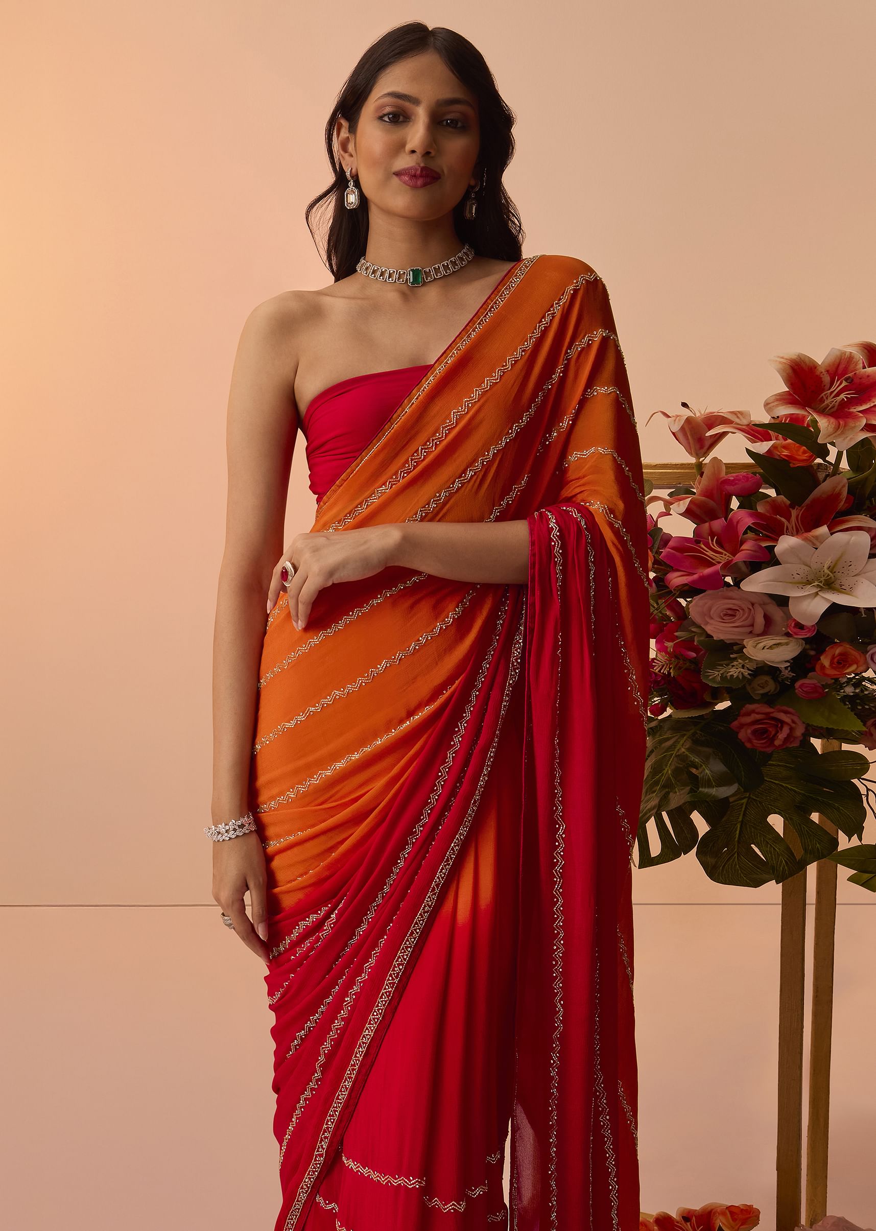Red Orange Dual Tone Chinon Heavy Embroidered Saree