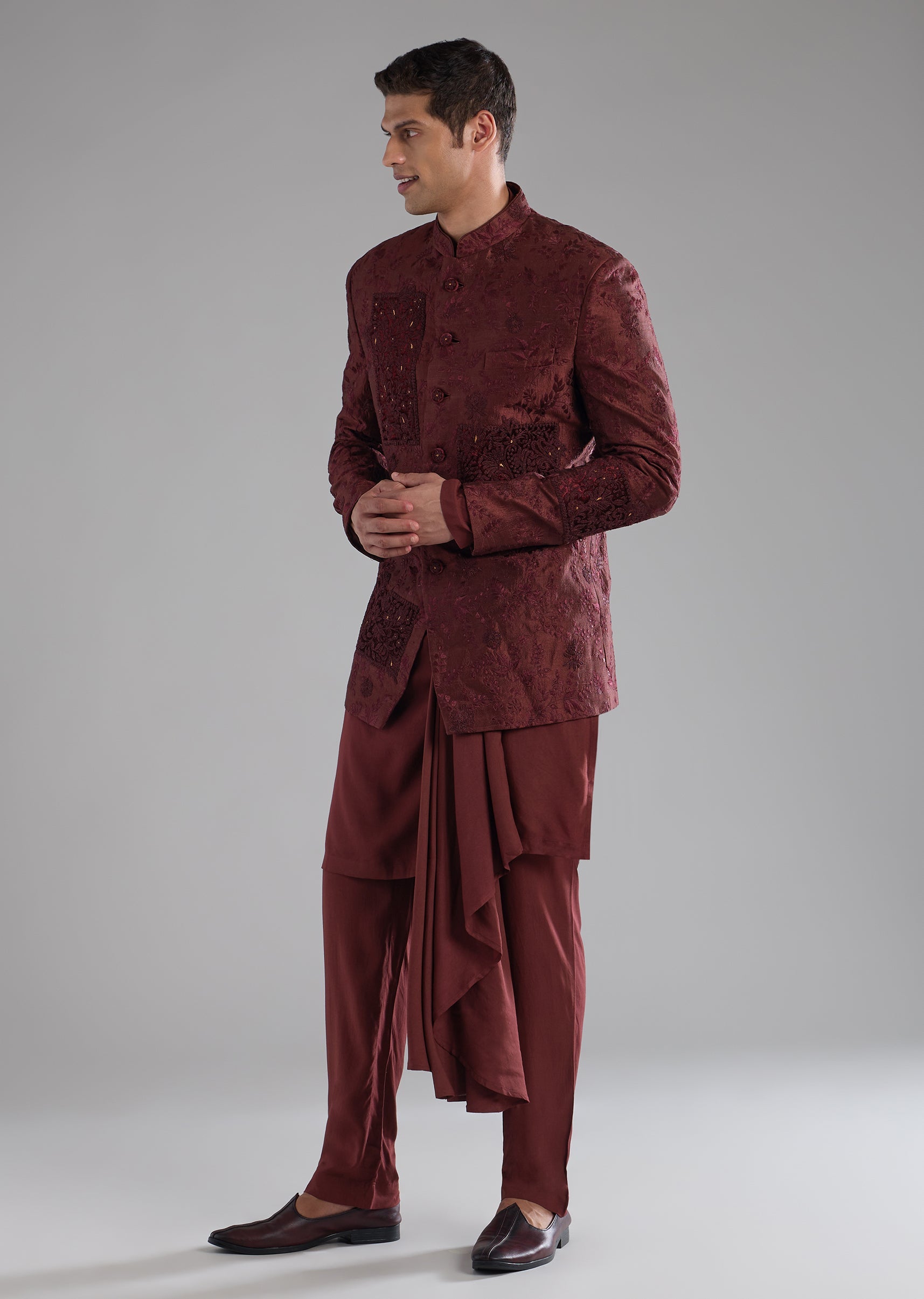 Red Raw Silk Embroidered Indowestern Kurta Set