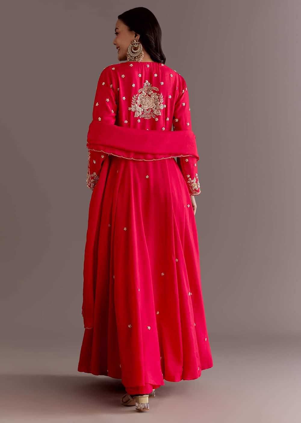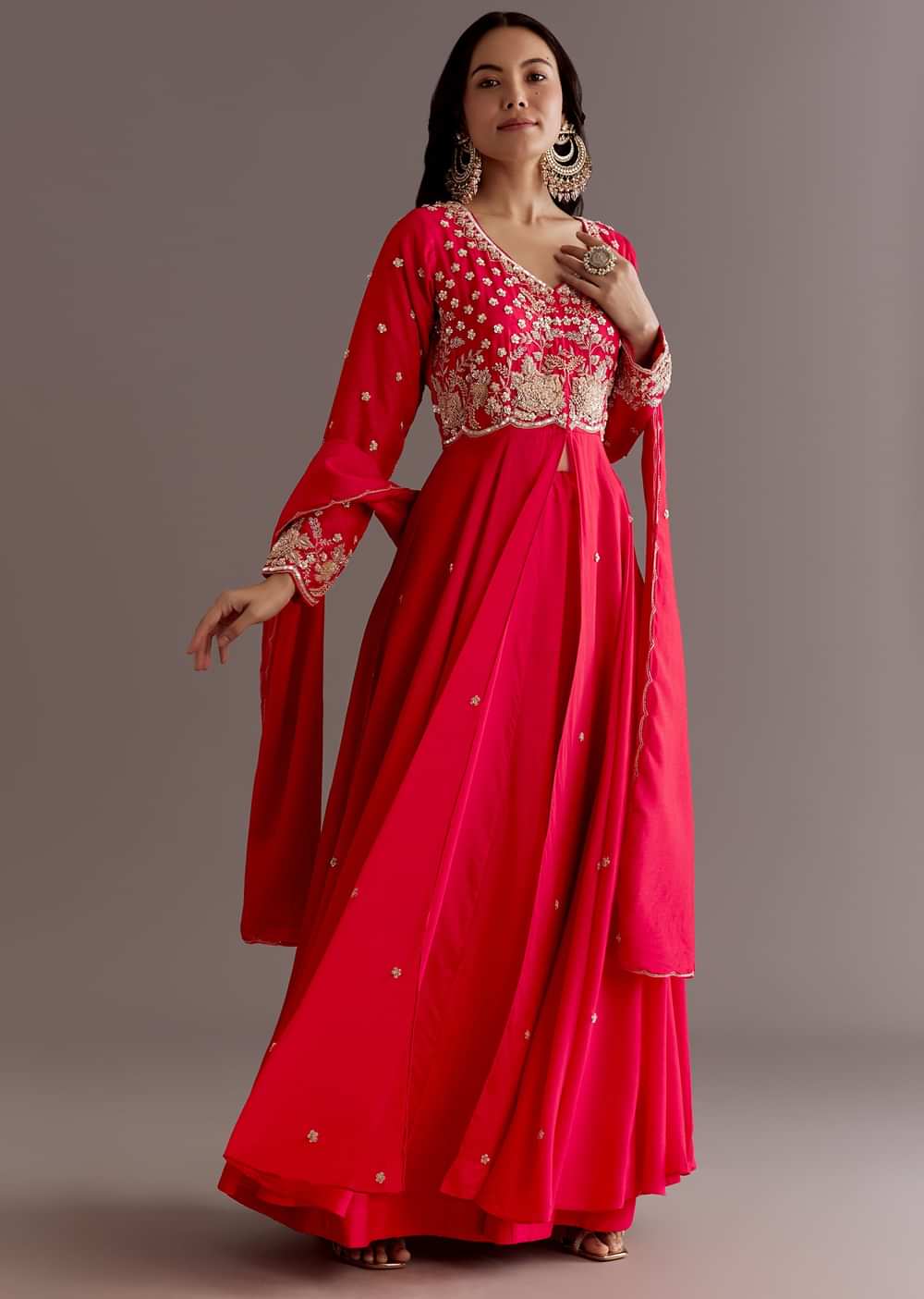 This fiery red kurta in Russian silk is illuminated with sequins, beads, and cut dana, opening at the front like a royal curtain to reveal a skirt with celebratory charm.... More Product Details