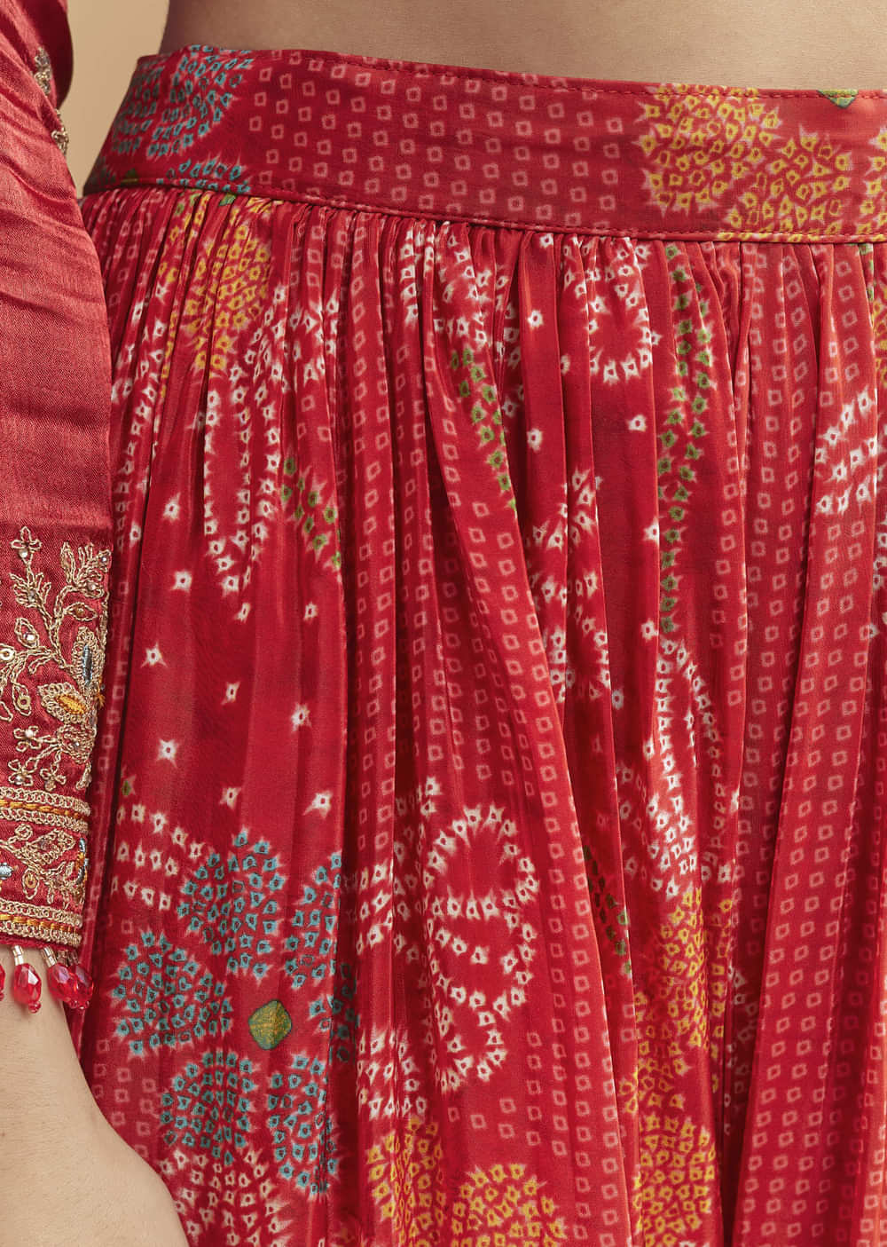 Evening-ready and rich, this red satin palazzo suit pairs satin sheen with detailed zari, resham, and cutdana on the kurta, finished with a bandhani print dupatta for heritage flair. The... More Product Details