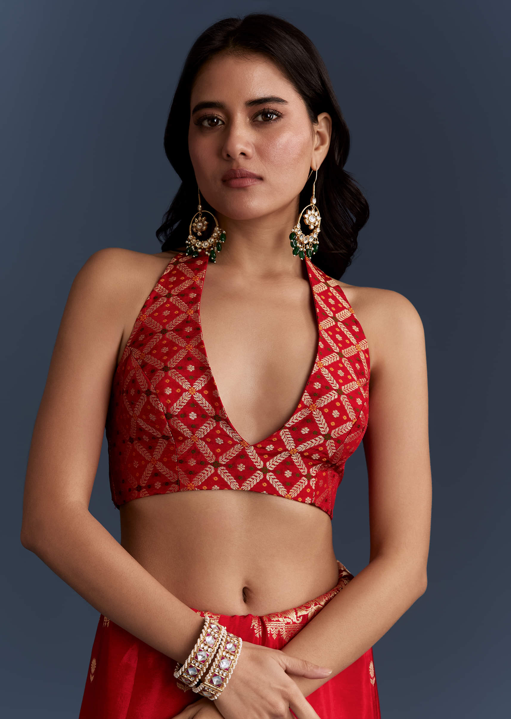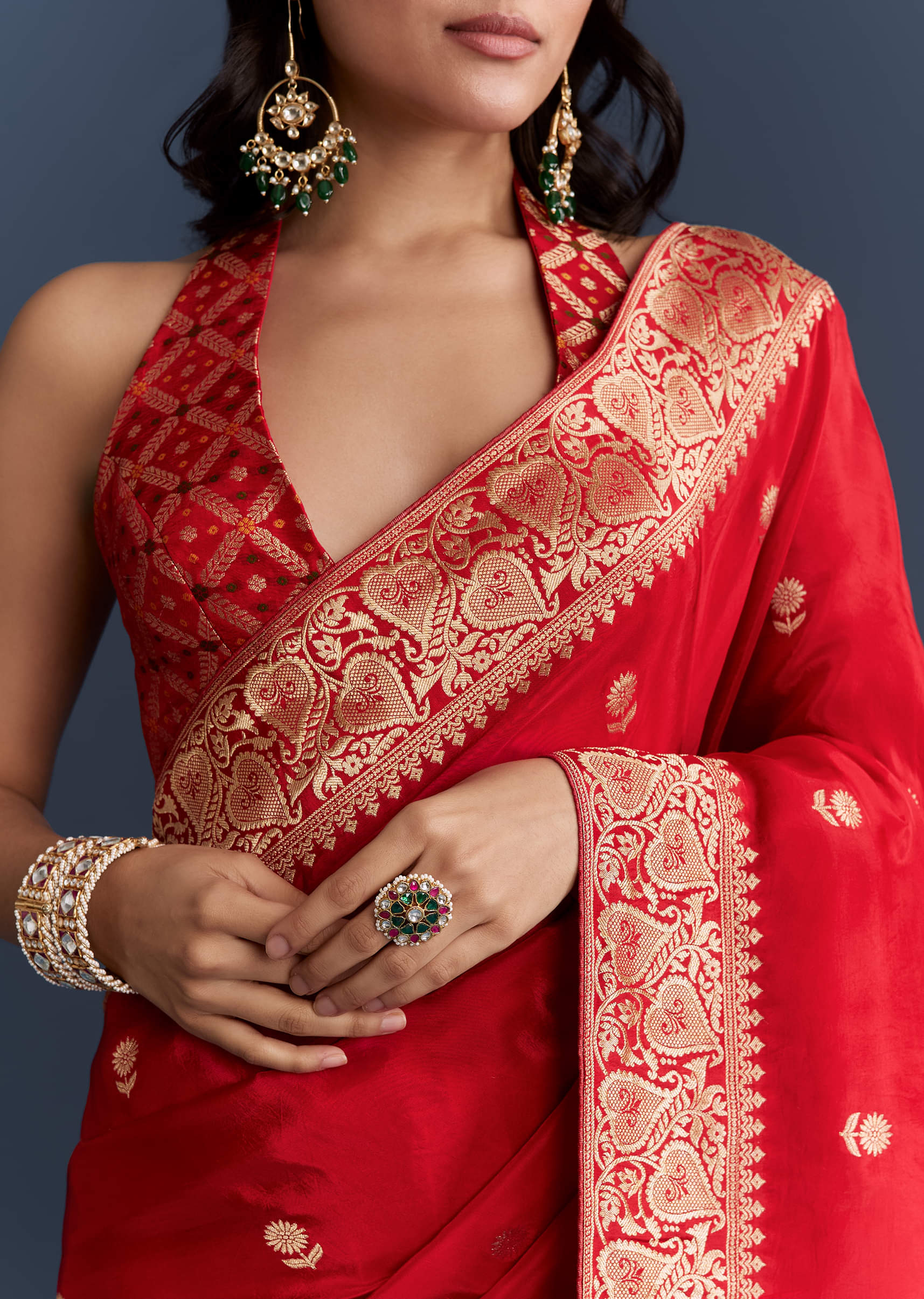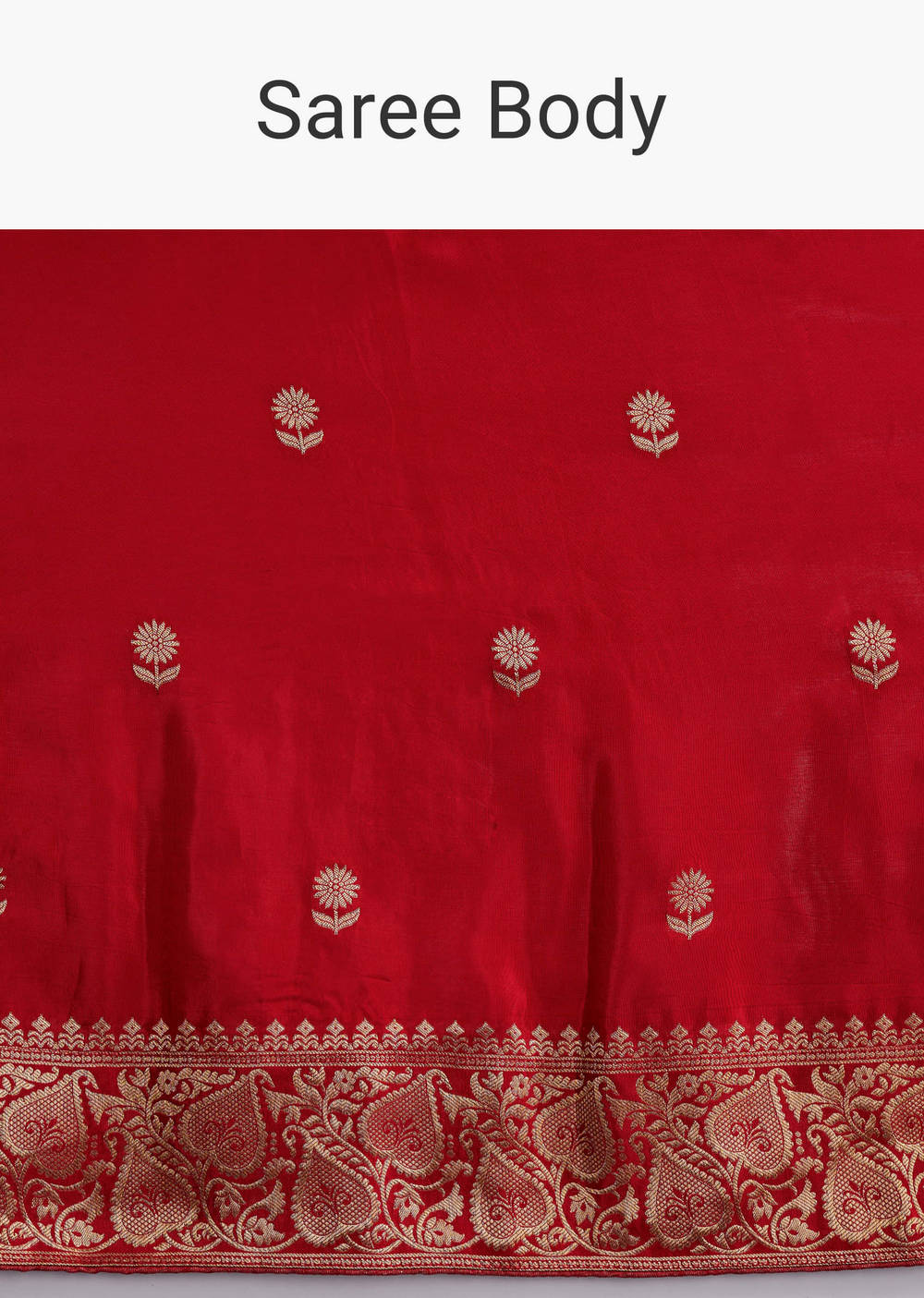 A touch softer in mood, this red satin woven saree frames the body with a floral-motif border and scatters small buttis for gentle texture. A brocade blouse fabric completes the... More Product Details