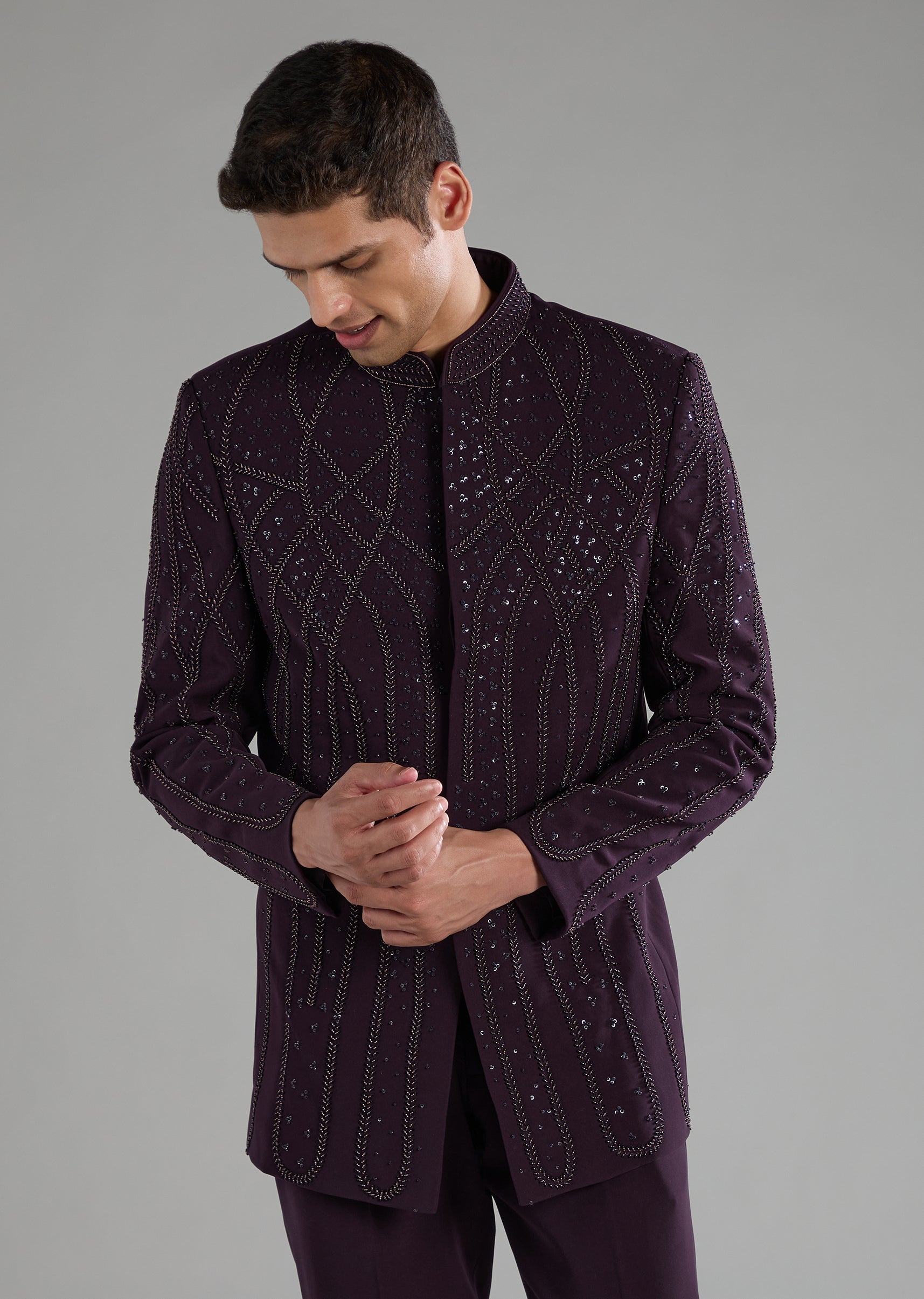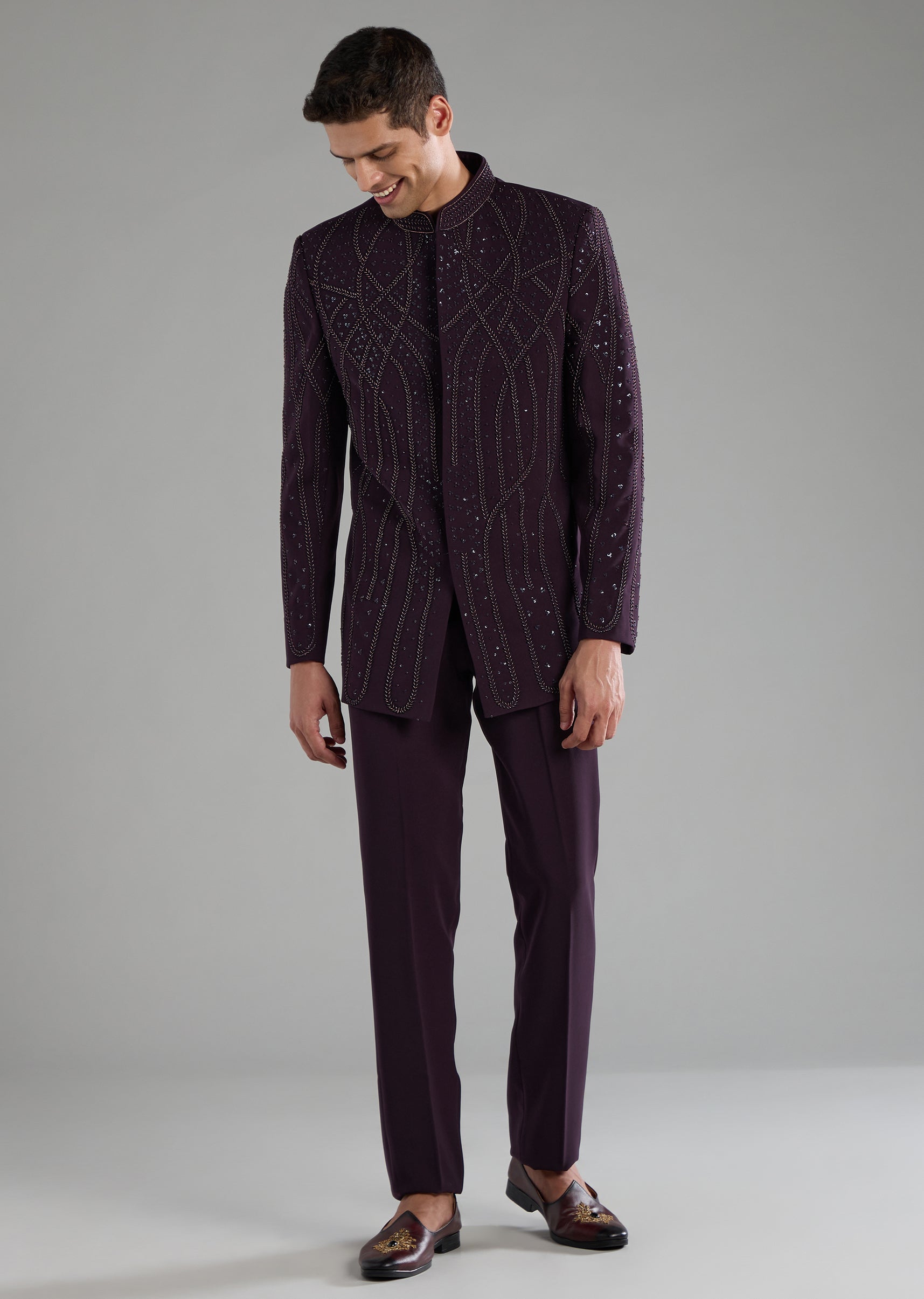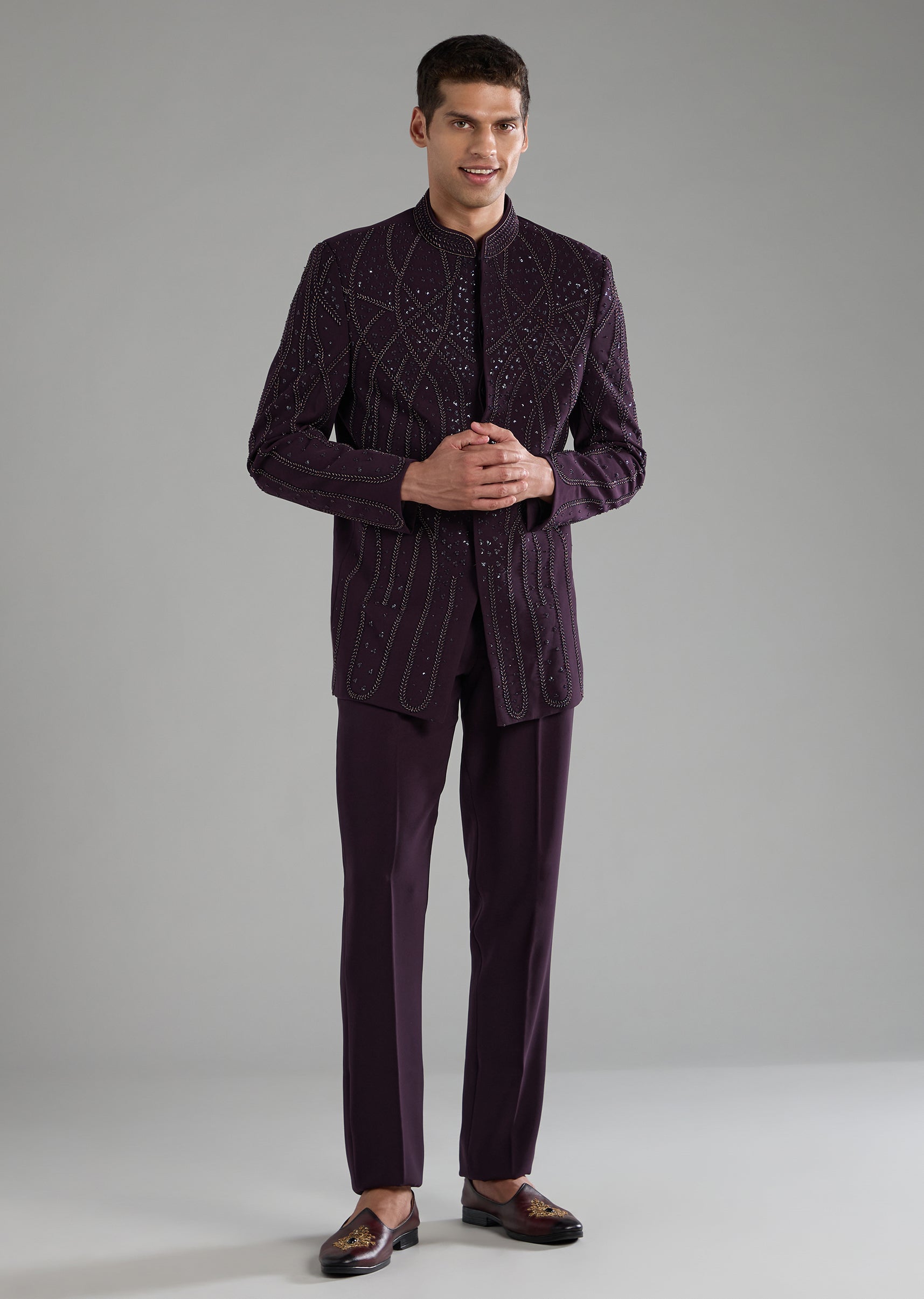 A touch of royal flair meets modern sparkle in this suiting fabric Jodhpuri set, enriched with resham thread, sequins, and bead highlights. The structured mandarin collar and refined button detailing bring polished sophistication, while the tailored pants complete a regal yet contemporary silhouette. Ideal for celebrations where you want understated glamour with a suave edge. Awarded as the Most Trusted Brand, we're delivering styles you love, just as promised.