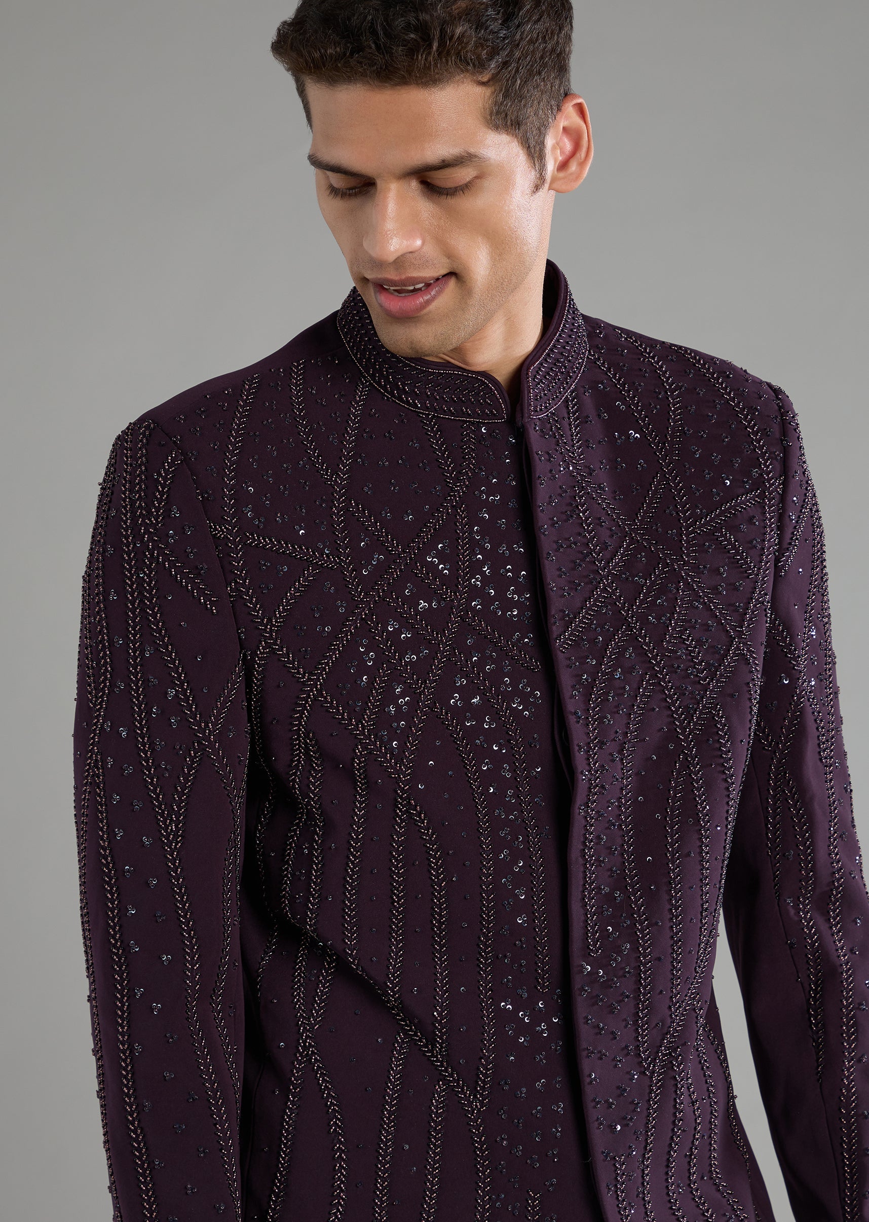 A touch of royal flair meets modern sparkle in this suiting fabric Jodhpuri set, enriched with resham thread, sequins, and bead highlights. The structured mandarin collar and refined button detailing... More Product Details