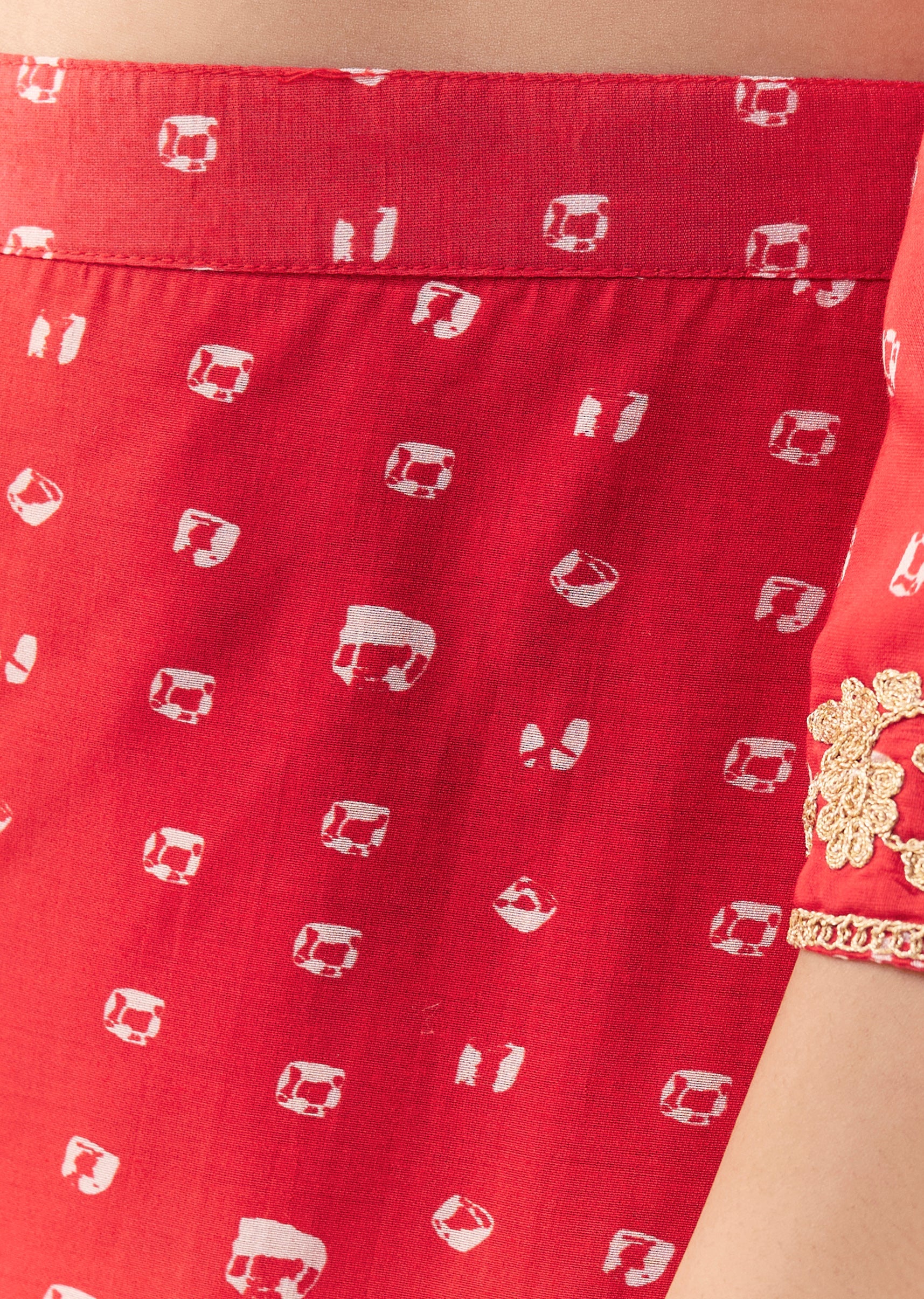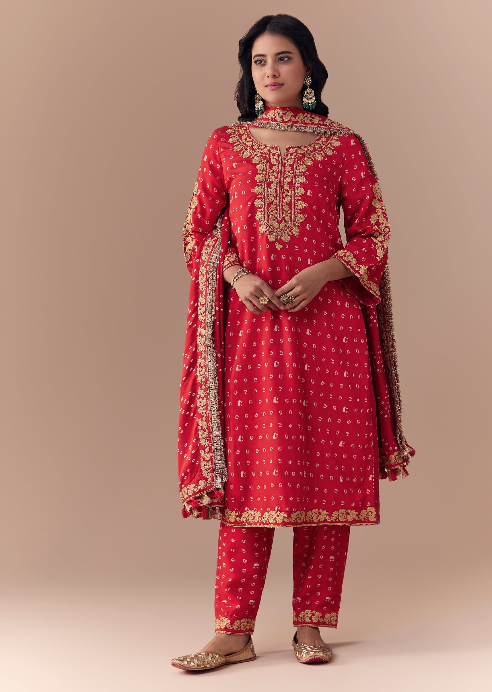 Bandhani’s playful patterns meet shimmering zari thread work in this kurta, creating a vibrant, joyful look perfect for festive celebrations. The red silk pant and dupatta add a regal sheen,... More Product Details