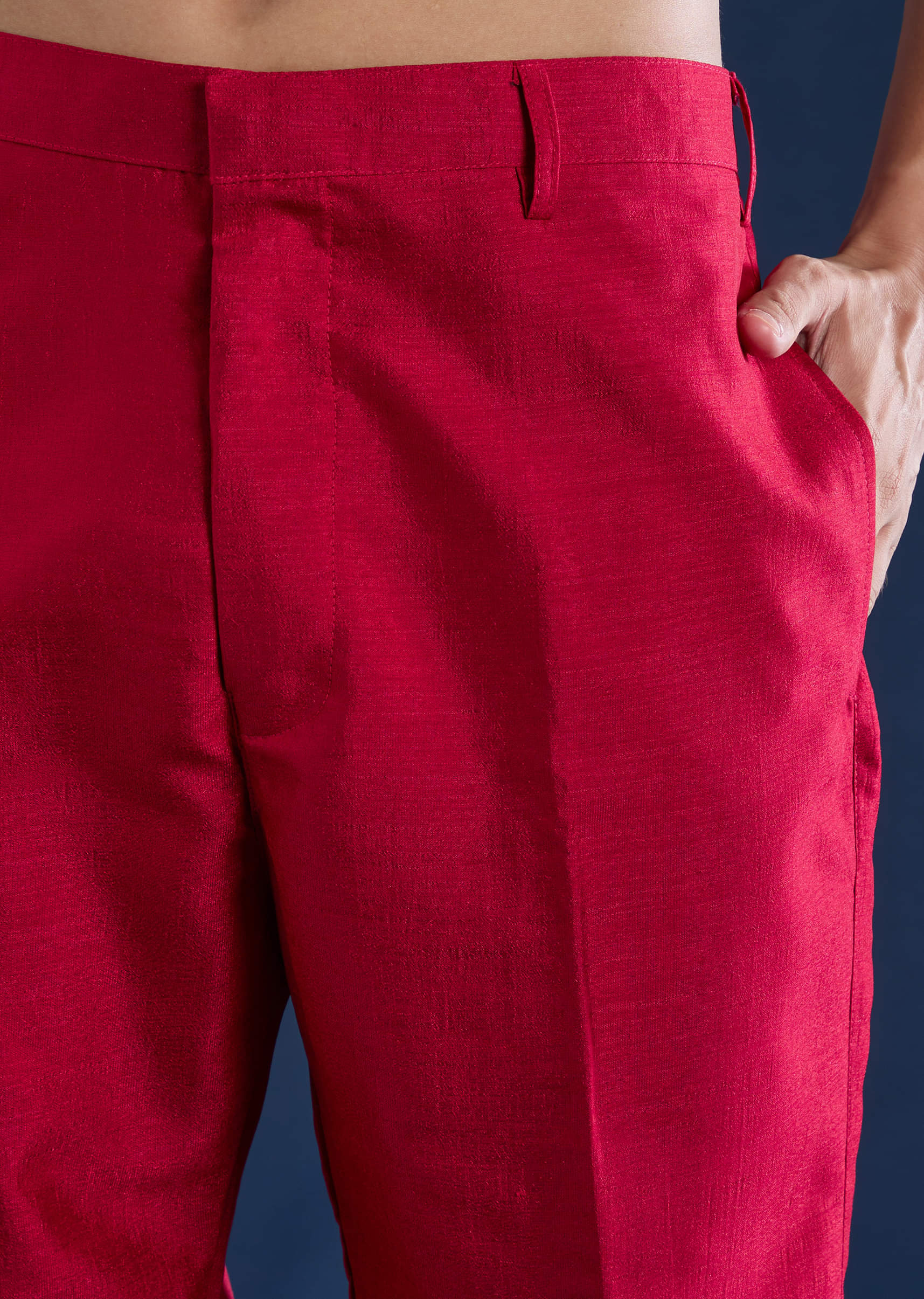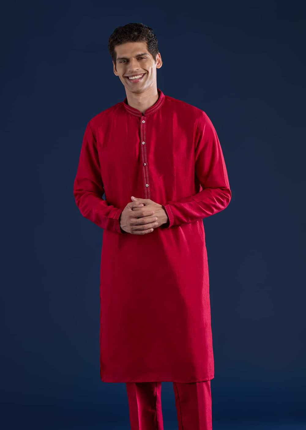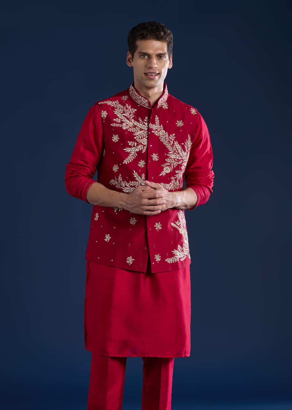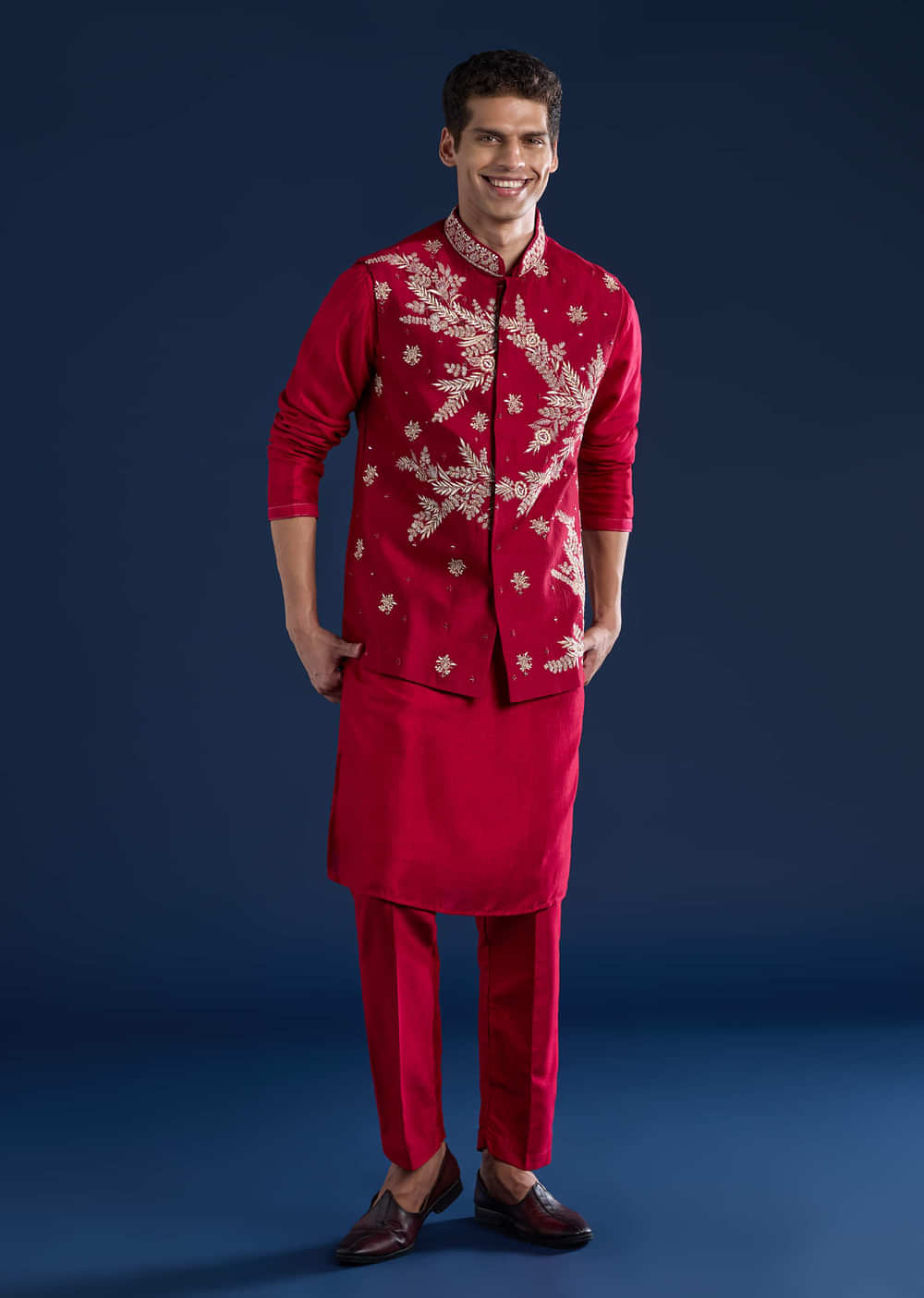 Bold yet refined, this red silk kurta and jacket set celebrates the spirit of festivity with its intricate mirror embellishments and rich sheen. The luminous silk fabric enhances the vibrancy of the hue, while the detailed craftsmanship lends an air of regal sophistication. Ideal for grand celebrations, it strikes a flawless balance between traditional artistry and modern elegance. Awarded as the Most Trusted Brand, we're delivering styles you love, just as promised.