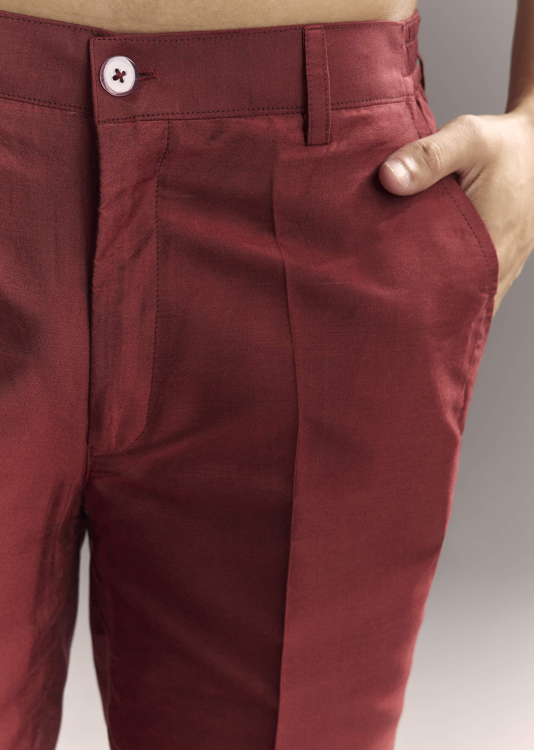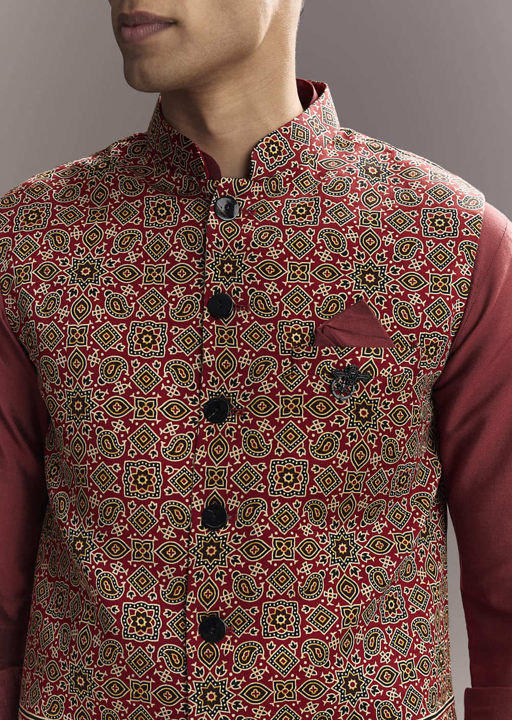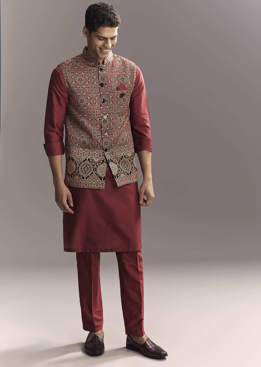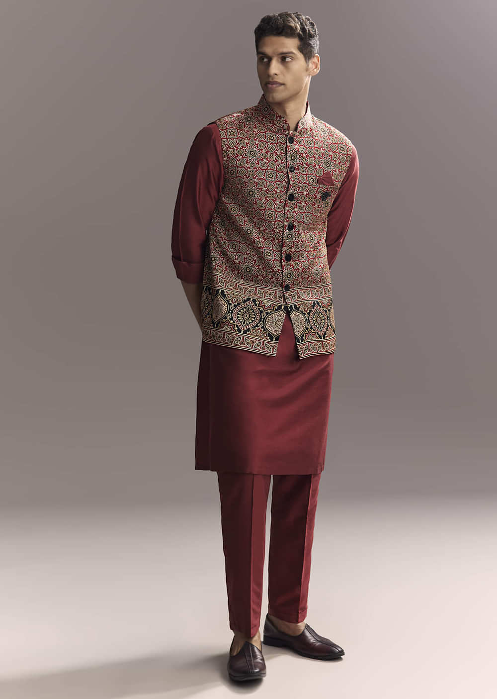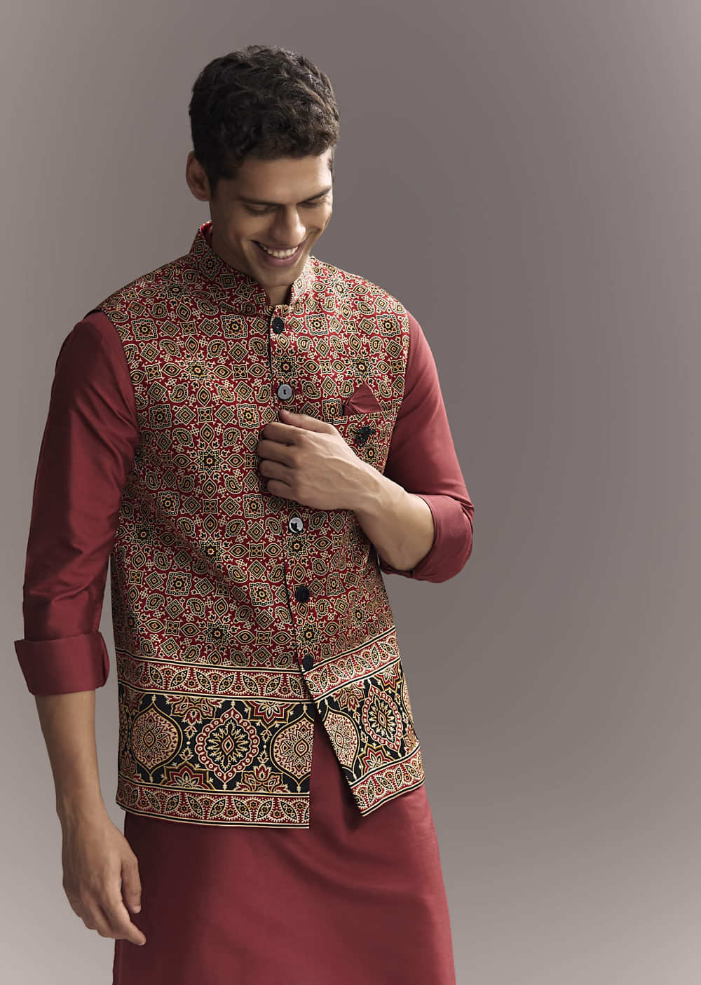 Red Silk Kurta Jacket Set For Men With Hand Block Ajrakh Print