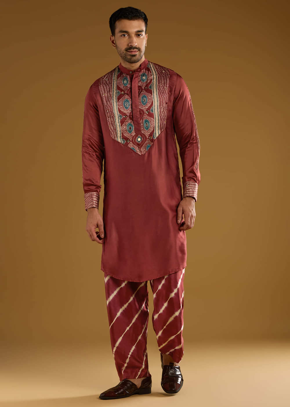 Red Silk Kurta Set For Men With Hand Dyed Leheriya Print