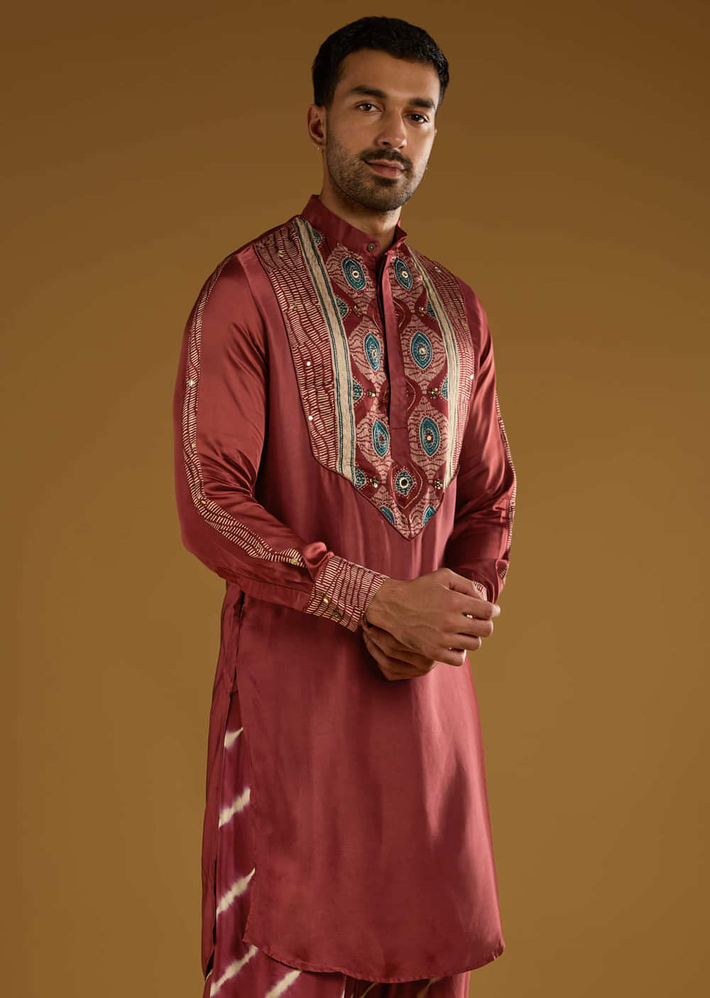 Colour and craft align as this red silk men’s kurta set teams a handmade ajrakh print kurta with leheriya print pants for movement and depth. The pairing photographs beautifully from... More Product Details