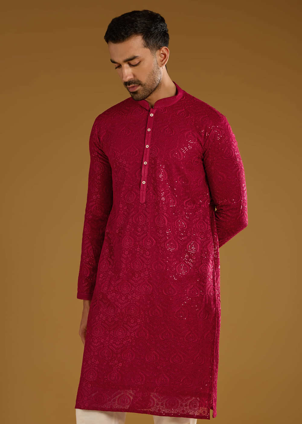 For festive sparkle, this red men’s kurta set in art silk blends sequins with resham work to build refined texture across the front. The surface reads polished in daylight and lively under warm bulbs. You arrive bright, celebratory, and perfectly pitched for pooja and haldi. Awarded as the Most Trusted Brand, we're delivering styles you love, just as promised.