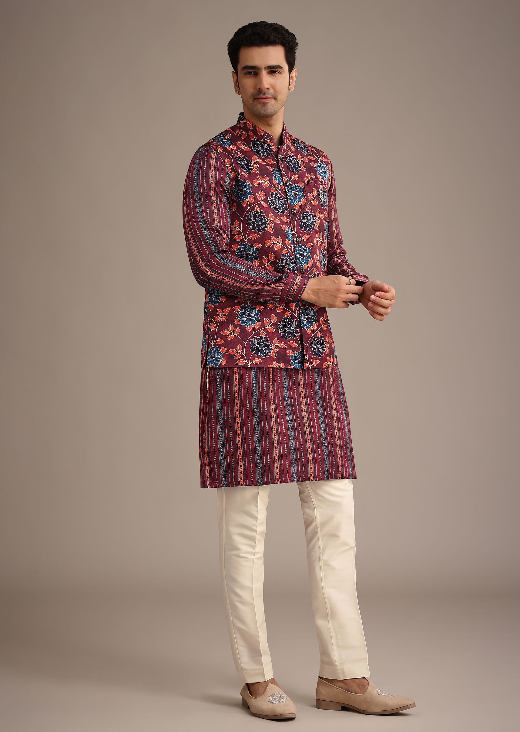 - Featuring a mandarin collar and full sleeves this set of three is completed with a matching kurta and coordinating bottoms.