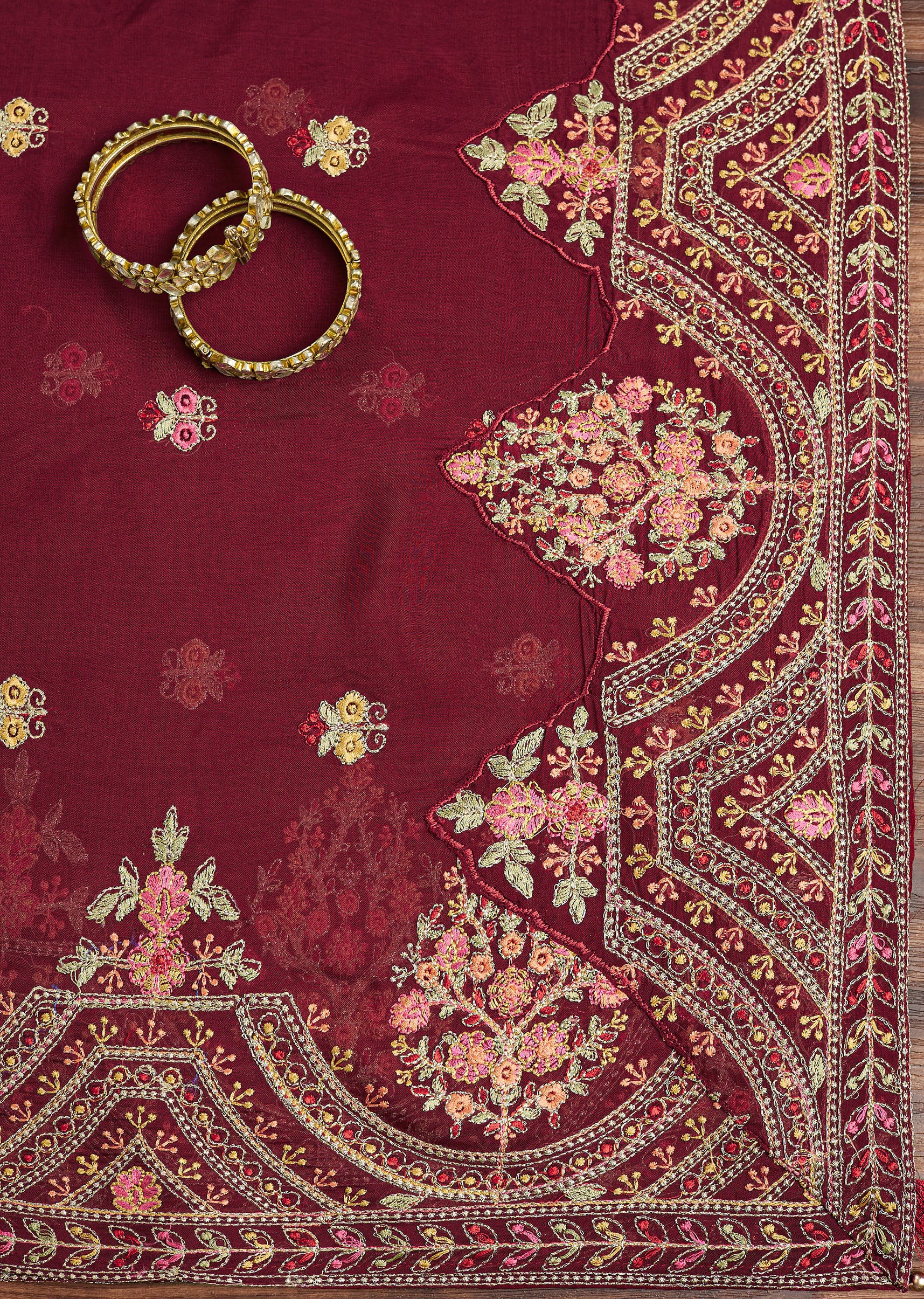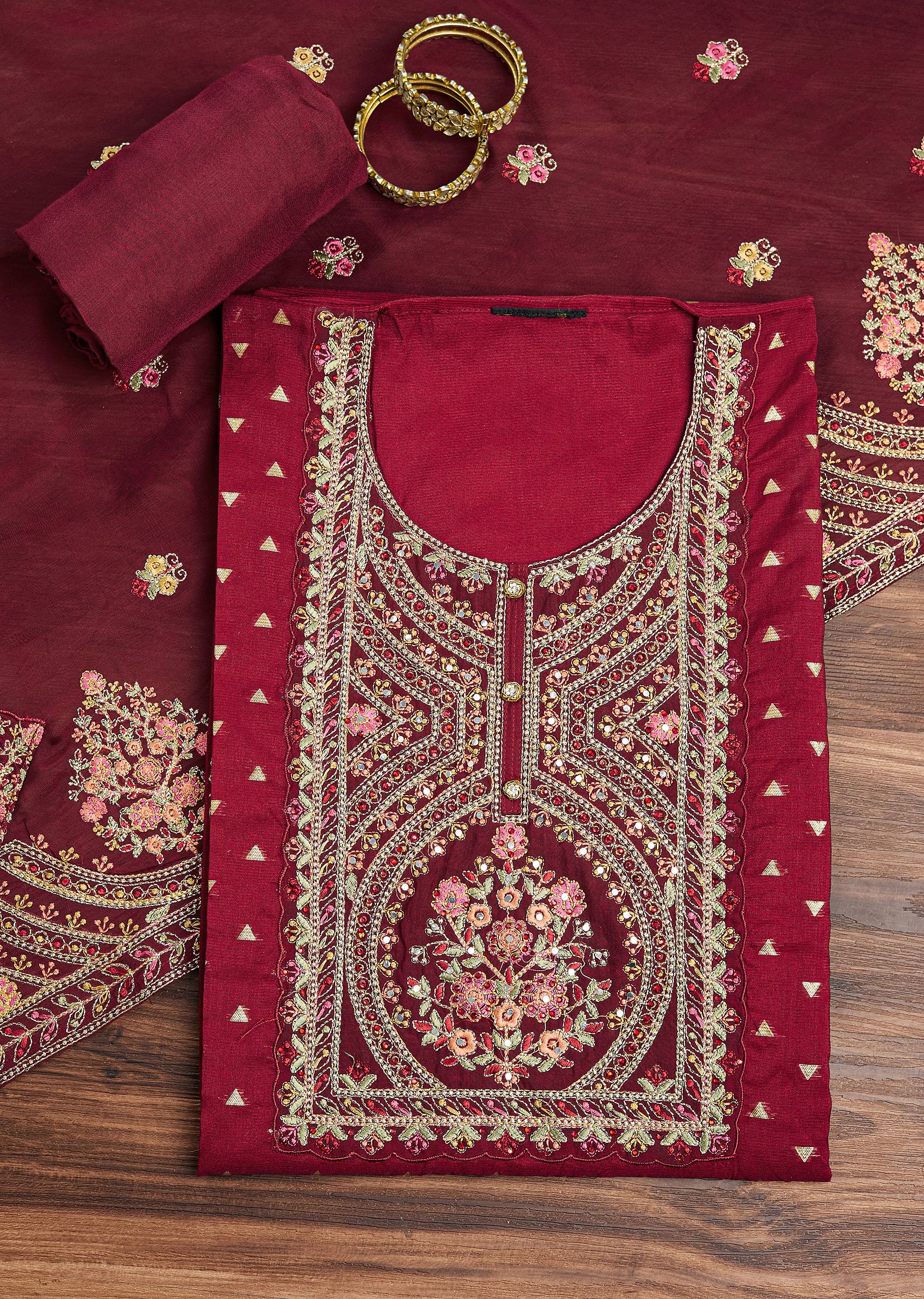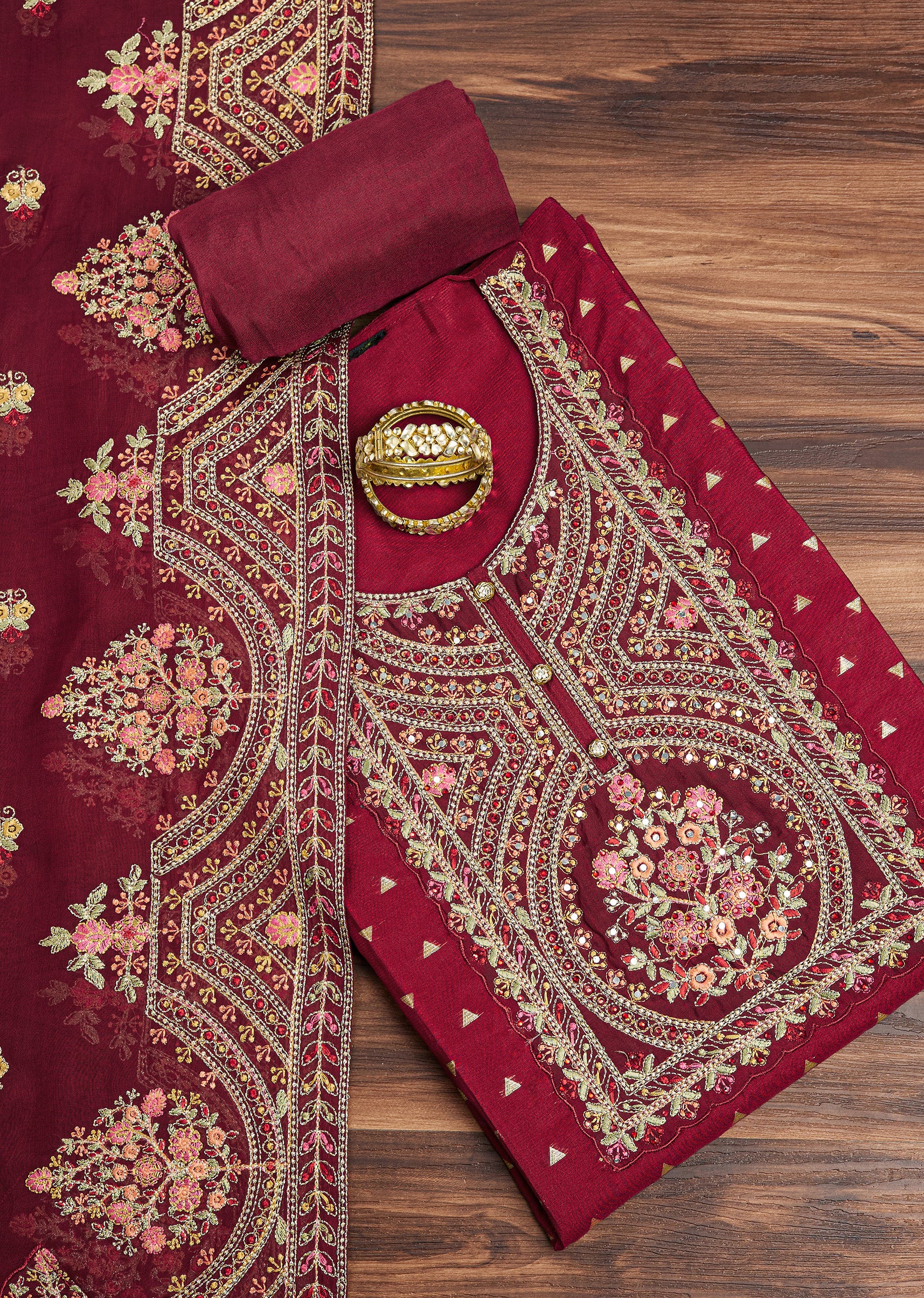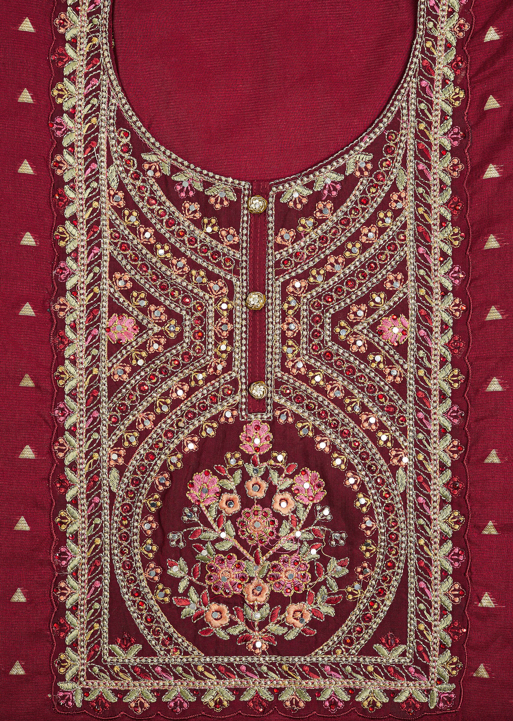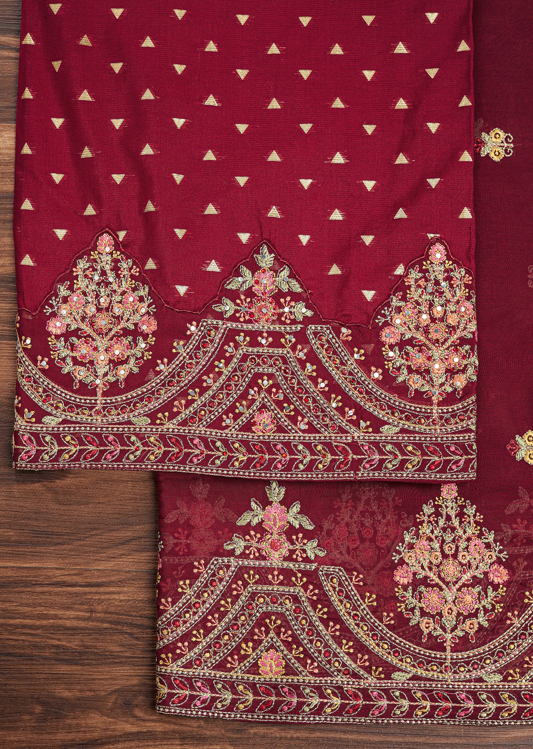An exquisite blend of tradition and grandeur, this tissue unstitched suit set is a masterpiece of intricate craftsmanship. The kurta fabric is adorned with resham embroidery, sequins, and zari, forming mesmerizing floral and geometric patterns. The matching dupatta enhances its opulence with delicate threadwork and shimmering accents, while the rich maroon bottom fabric completes the ensemble. Perfect for weddings and festive occasions, this set is a celebration of heritage elegance. Awarded as the Most Trusted Brand, we're delivering styles you love, just as promised.