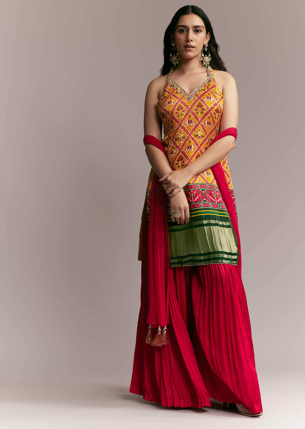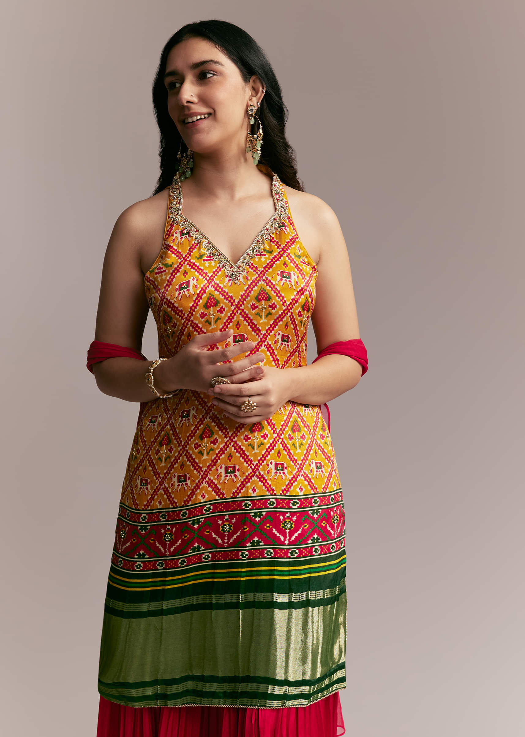 Flaunting traditional patola print in a halter-style silhouette, this sleeveless modal satin kurta and red palazzo duo is a head-turner. It’s festive flair meets effortless finesse. Awarded as the Most... More Product Details