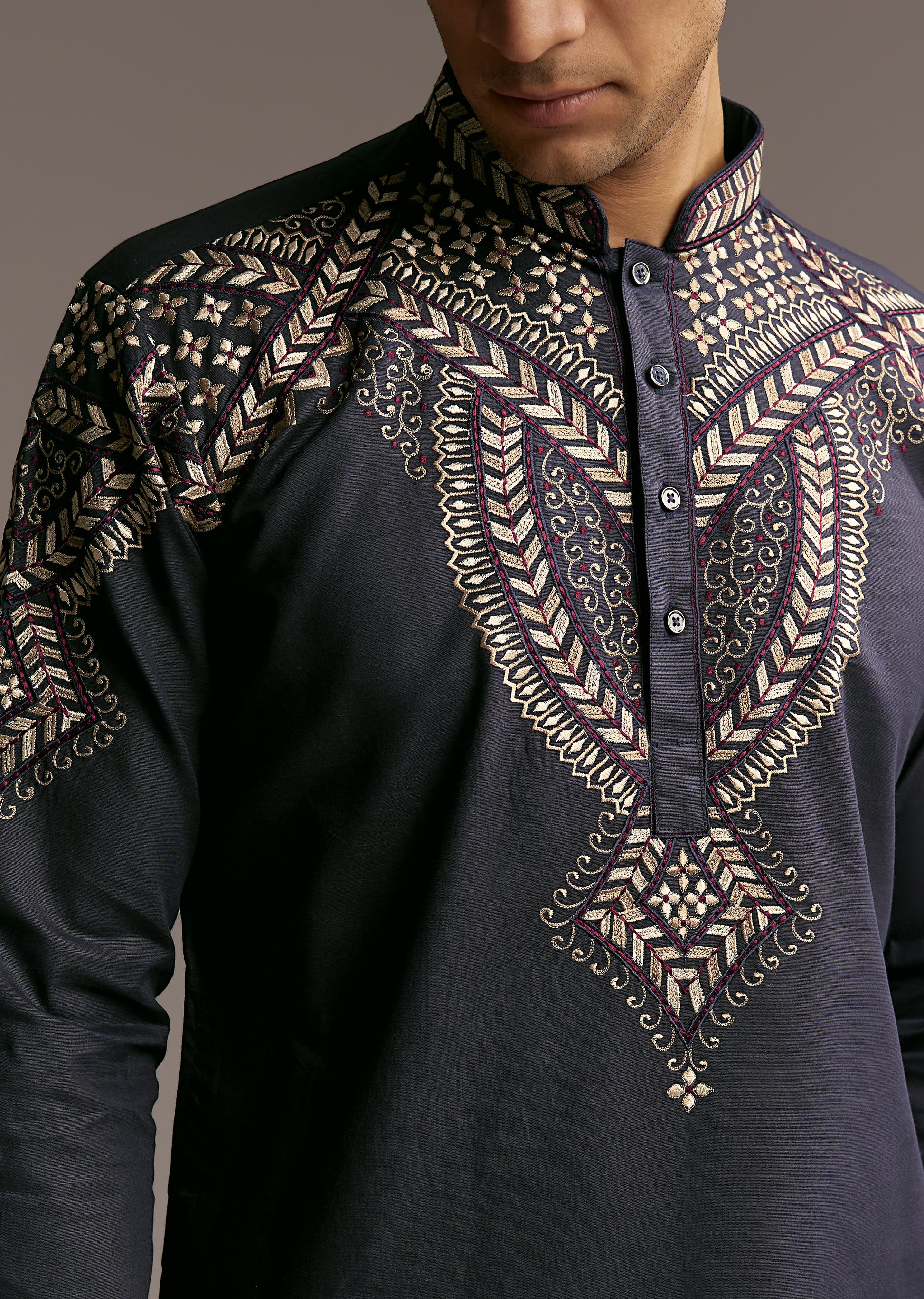 Lightweight and sophisticated, this blue linen kurta set with resham embroidery is ideal for day weddings and relaxed festive celebrations, offering comfort with style.