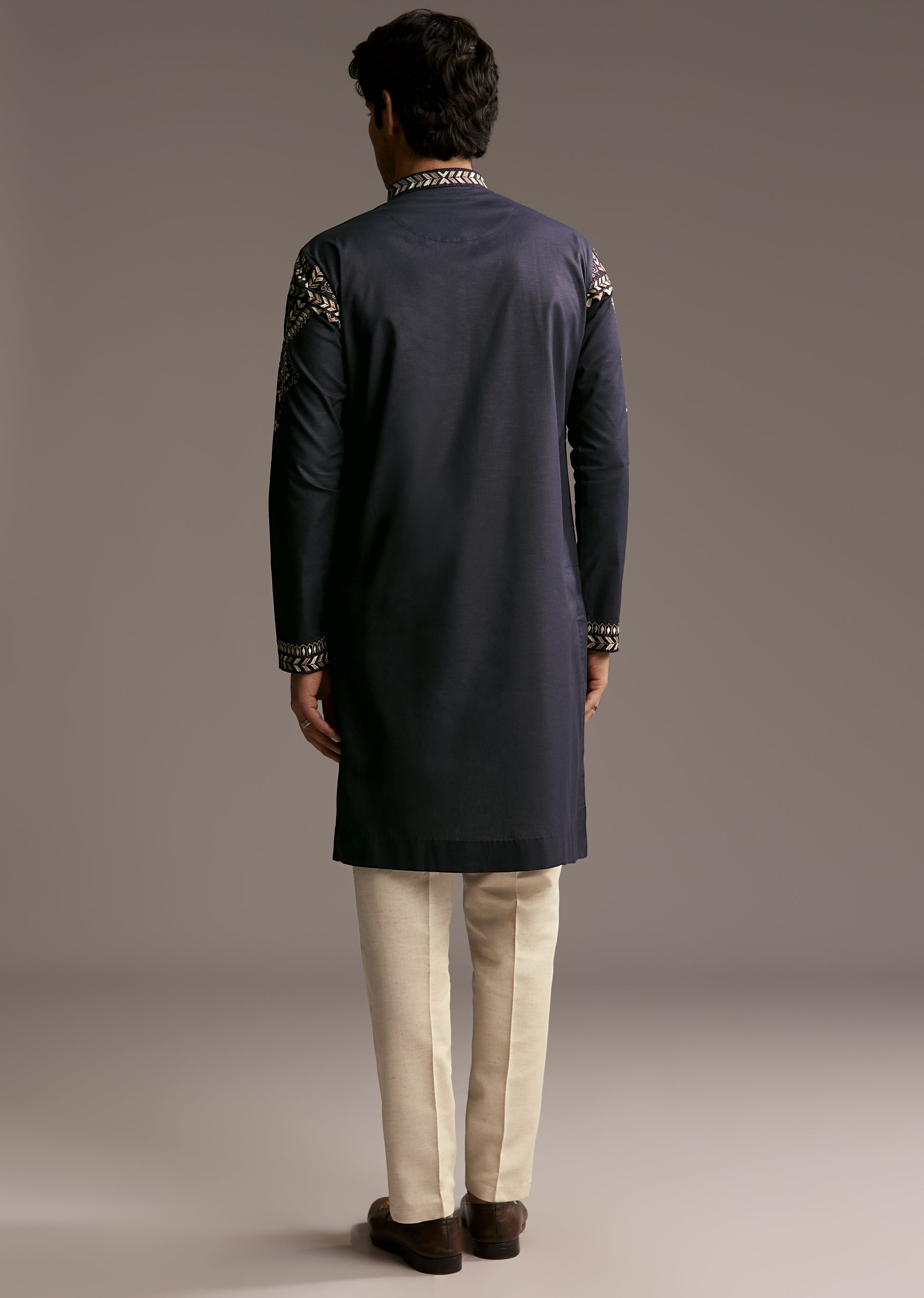 Refined Navy Harmony Couple Set – Navy Blue Georgette Saree with Resham Thread and Cutdana Embroidery for Her And Blue Linen Kurta Set with Resham Embroidery for Him