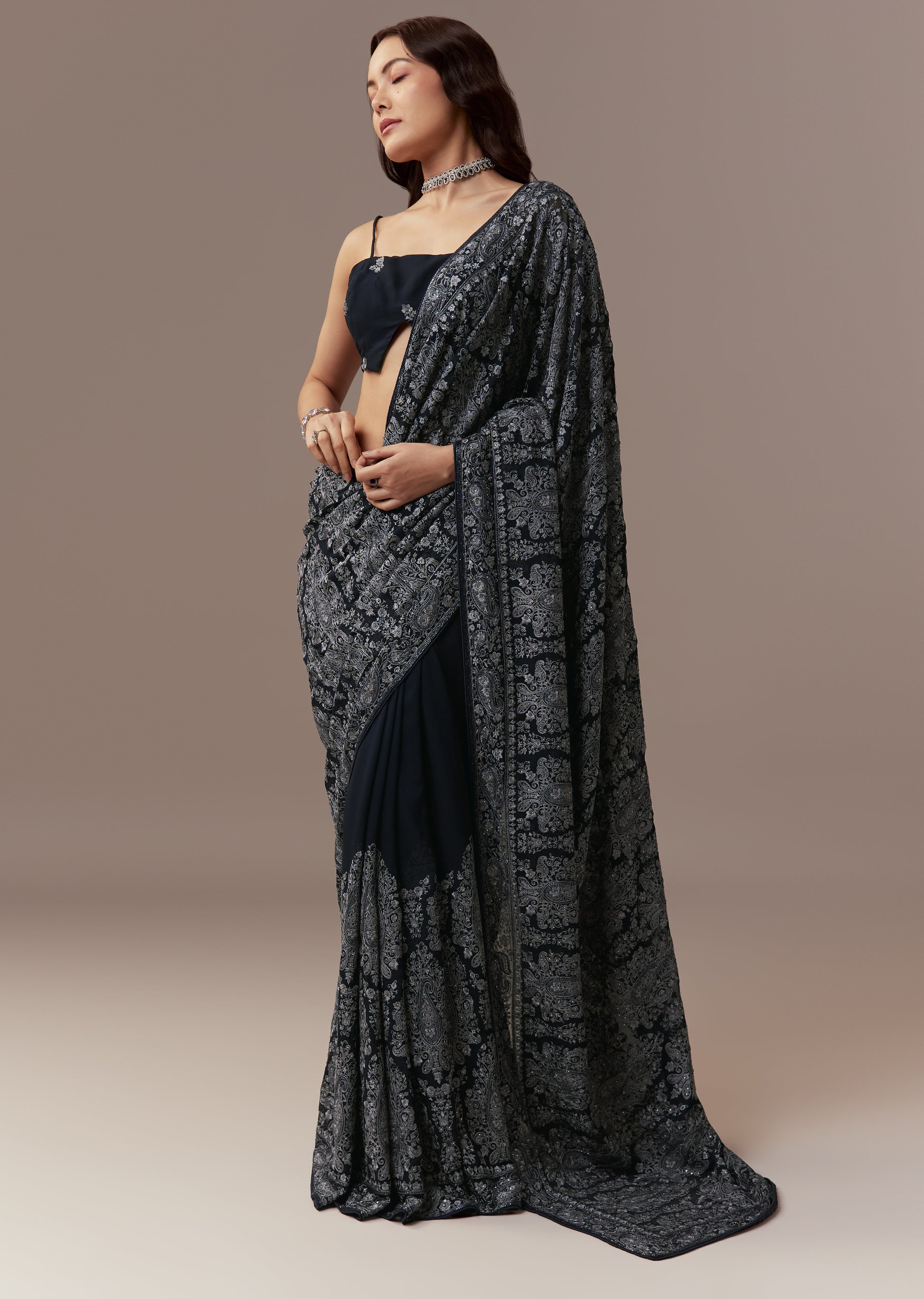 Elegant and contemporary, this navy blue georgette saree features resham thread and cutdana embroidery for subtle sparkle. A refined choice for evening weddings and festive occasions.