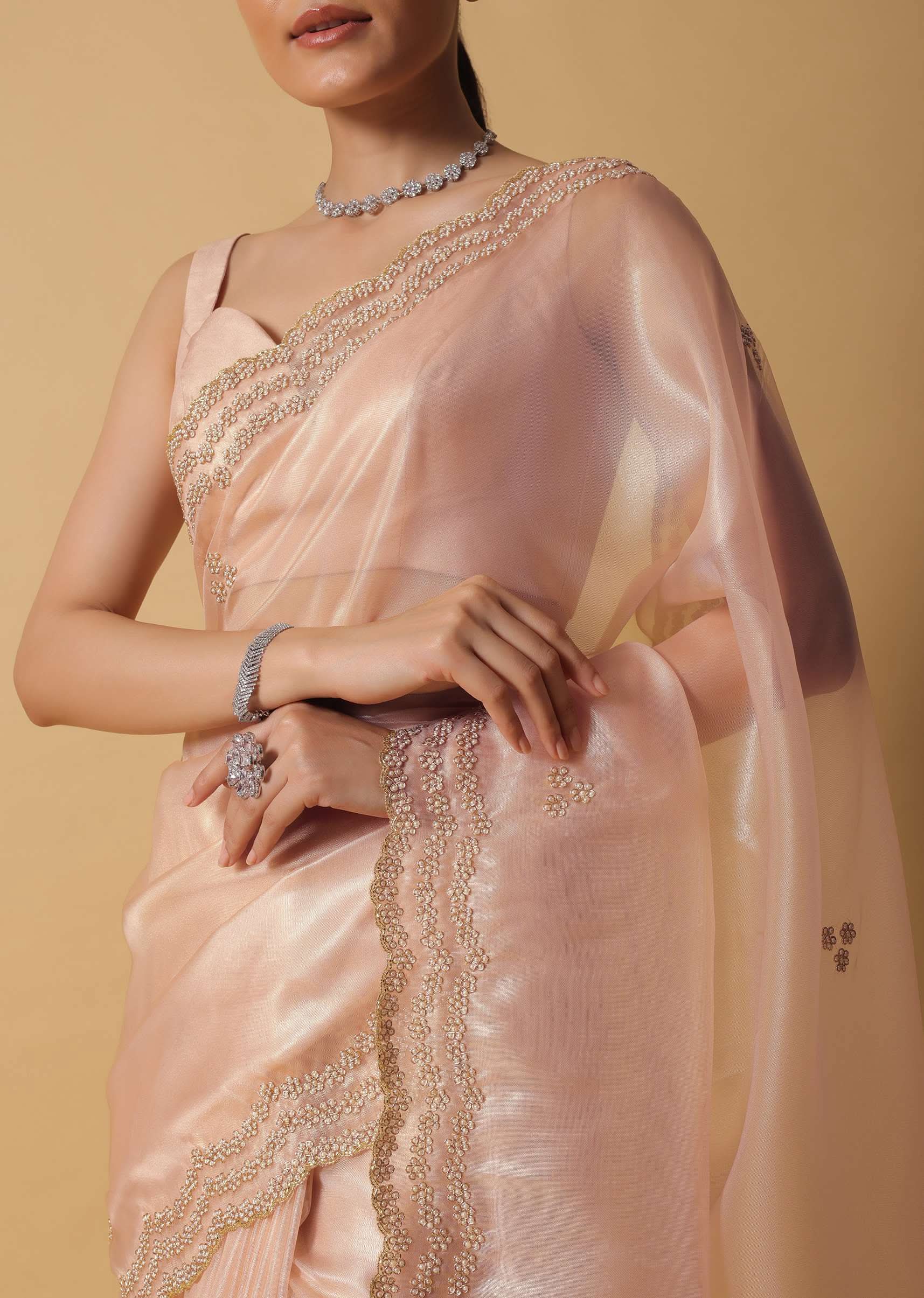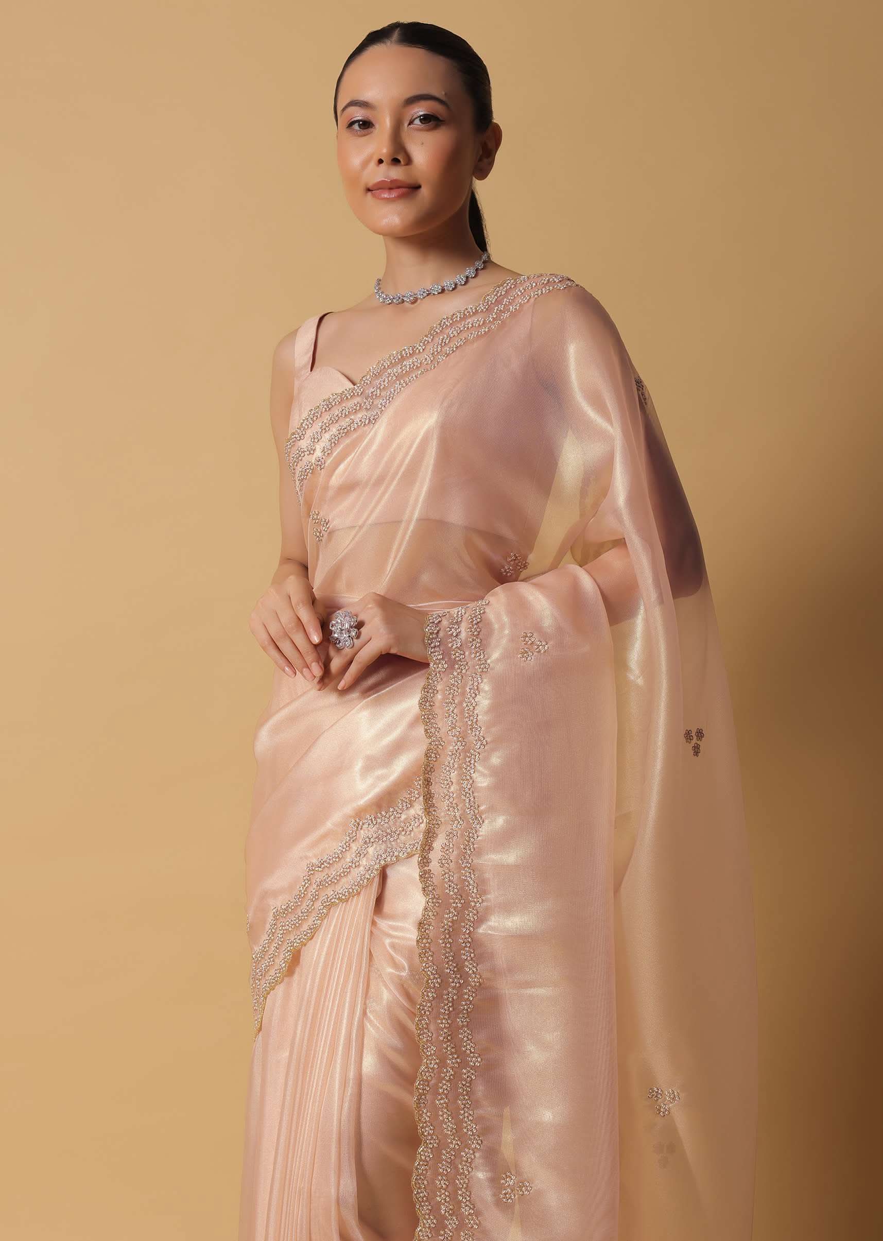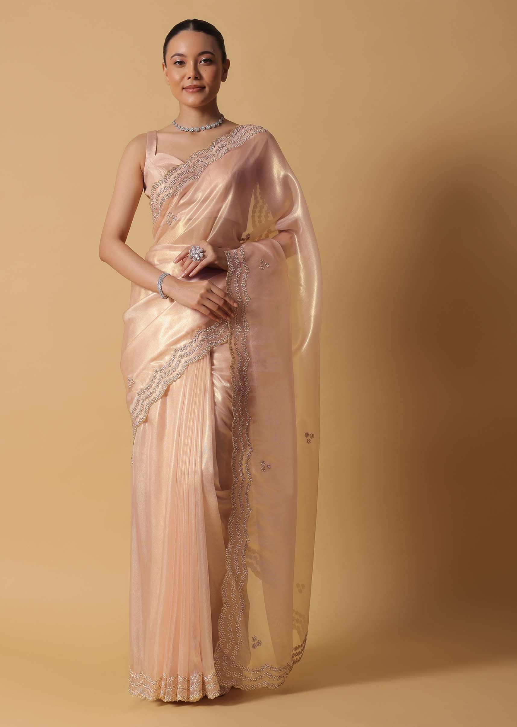 Rose Gold Toned Foil Saree In Tissue With Cut Dana Embroidered Borders