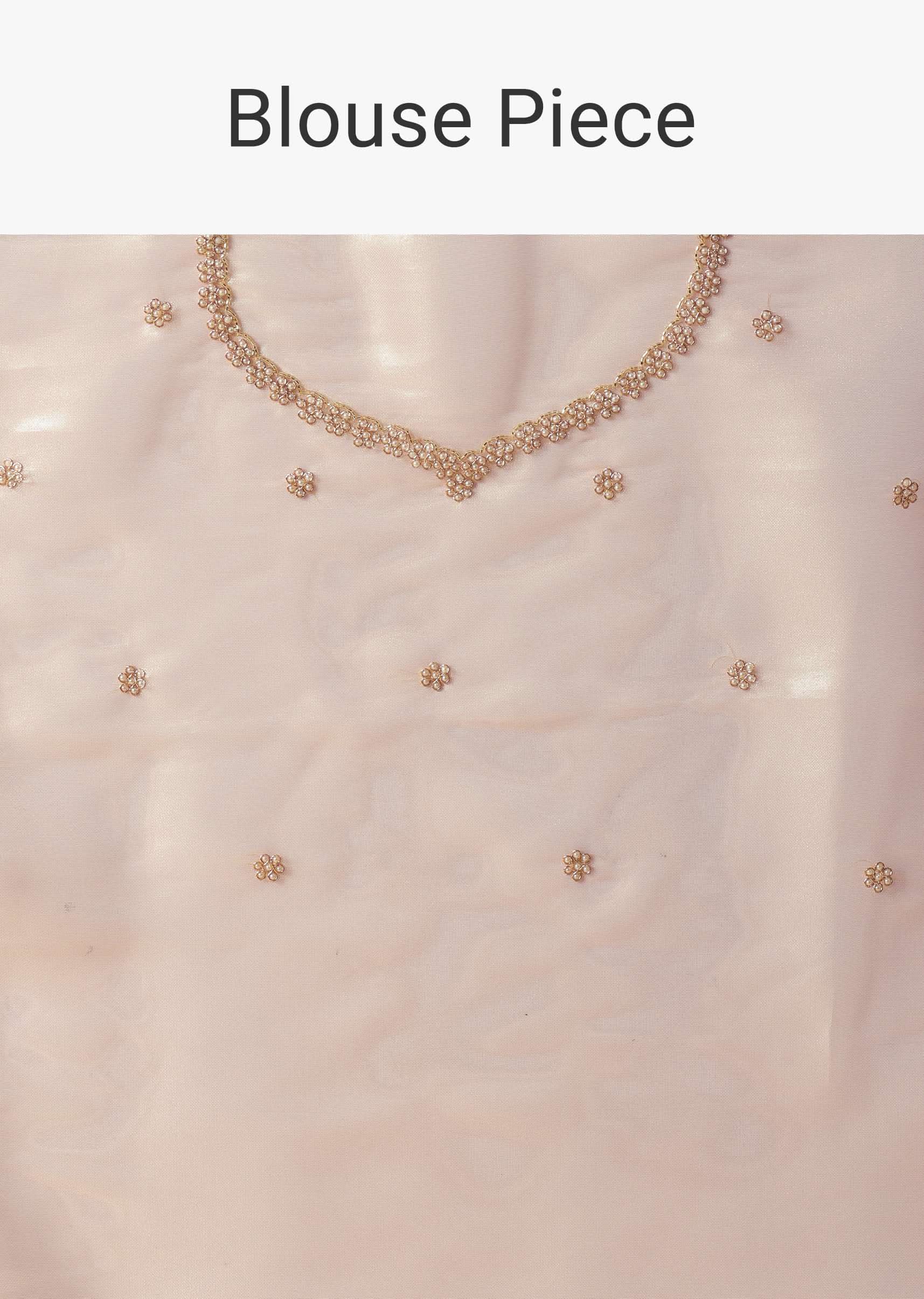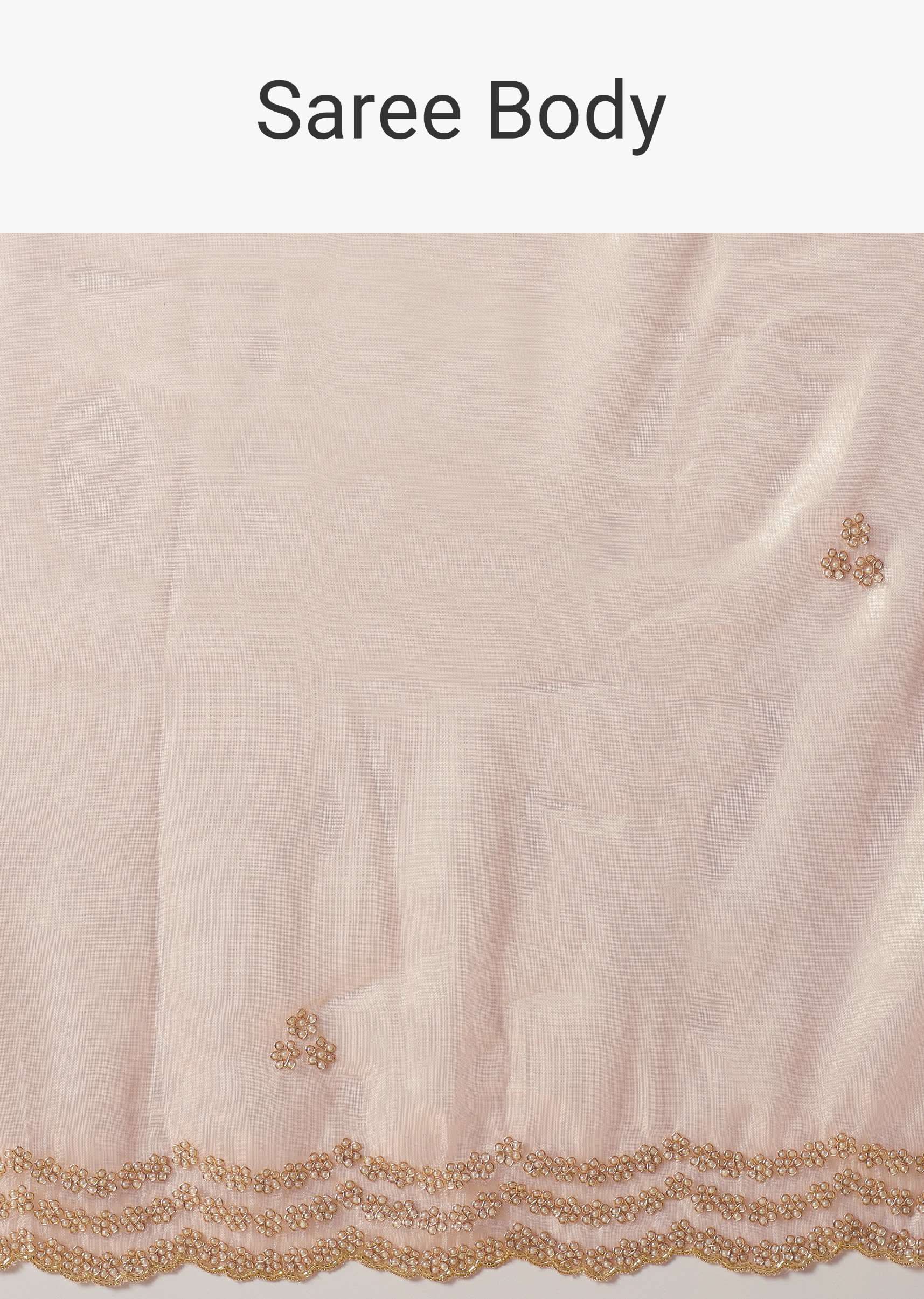 - The intricate pearl and cut dana embroidery border work adds a touch of regal charm, enhancing the overall allure of the saree.
