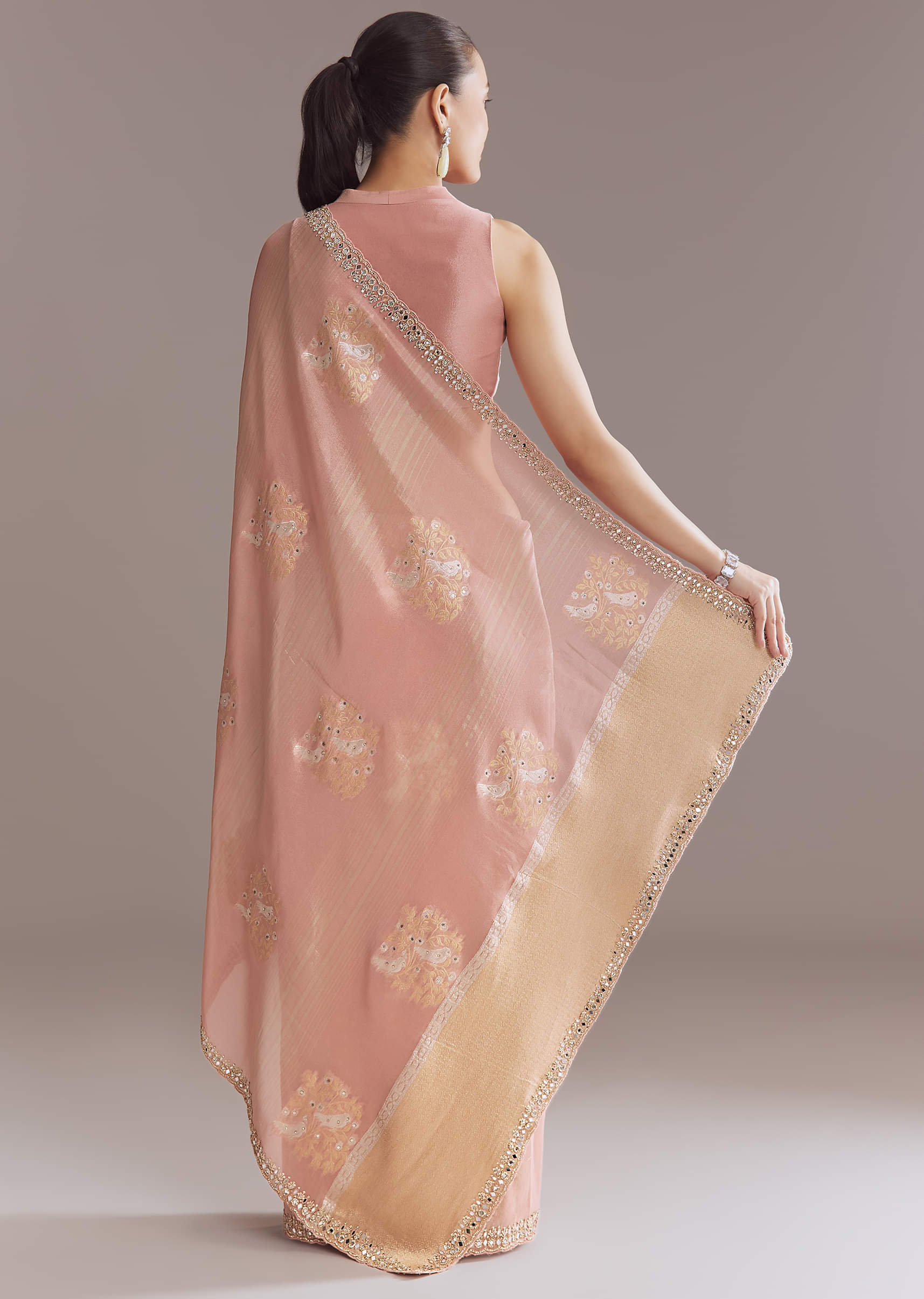 Rose Pink Tissue Saree With Zardosi And Mirror Embroidery