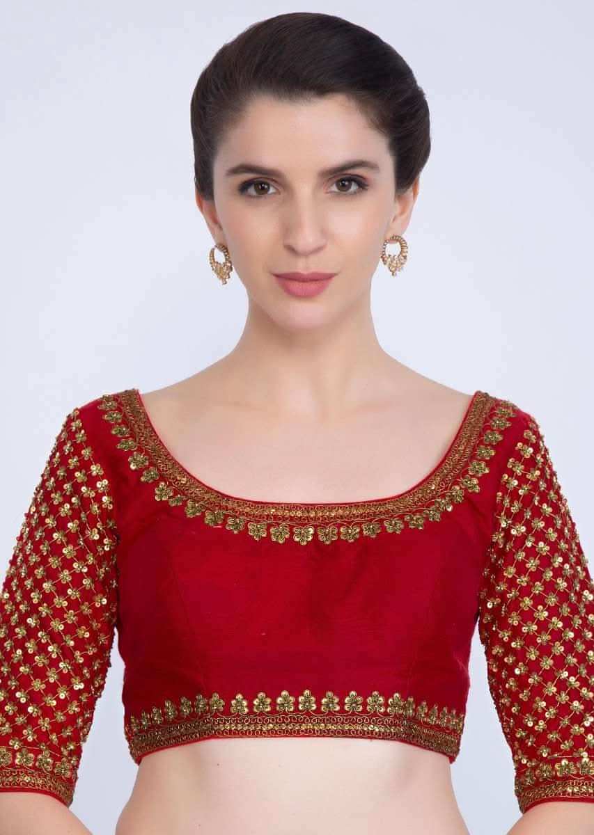 Red Blouse In Raw Silk With Jaal Embroidered Sleeves And Round Neck